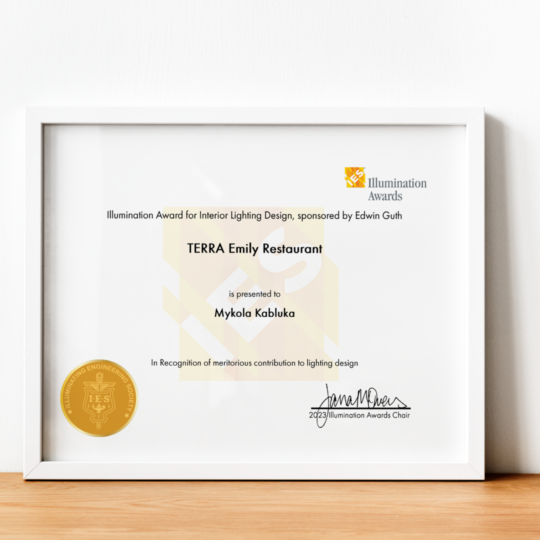 We sincerely congratulate the entire team of the client, Grigory Kozlovsky, and the YOD Group team led by Vladimir Nepyvoda and Dmitry Bonesko, the team of architects 5F Studio led by Andrey Ignatyuk, on the pleasant award of the Terra restaurant in the Emily Resort - sport, medical, entertainment hotel competition in the oldest and most important IES ILLUMINATION AWARDS!