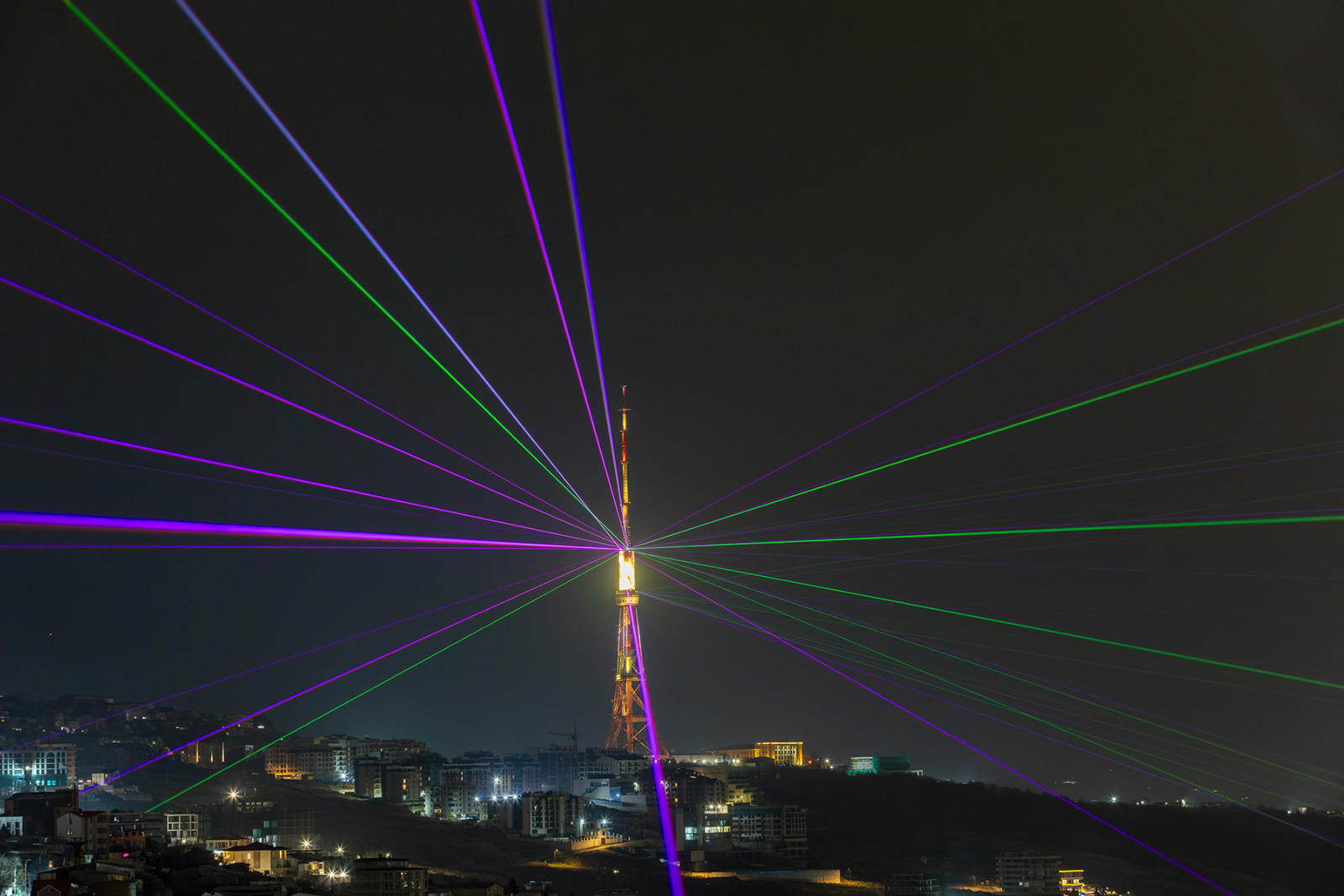 3. The TV tower and lasers respond with light.