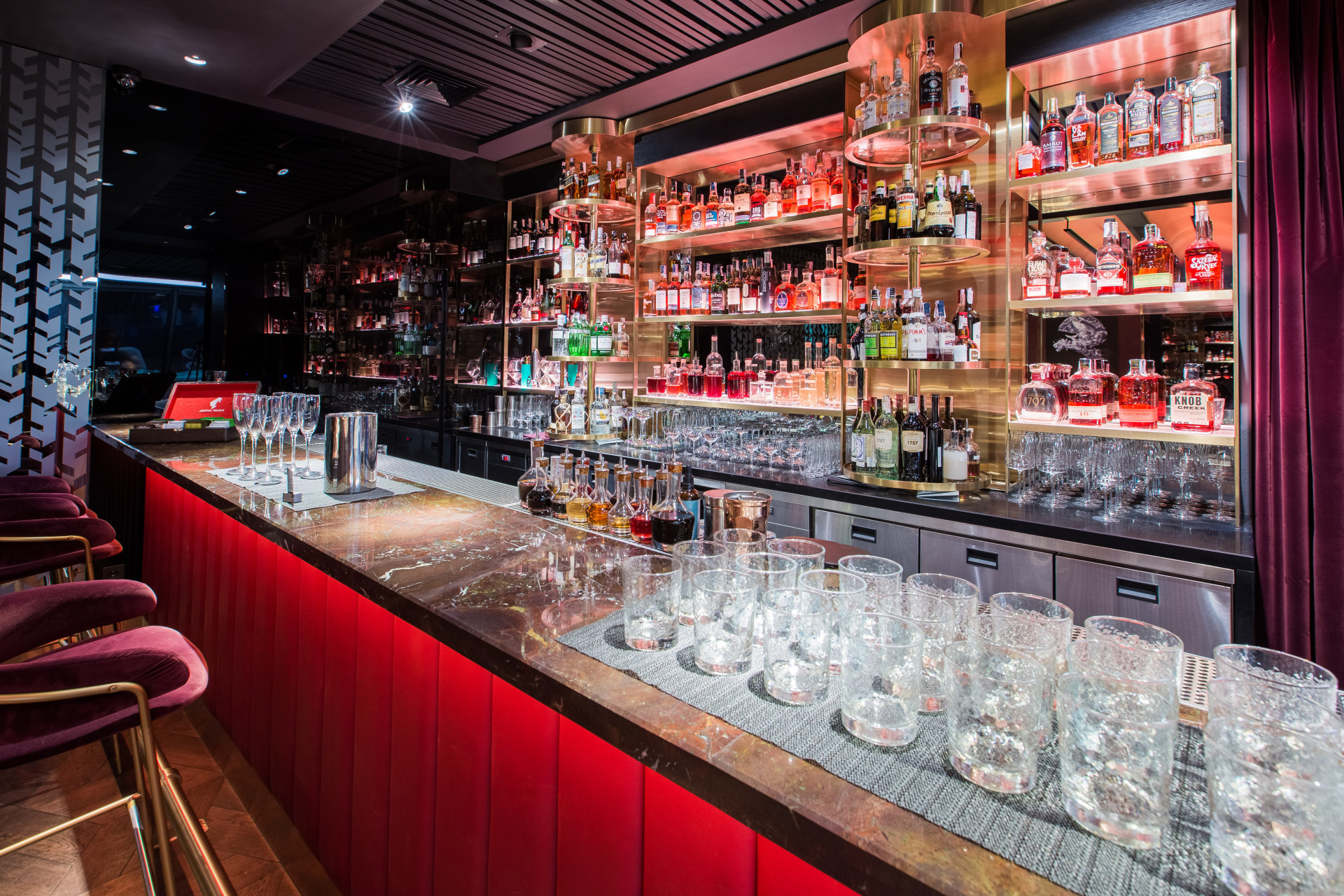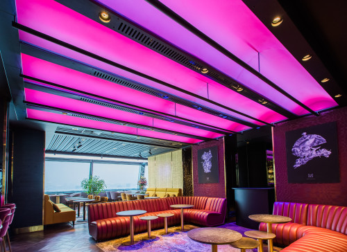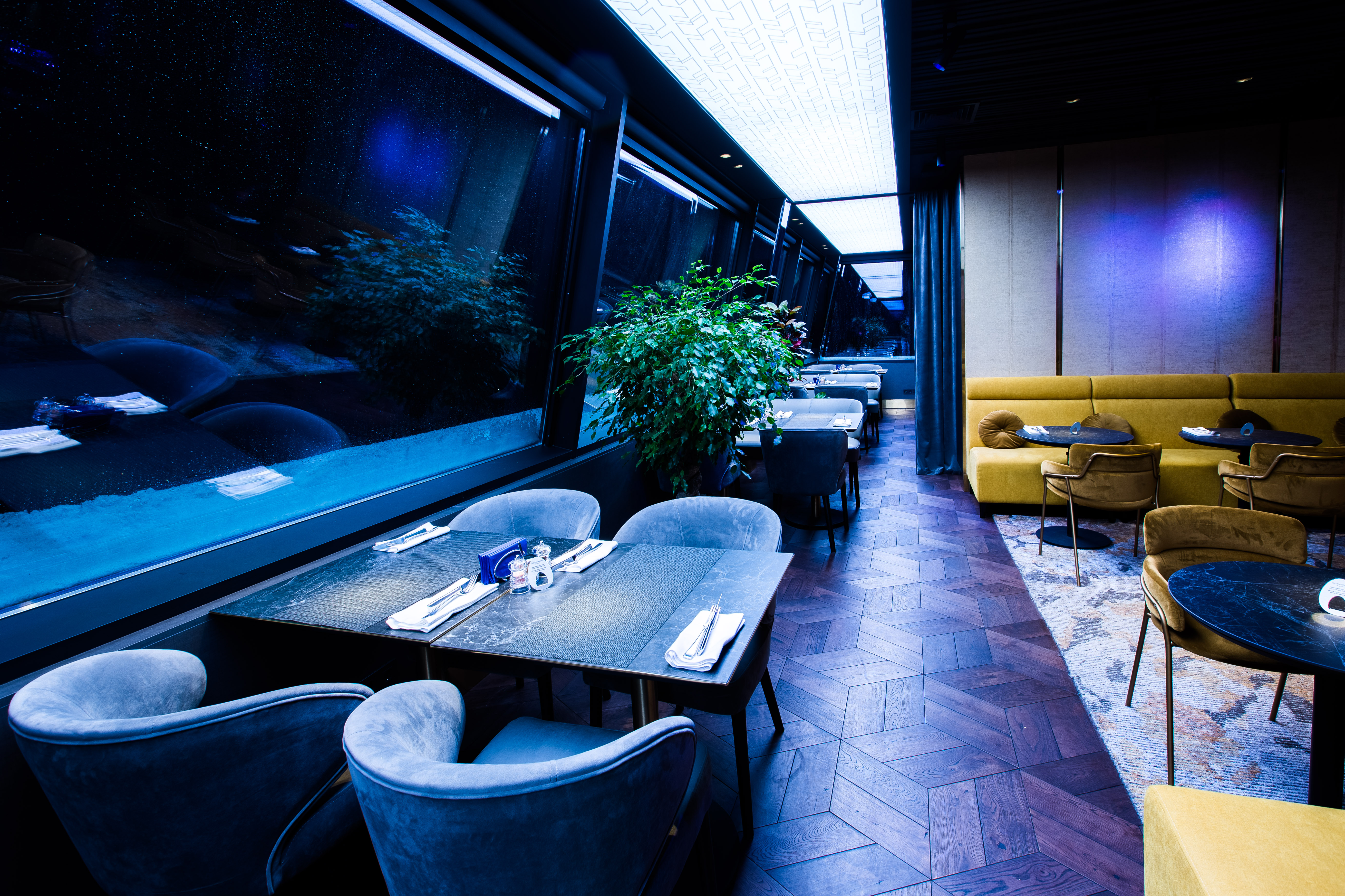 Is a panoramic restaurant under the roof of the hotel. The small space is complicated by mirrors, revealing the general concept of the hotel.