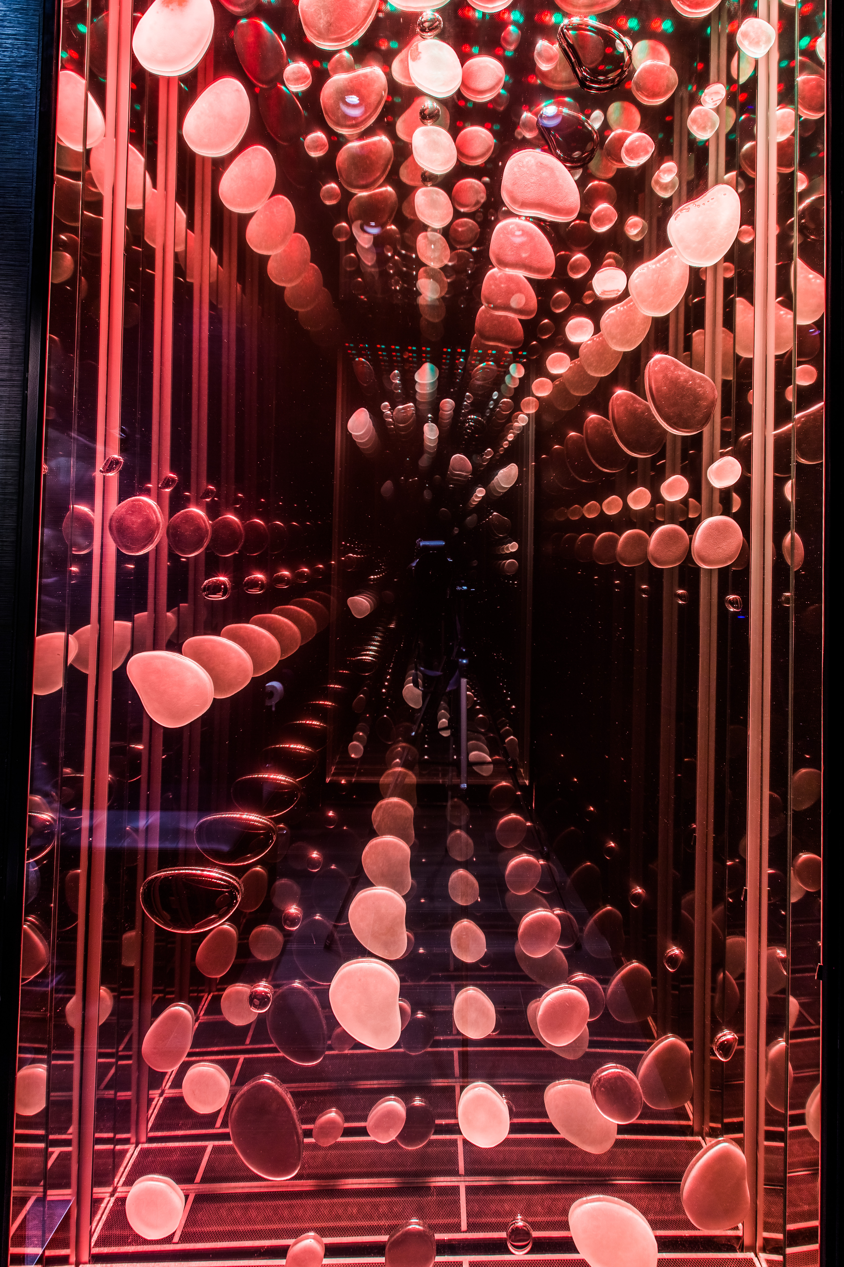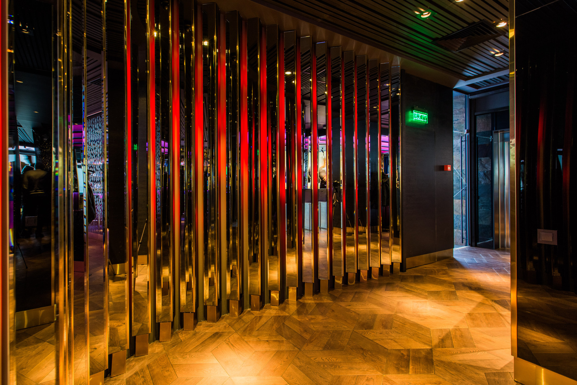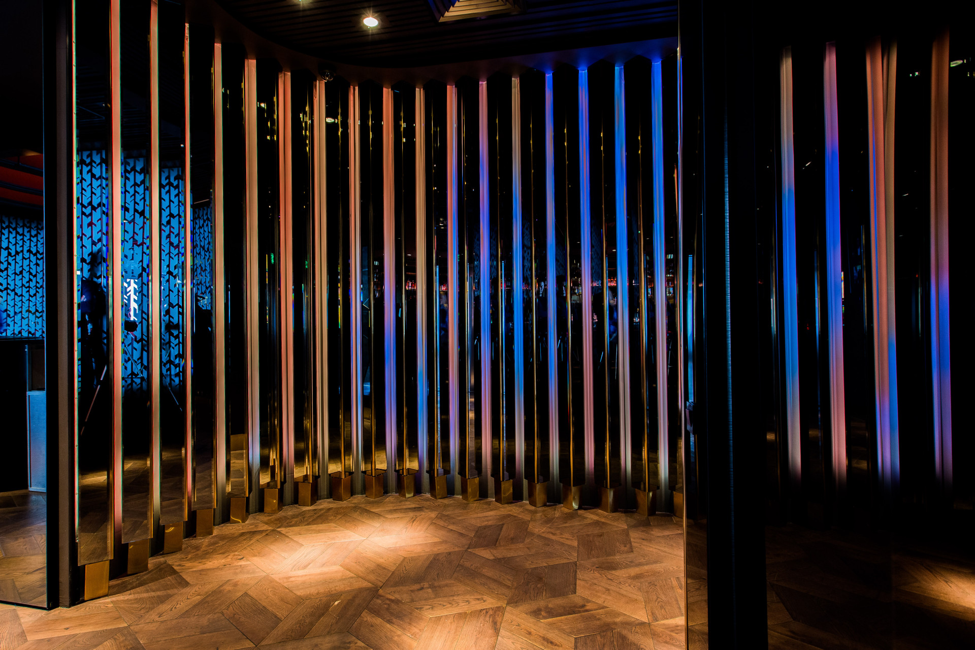 Along the curvilinear entrance corridor, there is a row of vertical lamellae of mirrors: the media illumination is hidden in them with 16 variants of palettes and dynamics.
