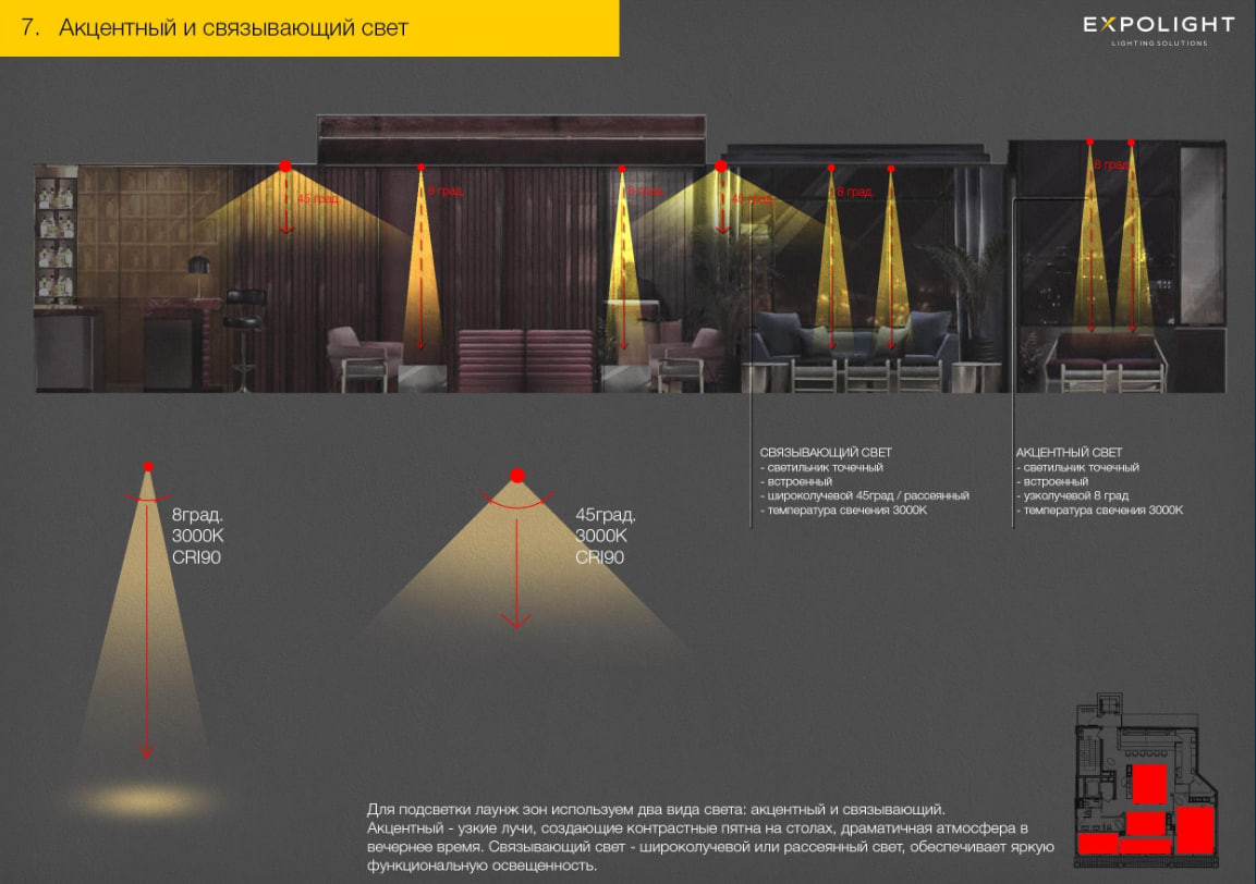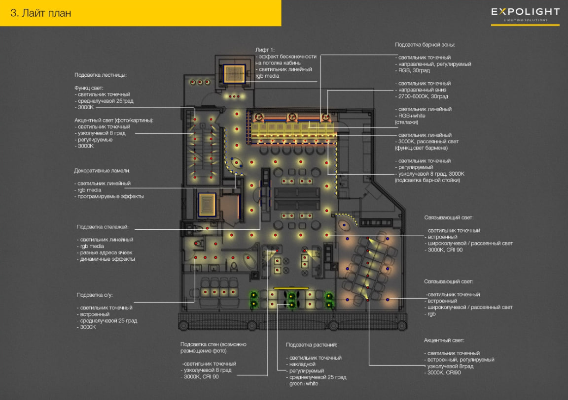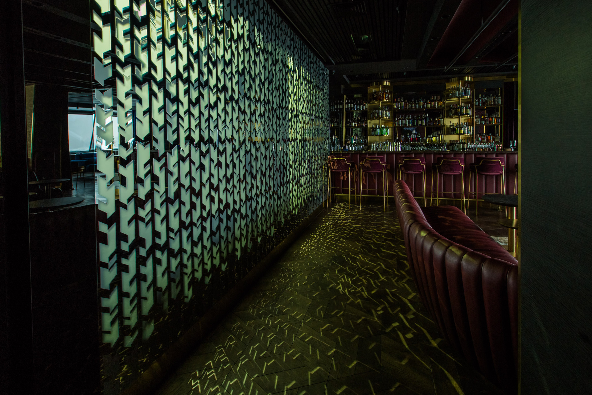 In the lighting of the restaurant, narrow accent lights are combined with wide connecting luminaires. A special place is occupied by a patterned mirror with a sandblasted pattern onto which 3d-mapping is projected with hidden projectors. More than 30 types of projections change the palette and degree of activity.