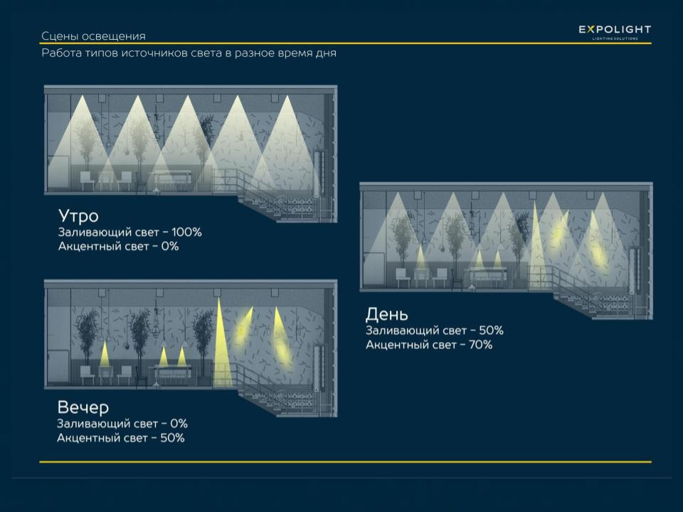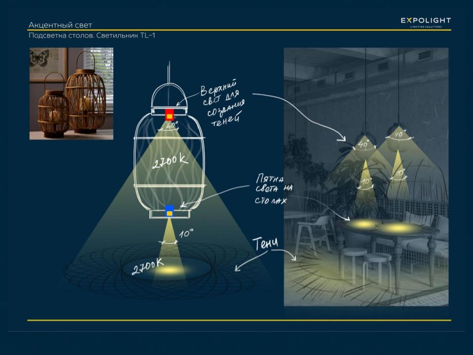 We had an interesting task - to make the light more architectural and give it the atmosphere of the Vietnamese market. And also to realize the opportunity to transform the space with the help of light from a more democratic dining mode to a cozy evening and chamber late evening mode.