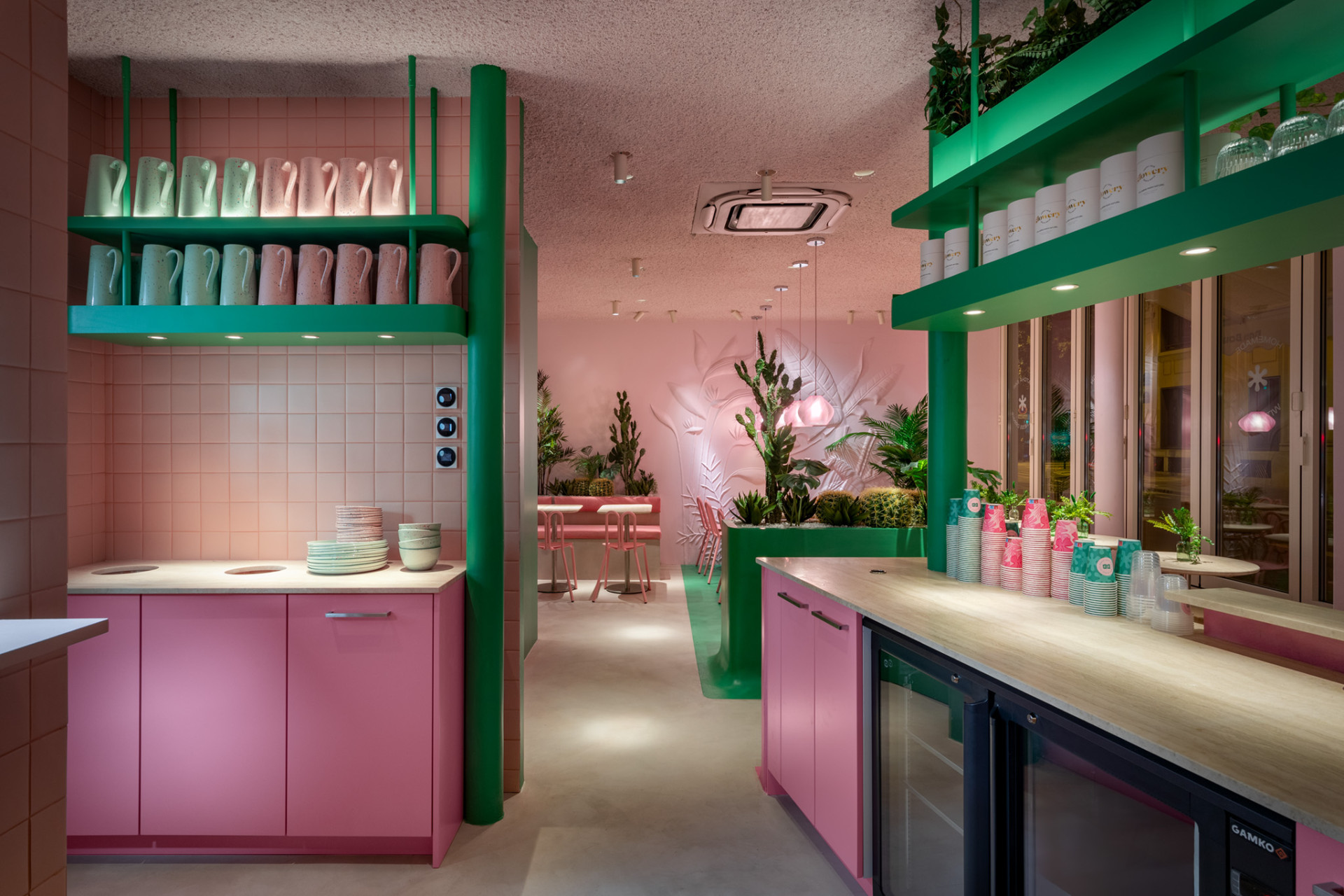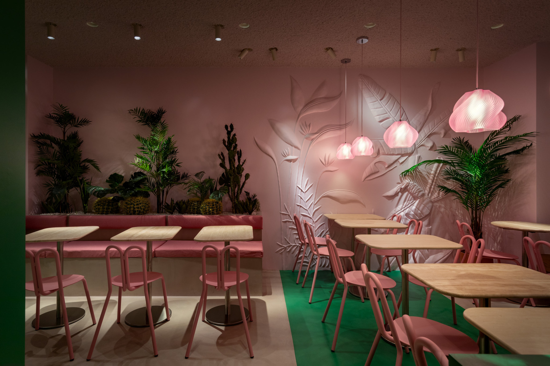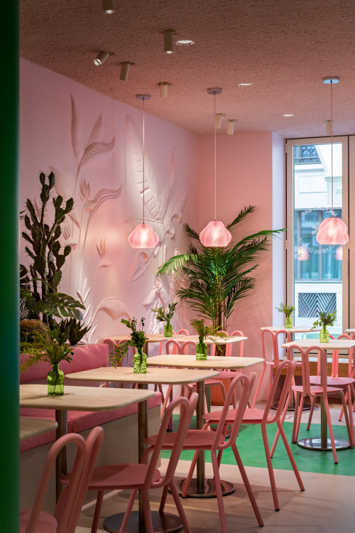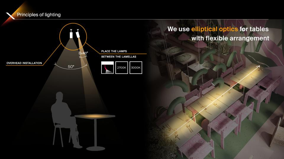 This restaurant is definitely atypical for Paris, and attracts attention with its color scheme, stylish details, and succulent plants. To combine all this into a single harmony, we used our lighting techniques and chips.