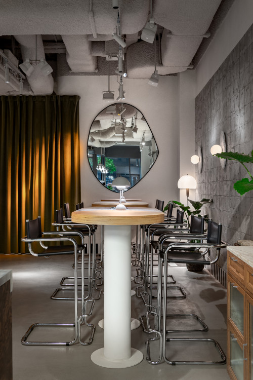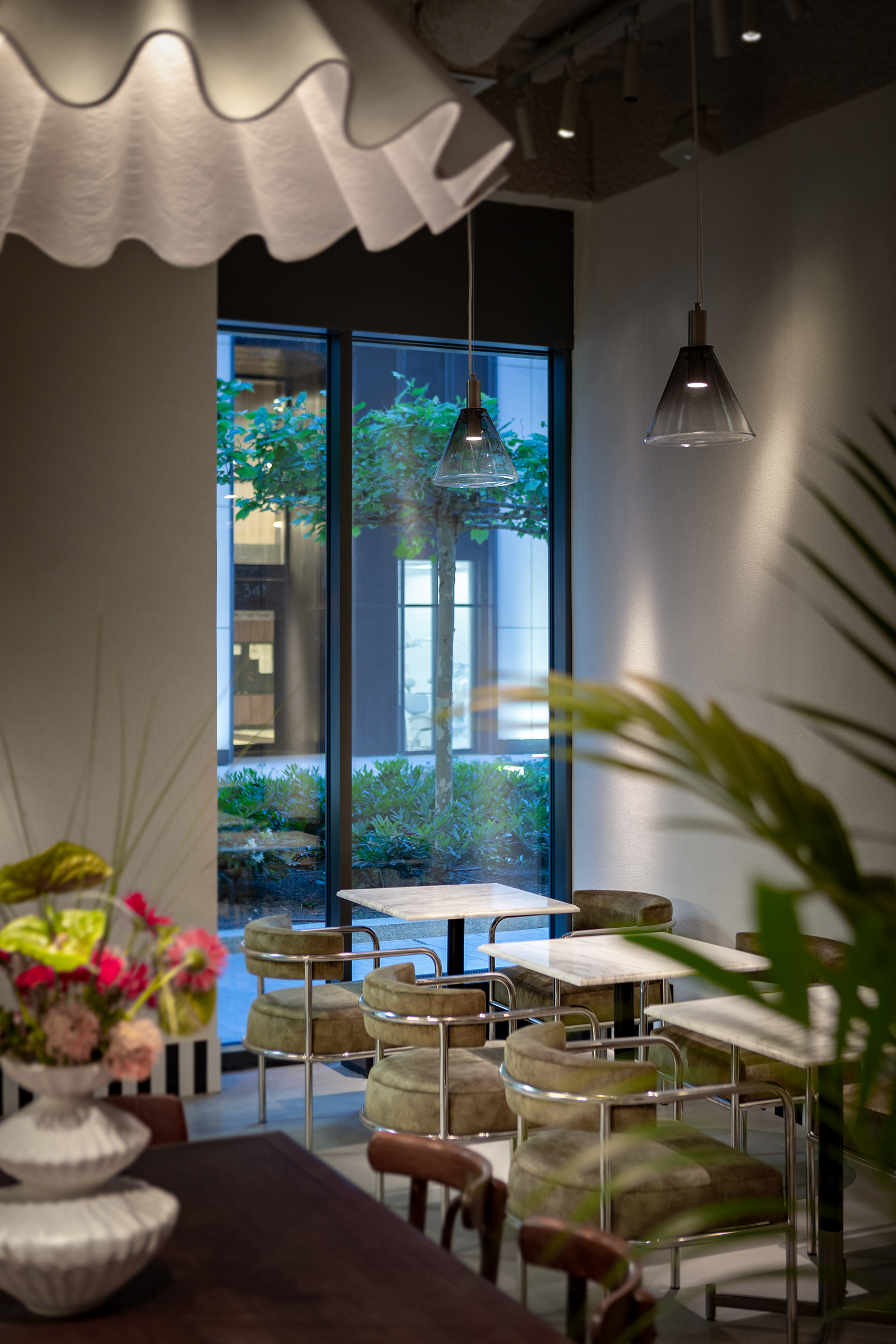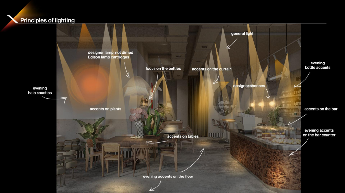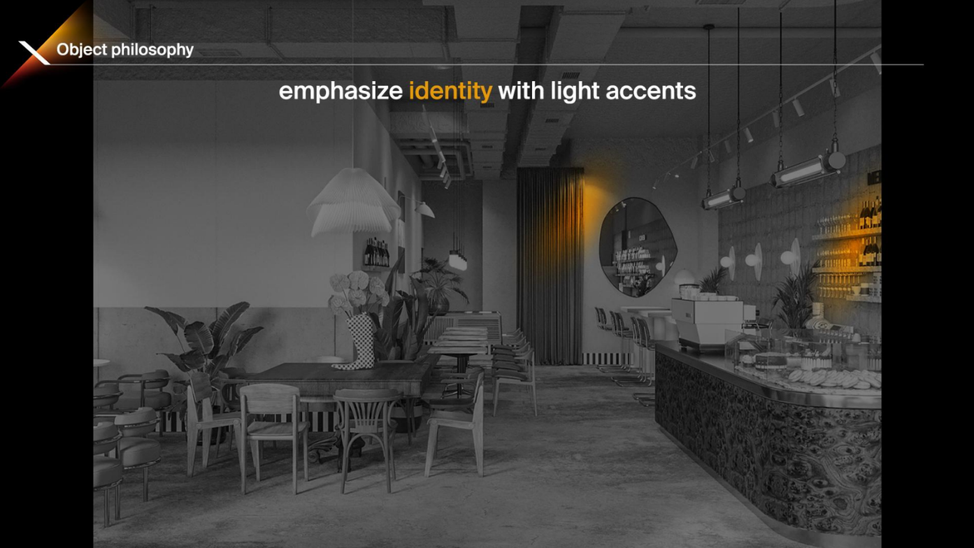 We pointed out shadows from the tree branches, emphasising the sophistication and naturalness of the interior. We also worked separately with coloured lighting, finding juicy combinations of shades.