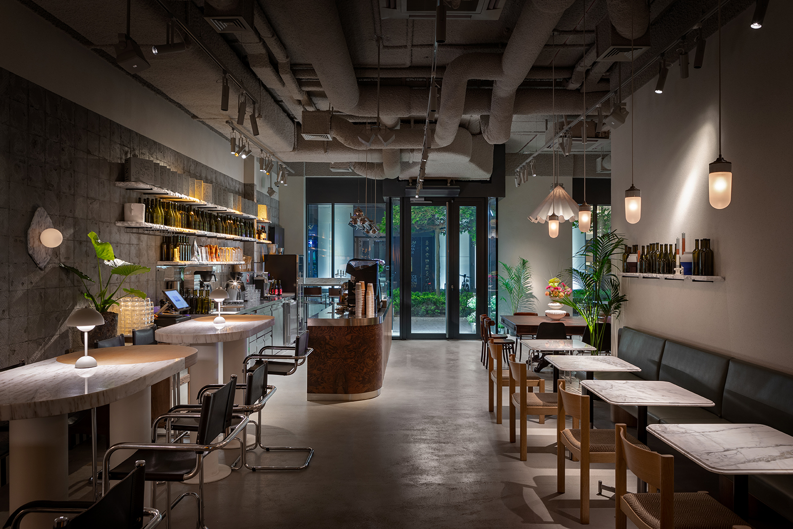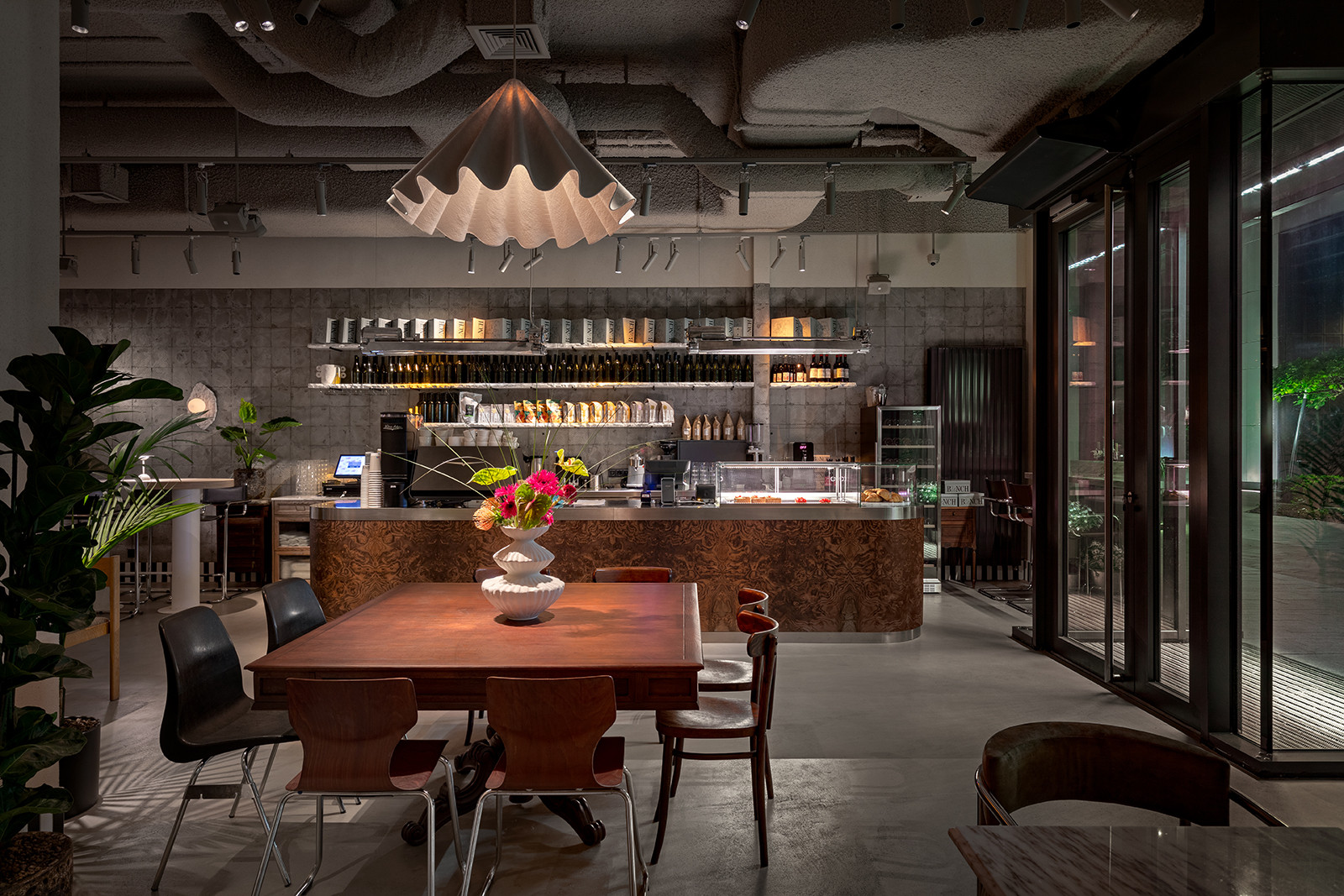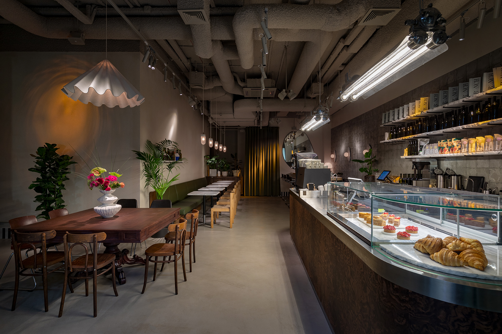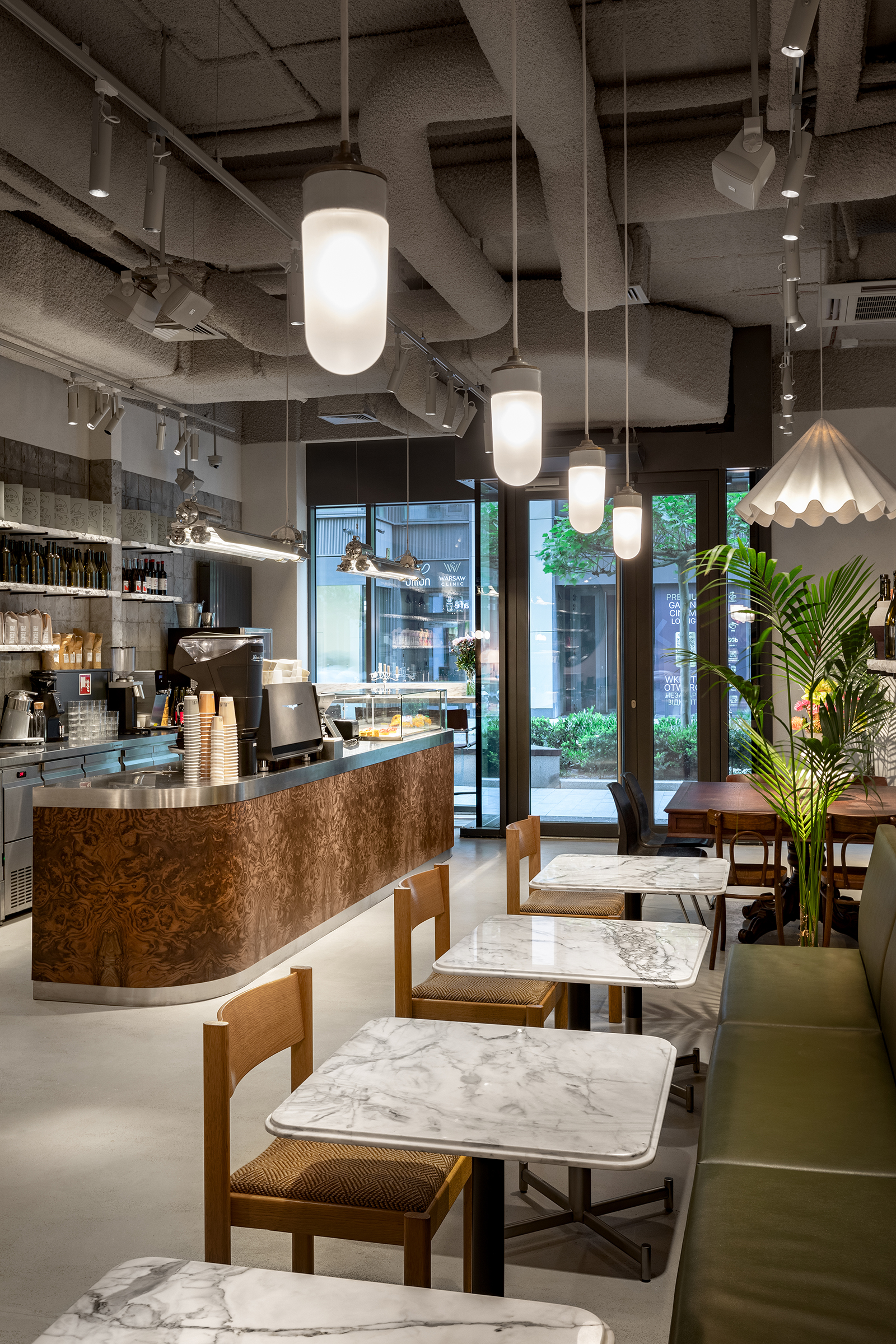 We pointed out shadows from the tree branches, emphasising the sophistication and naturalness of the interior. We also worked separately with coloured lighting, finding juicy combinations of shades.