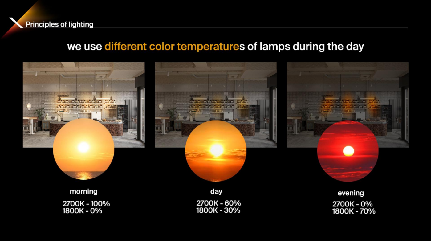 We also separately worked on lighting scenarios throughout the day. All light sources are linked to a single control system using our Cloud Control System and are programmed in such a way that lighting scenarios change as naturally as possible throughout the day - slowly and almost imperceptibly, just like the light outside the window. This makes long stays even more comfortable.