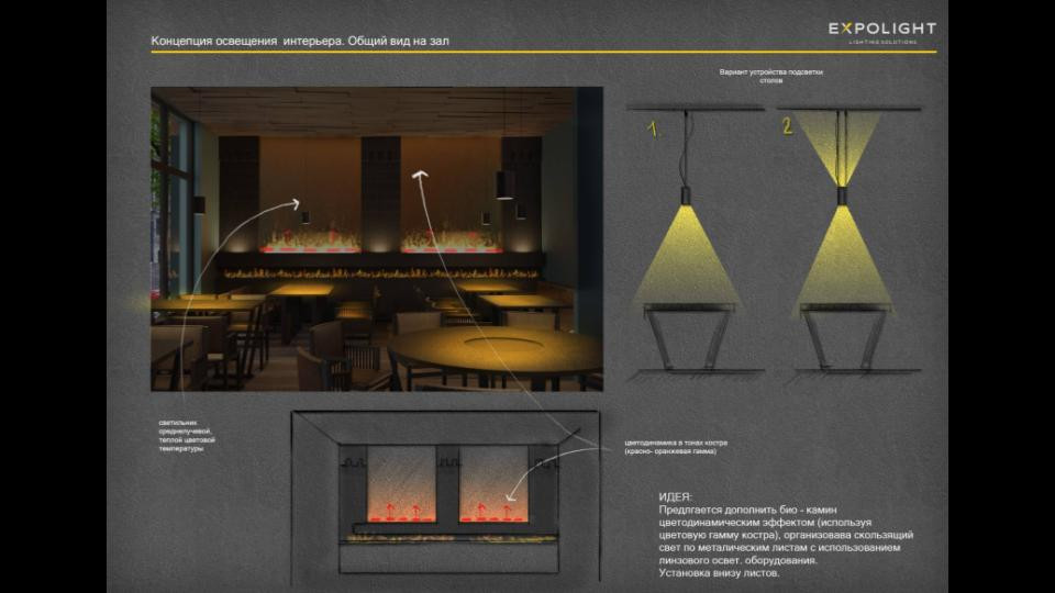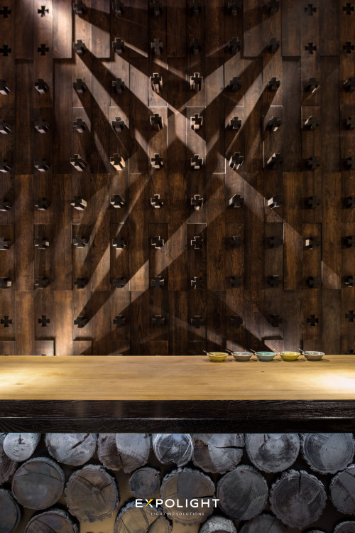 The emphasis is on the use of large-sized natural materials. The central role in the interior is played by a wall made up of perfectly textured wooden dies and crosses of different heights.