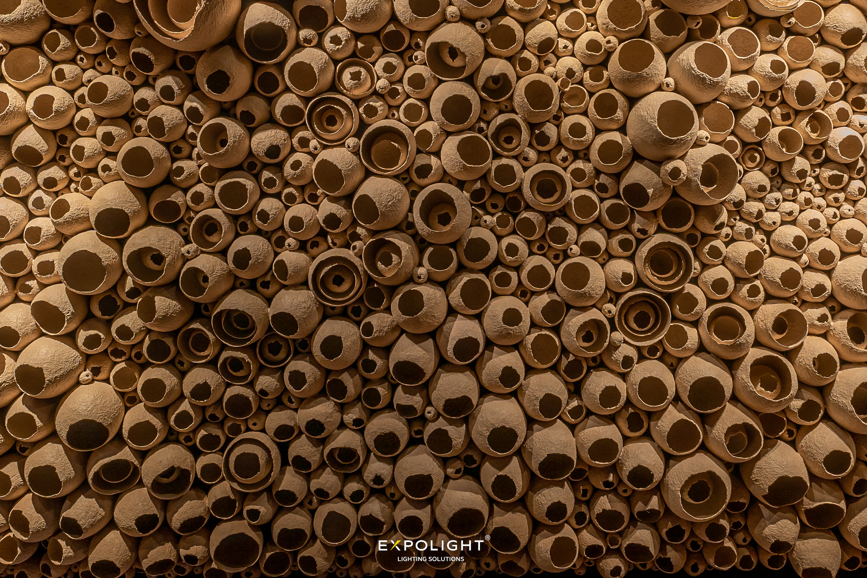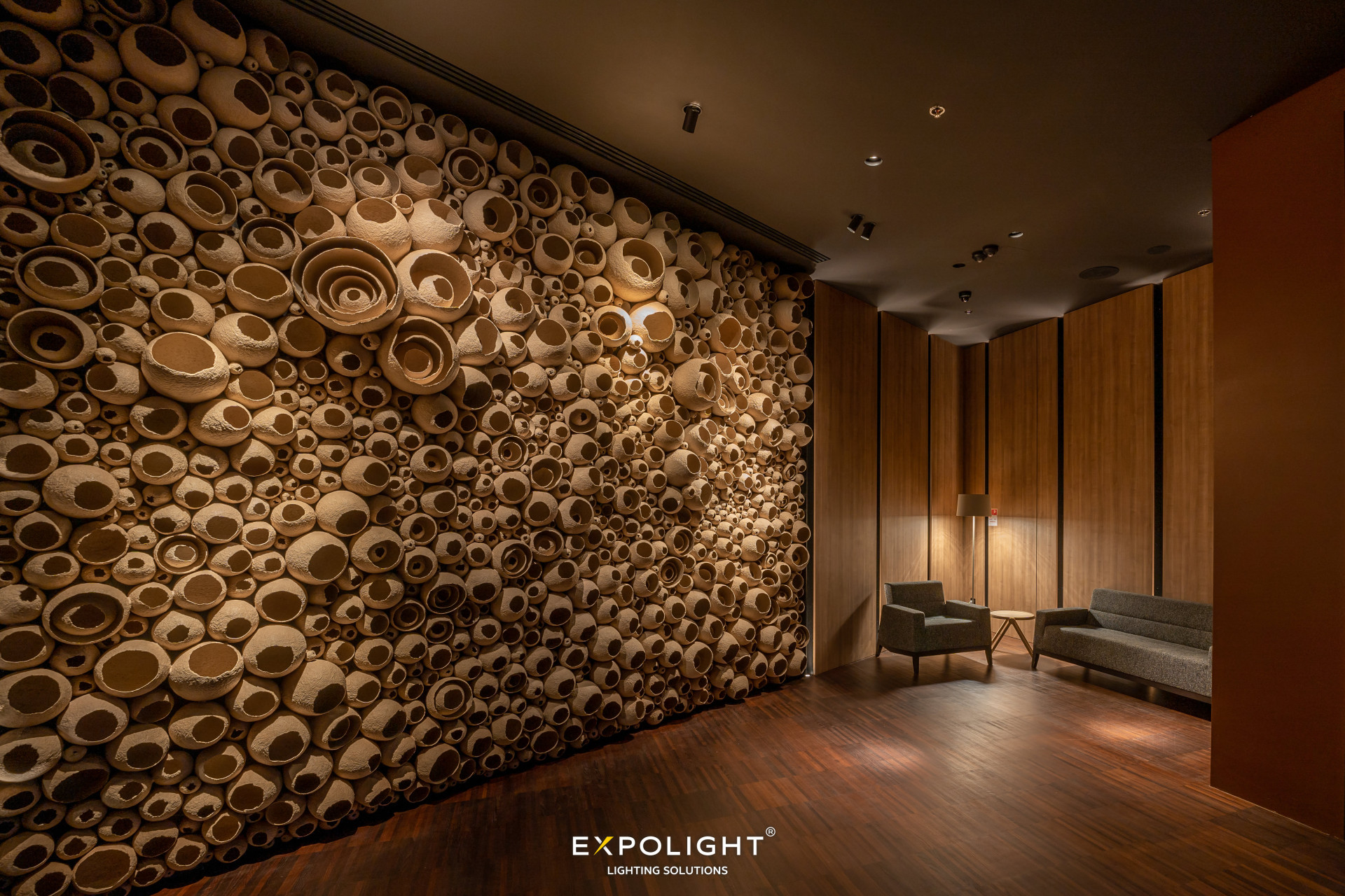One of the key elements of this project is a wall decorated with elements resembling an eggshell. When working with this wall, it was important to create lighting that would emphasize its volume and texture, rather than make it flat.