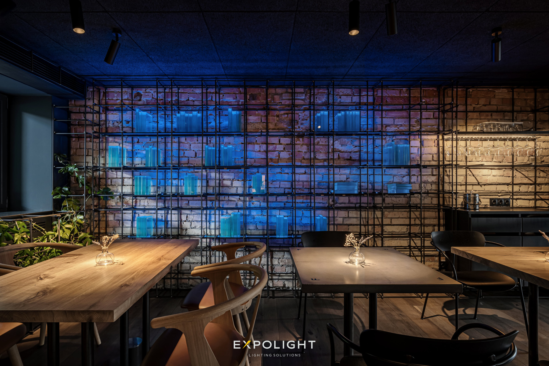 A relief painting made of books became a striking interior focal point. It was highlighted using optics of different degrees, adding depth and relief to the flat elements of the interior. Luminous glass books, illuminated with blue light in line with the overall style of the restaurant, are the most attractive feature. Light sources are inconspicuously integrated into the designed furniture units.