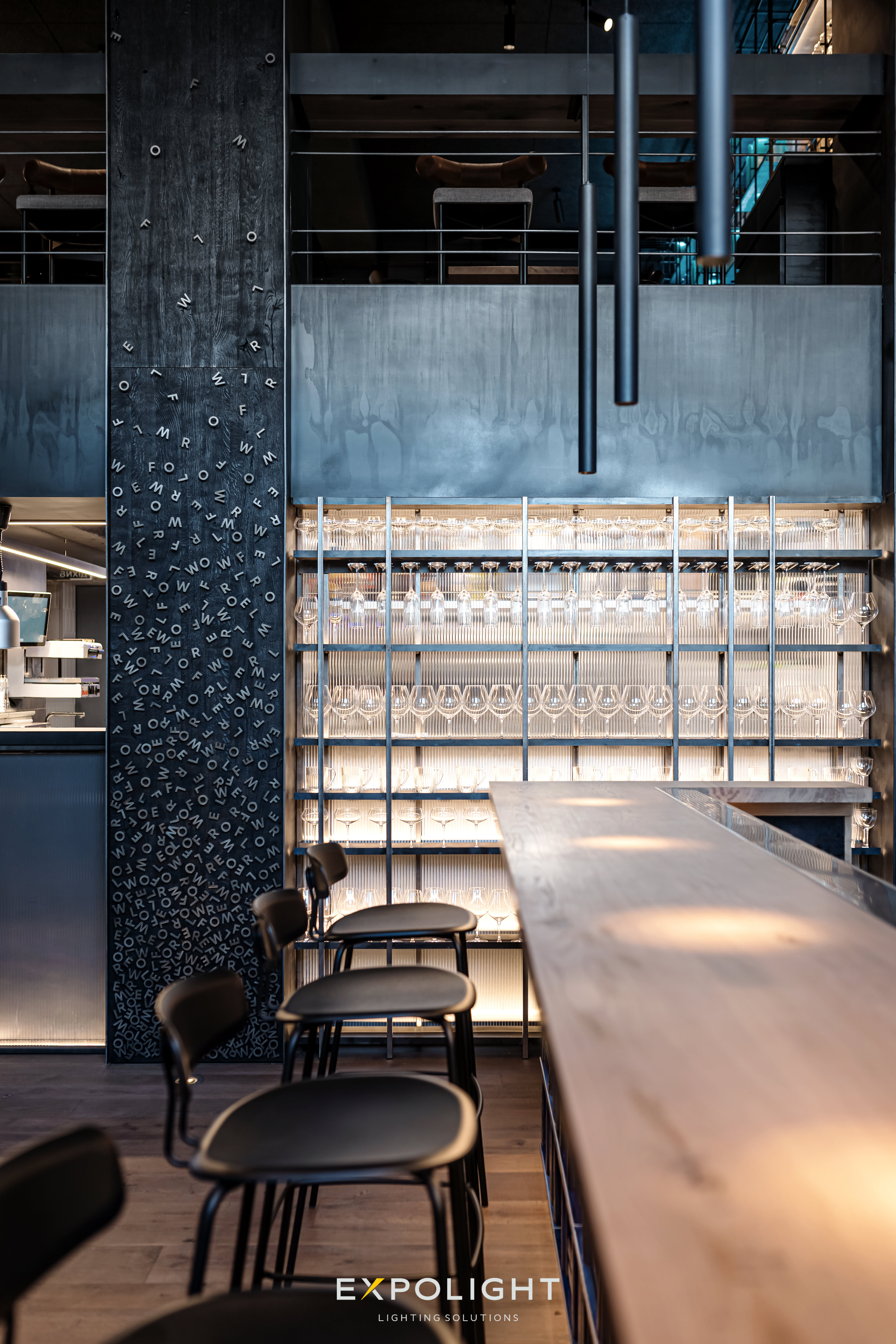 Throughout the day, the interior experiences a "little life," accompanied by changing lighting. Morning scenes are soft, with flooding, low-contrast light. During the day, light accents appear on surfaces, softened by subtly adjusted flooding light. In the evening, the accents become dominant, highlighting individual elements and zones while other areas are immersed in shadow. Light scenes were meticulously adjusted in collaboration with architects, refining the effects to within single percentage points of lighting.
