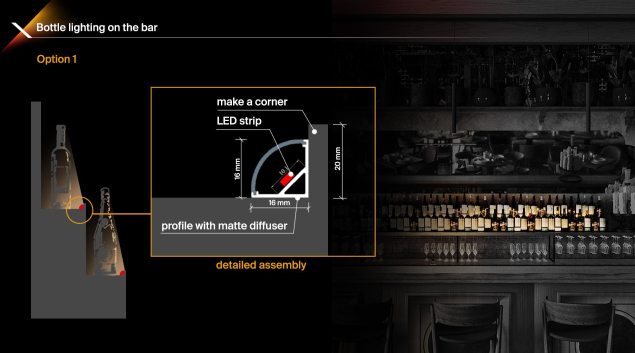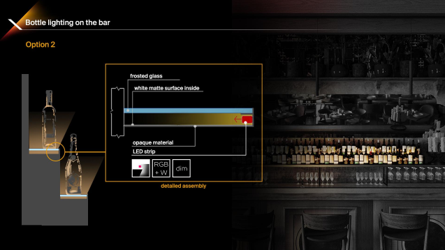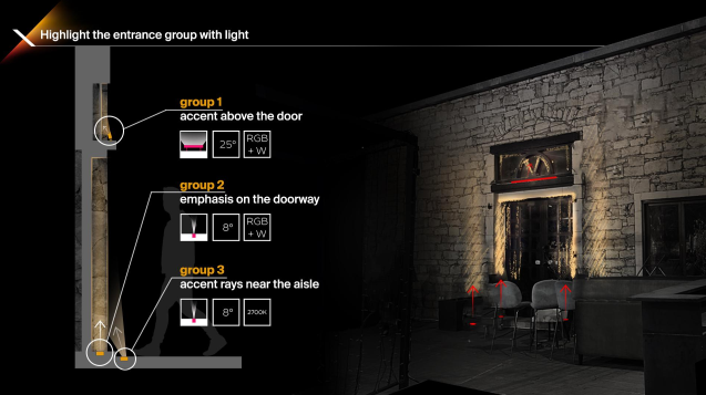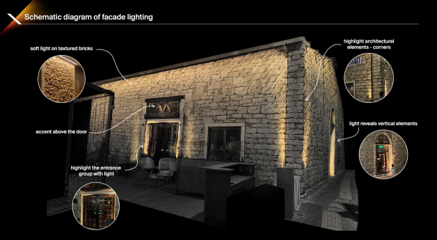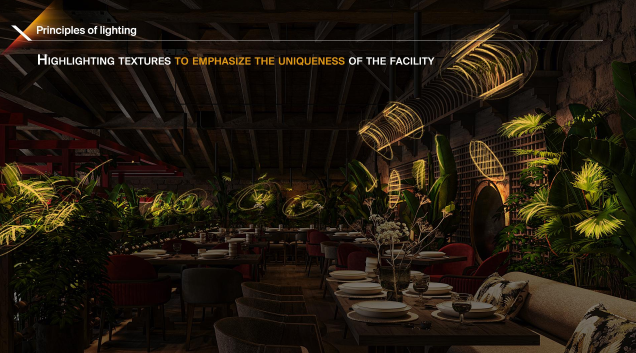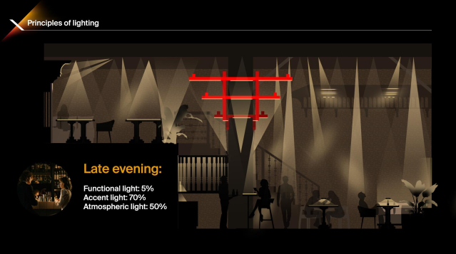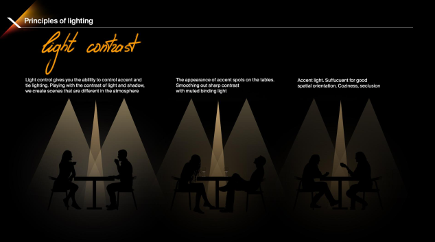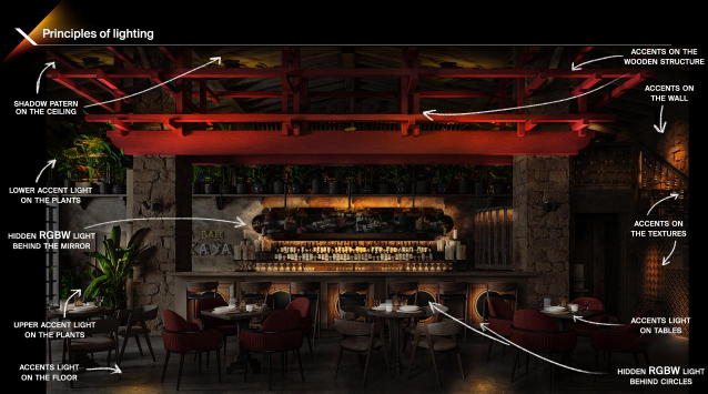 Due to the lighting scenarios, the atmosphere can be transformed from a cozy dinner place to a sophisticated club. The old building gives the space a special charm, and we use light to emphasize its historical textures, giving every detail a new sound.