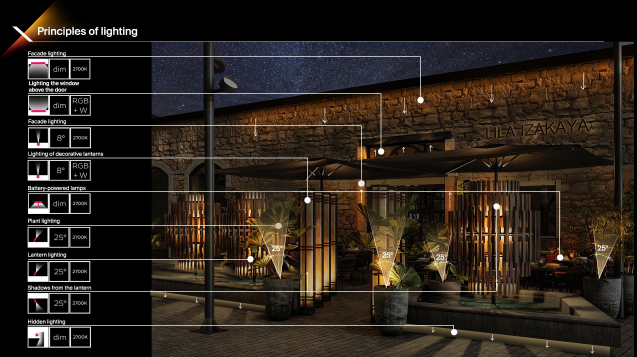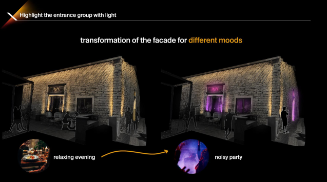 In this project, we implemented a large number of light groups to adjust the lighting for different scenes as flexibly as possible. We finely tuned the brightness, intensity, and accentuation of the light for day, evening, and night modes. We also emphasized the façade with live lighting with a smooth, soft flow and different color scenarios that create a mood for different requests.