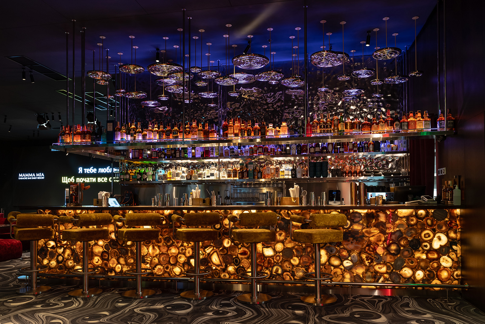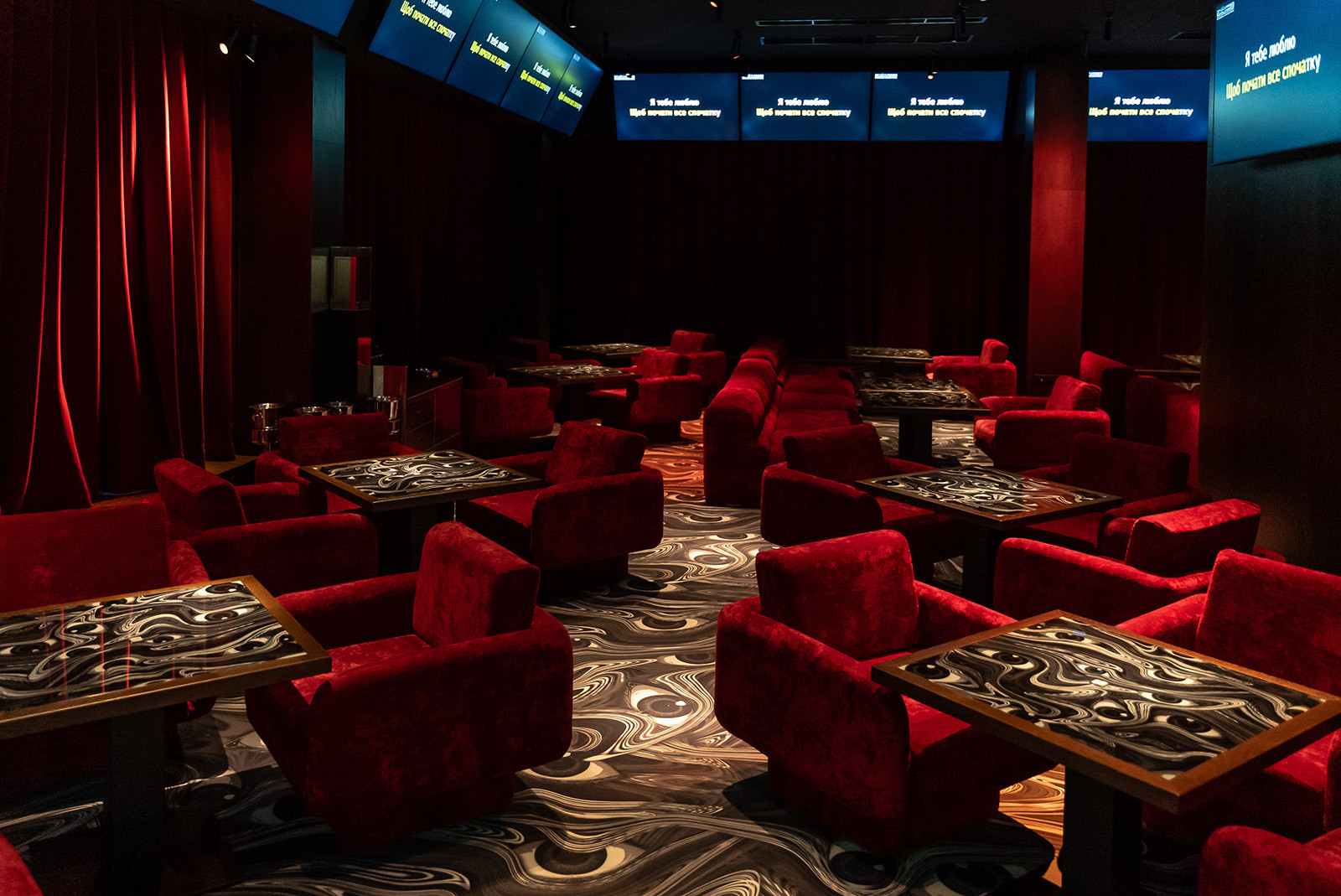 The light-coloured lighting has several scenarios that enhance the evening mood. Delicate accent lighting emphasises the textures of the interior and adds depth to the space. In response to the concept of movable furniture, a chaotic arrangement of accents has been used to create a lively atmosphere. A special accent is the bar counter with variable lighting that changes the perception of space. Irregular rays on the floor emphasise the pattern of the carpet, and the ceiling in evening scenarios becomes a light stage for a party.