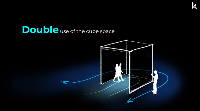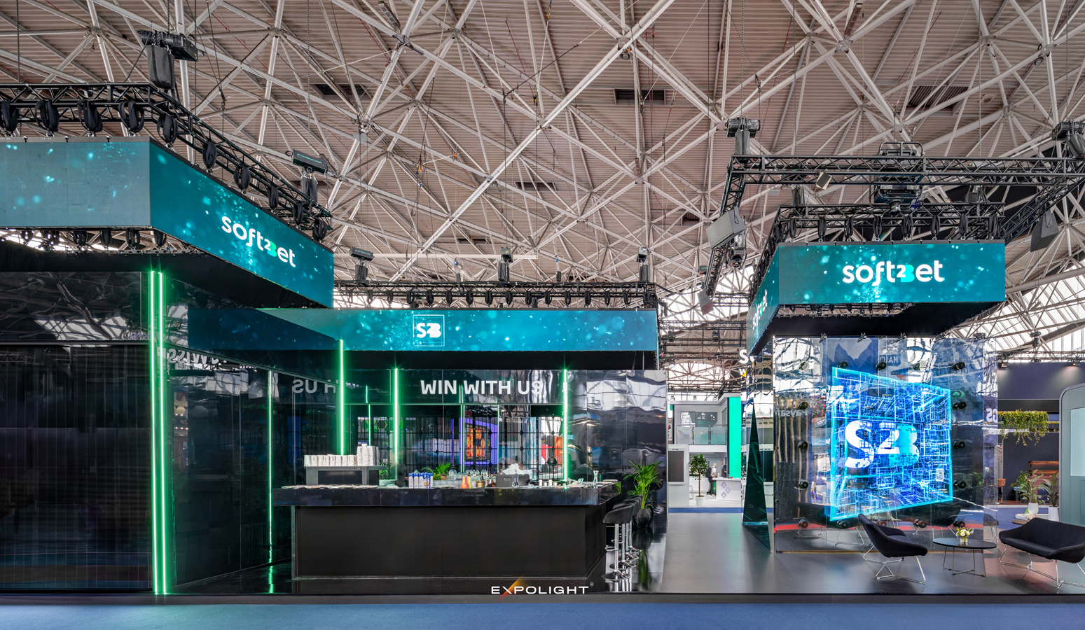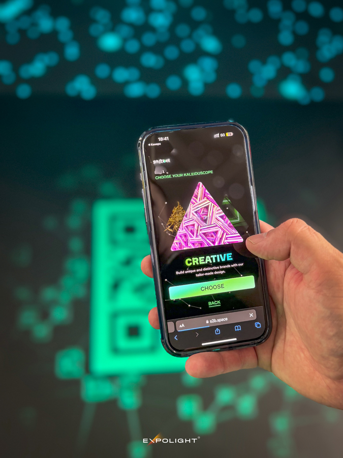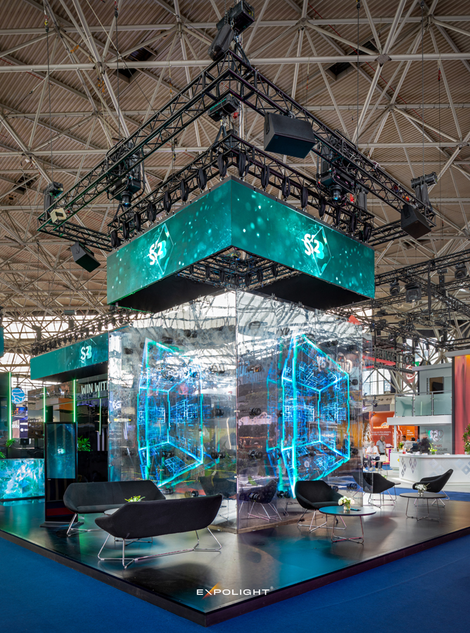 A 3D cube with holograms and a kaleidoscope for a cool exhibition stand in Amsterdam, which we worked on together with the international Soft2Bet customer team. This is a super innovative stand that offers an immersive experience through a combination of interactive technologies and media art.