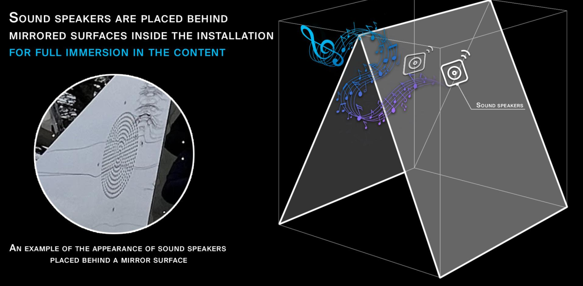 Holographic projections made with fan screens and mirrors are one of the main accents of this project. Fan screens create three-dimensional images that, when reflected on mirrors, create the illusion of invisible space and infinity.