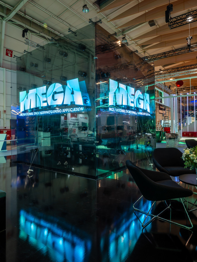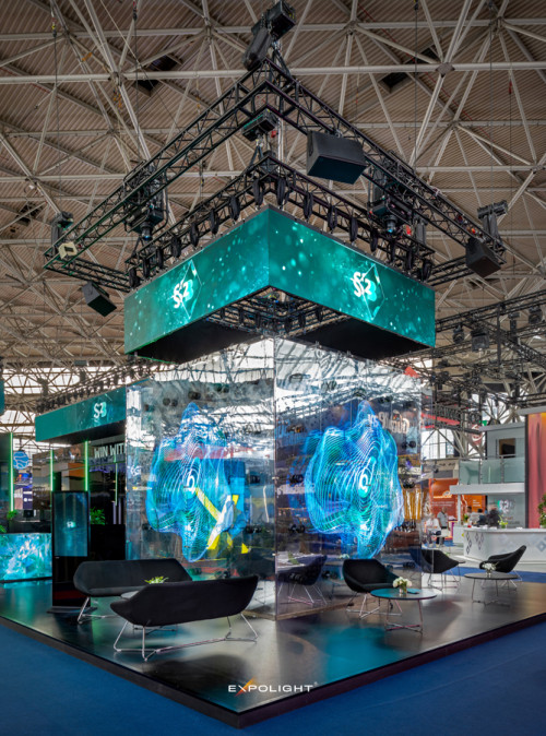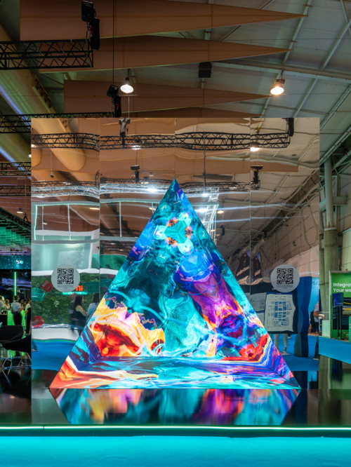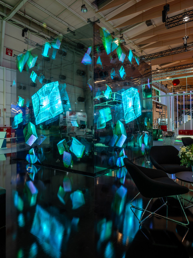 Customization adds even more interactivity: visitors can influence the visual effects through a special app, changing the patterns and atmosphere of the stand in real time. It's not just an exhibition - it's a personalized digital world that responds to each viewer.