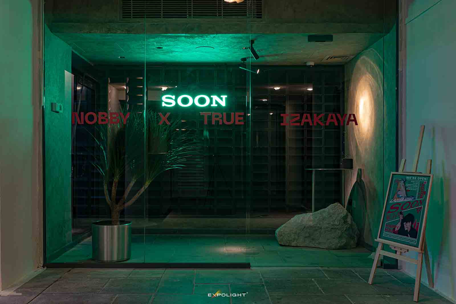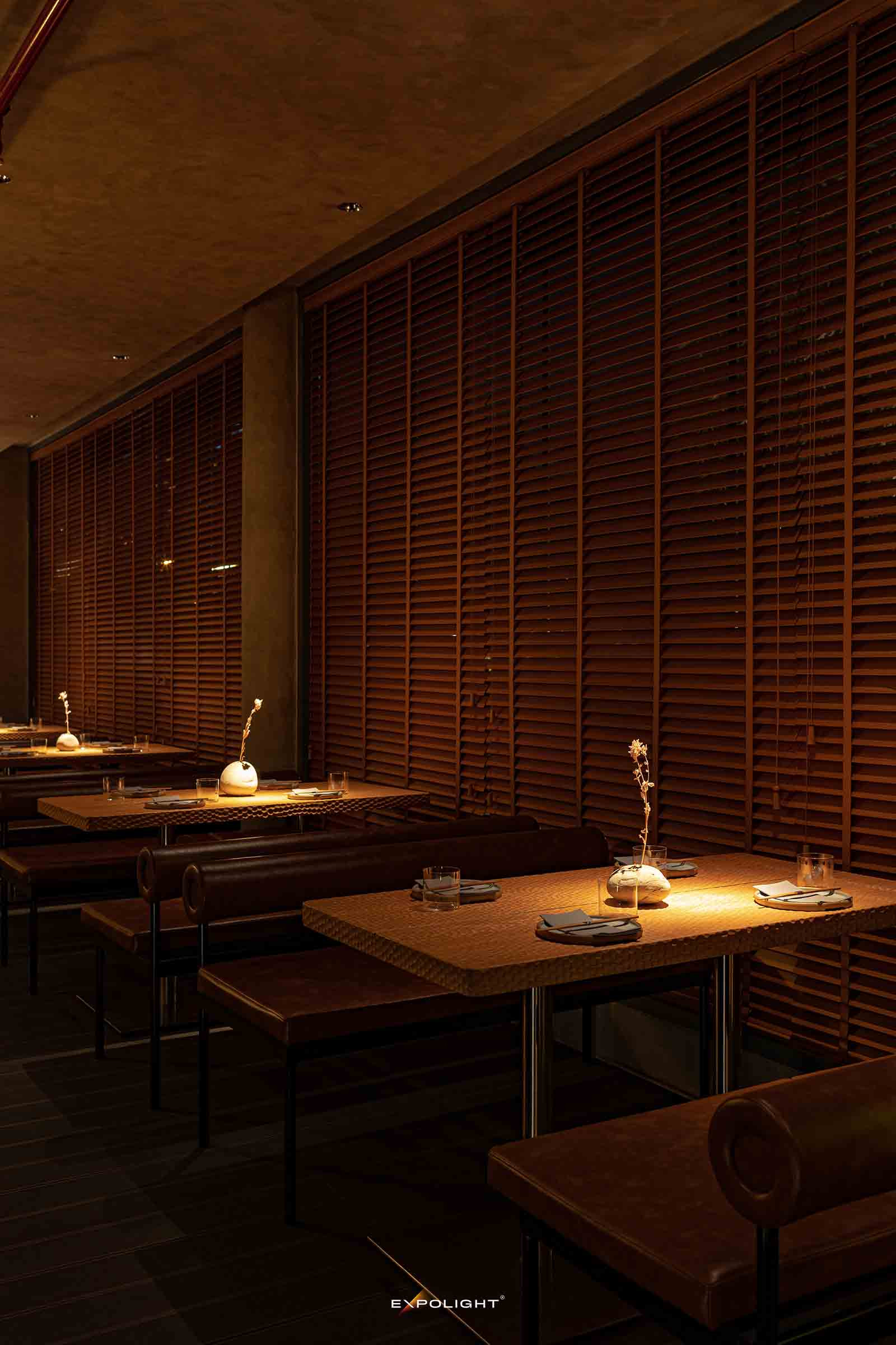 Soon is a restaurant in Dubai inspired by Japanese 1980s aesthetics. We emphasized the atmospheric details of the restaurant with light and geometric shadows, color shades, and halo-caustics, for which we developed a lamp of our production