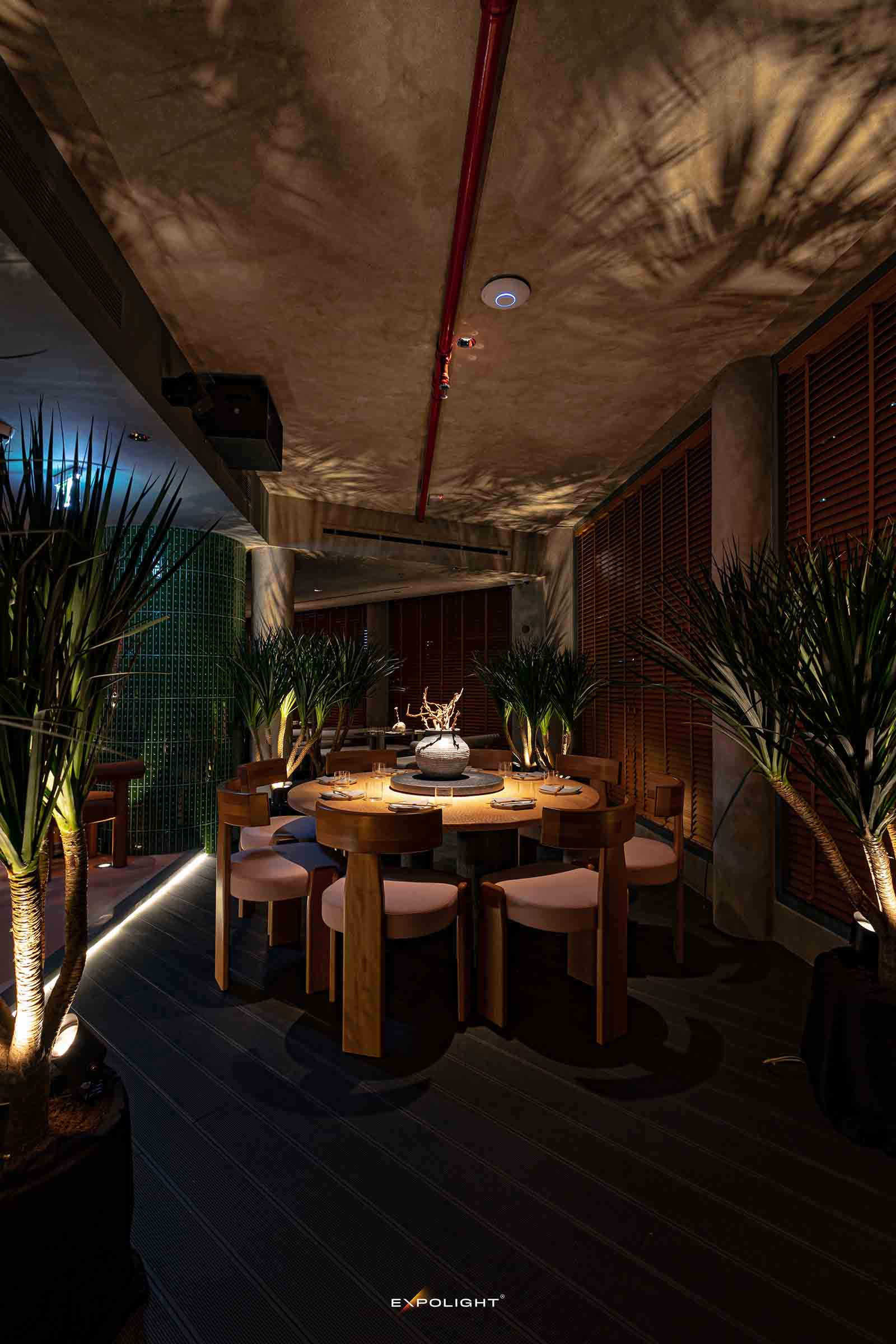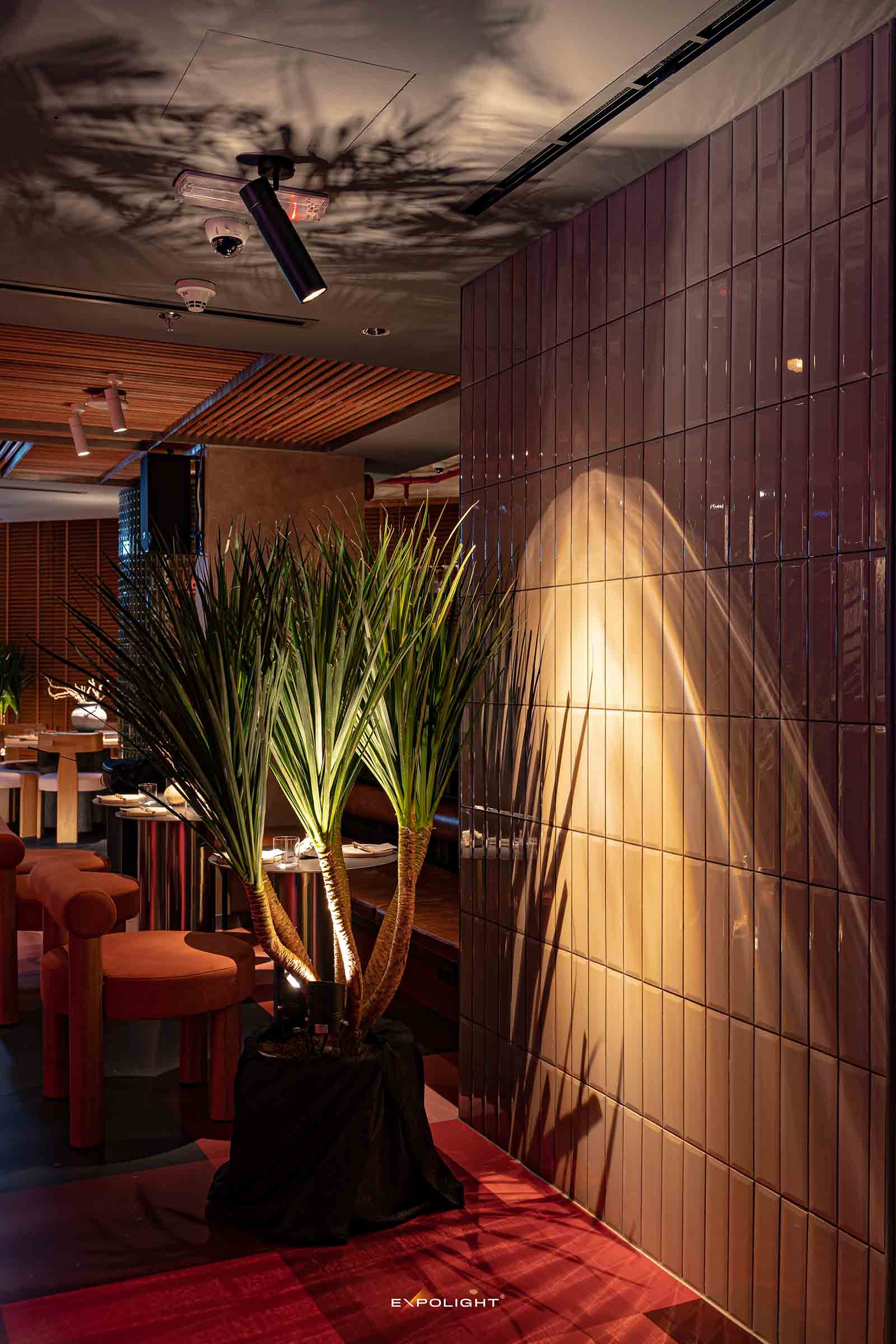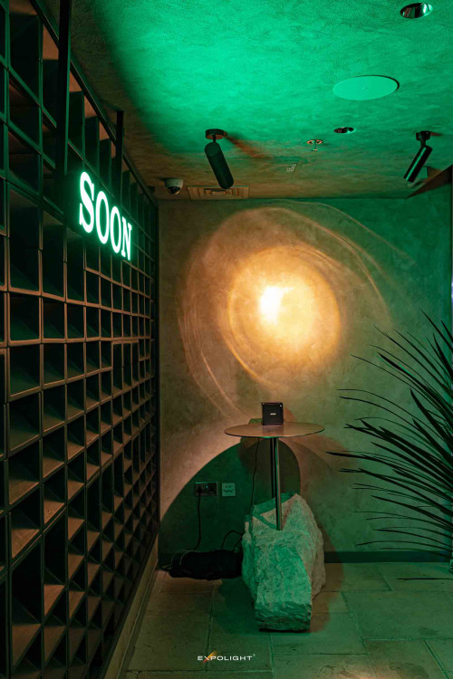 SOON transforms throughout the day with the help of light. We created a complex space with different light accents: Plant shadows, a Caustic halo lamp, a Light box with plants, Shadows from a wooden lattice, and Multi-colored RGB lighting on the glass wall.