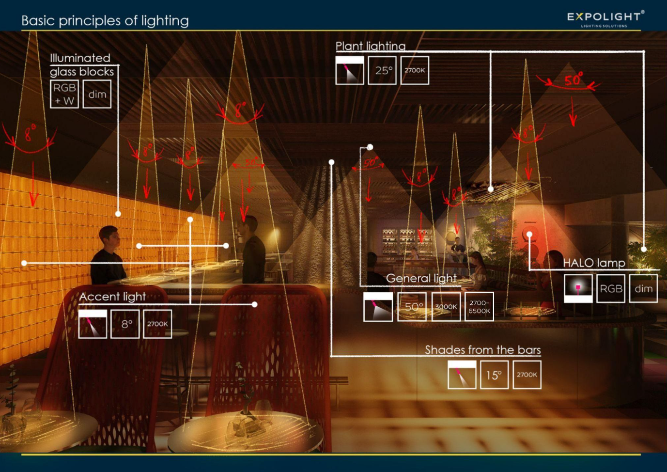 The magic of transforming space is accomplished by changing the percentage of brightness of each of the dozens of groups and changing the angles of the lamps by a few degrees. And it changes the perception of space radically.