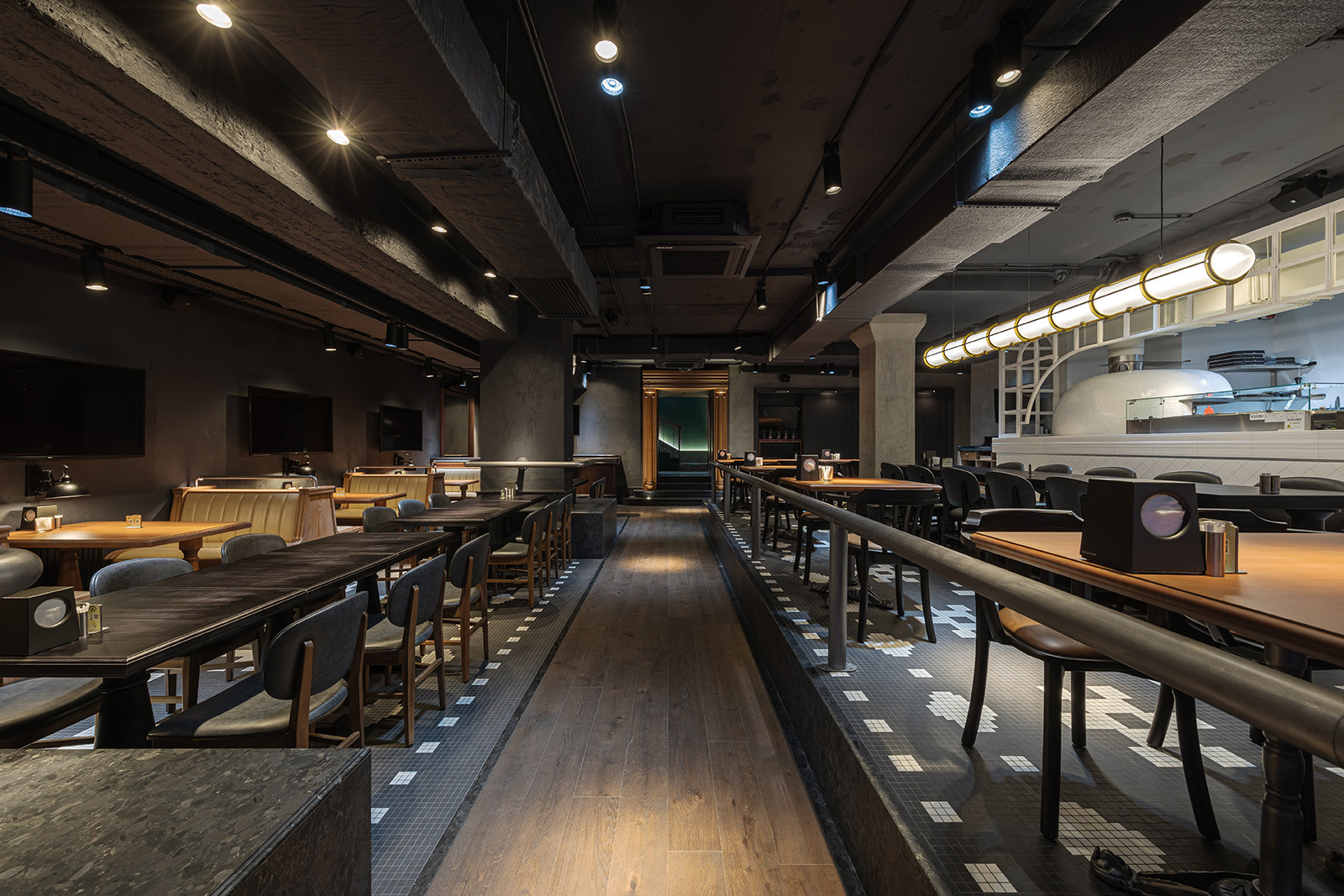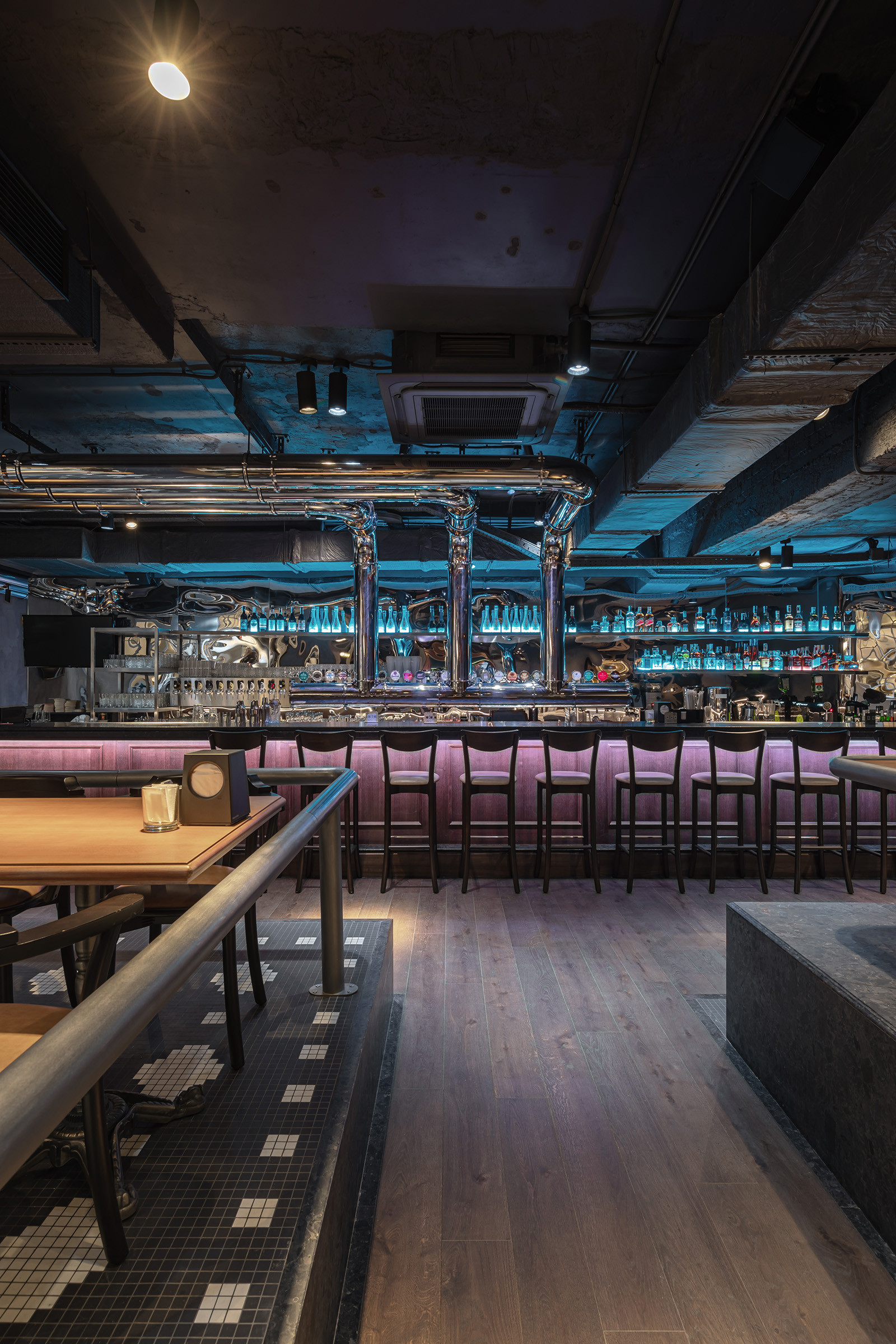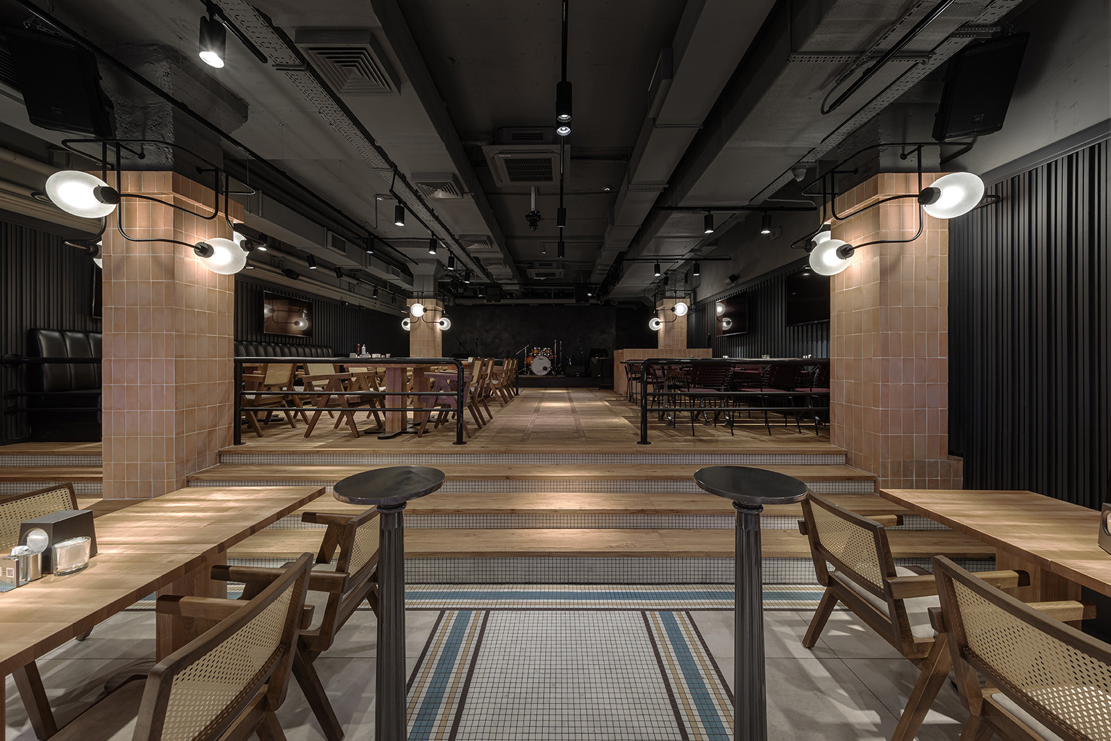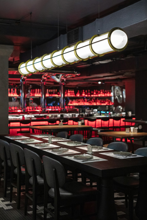 The restaurant is unusual because of its multi-level halls, only one of which receives natural sunlight. In halls where full sunlight does not penetrate, we recreated it ourselves with the help of a biodynamic lighting system. It changes according to the time of day and activity in the restaurant: for lunch and daylight hours, these are soft and calm tones, and for parties and watching sports, they are contrasting and saturated.