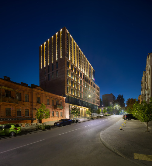 We designed custom lamps specifically for this project - they were very complex and truly unique in both shape and angles. Our main task was to bring out the glass, glass elements, and asymmetrical niches. Therefore, the lenses in these lamps are not the same along the entire length. The width of the corner varies, so it was very challenging and interesting in terms of designing and developing a special lamp. In addition, this is only the second project in Kyiv that is controlled by the world's most innovative and powerful control equipment for generative facade lighting from the British Pharos Architectural Controls, but with our operating system and our developed software that allows you to collect online data from the Internet so that the facade lighting reflects the rethinking of this Big Data. Since UNIT.City is about innovation and progressiveness, working with data, we felt that this approach was exactly what we needed to do here.