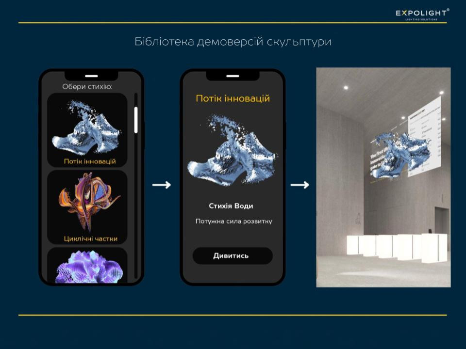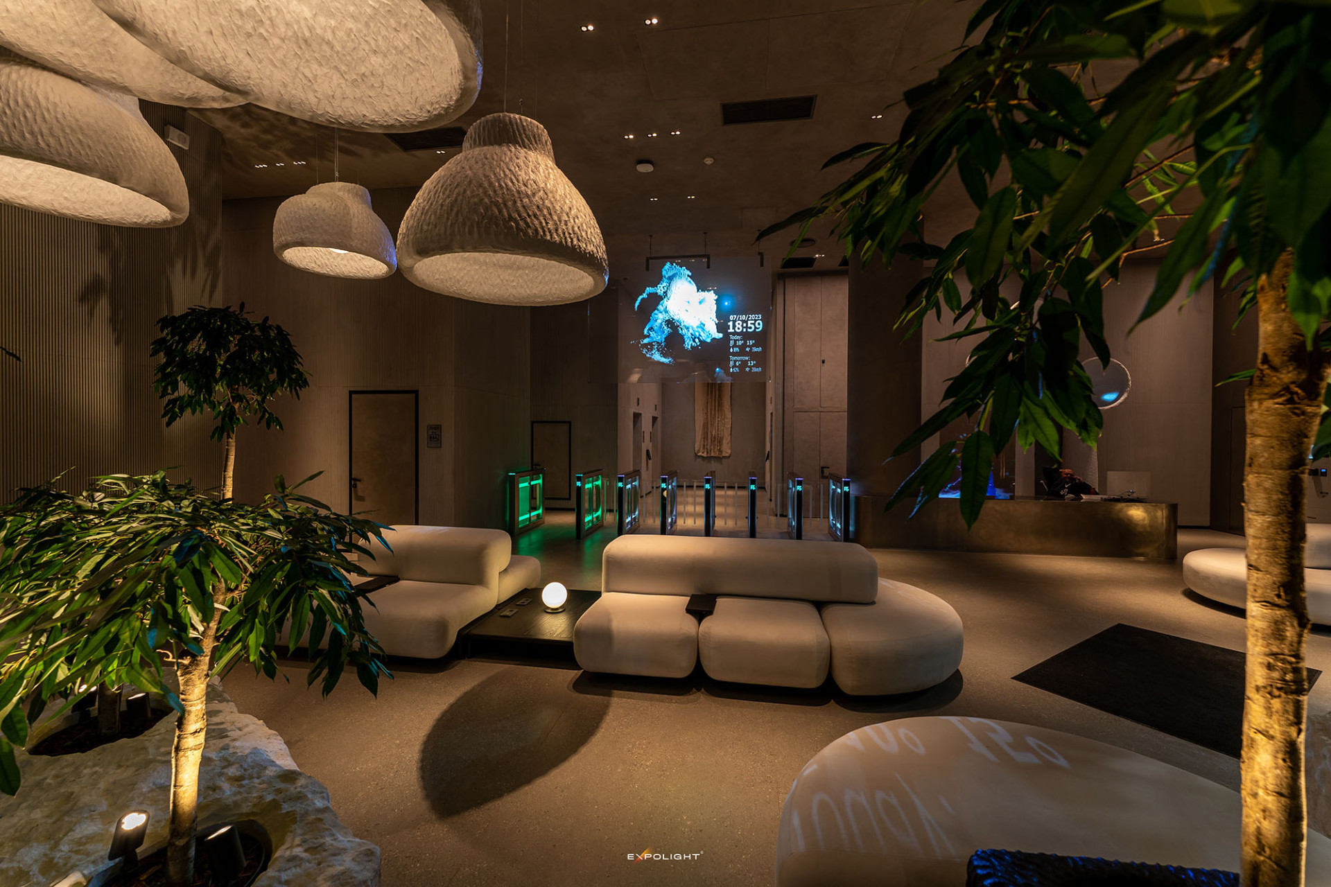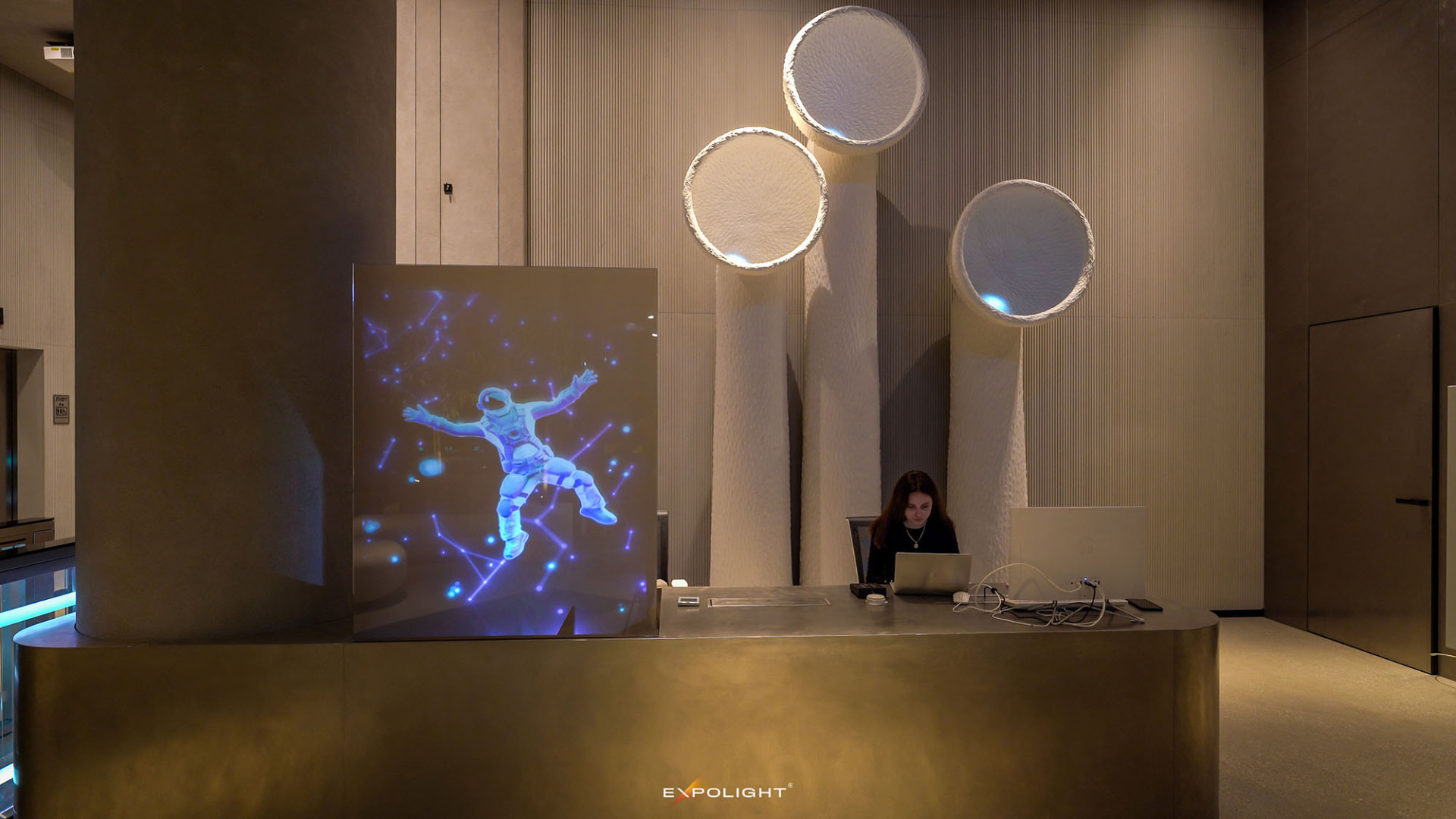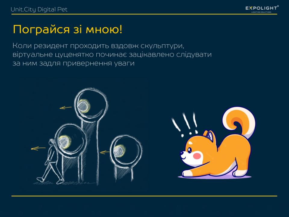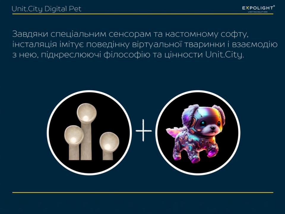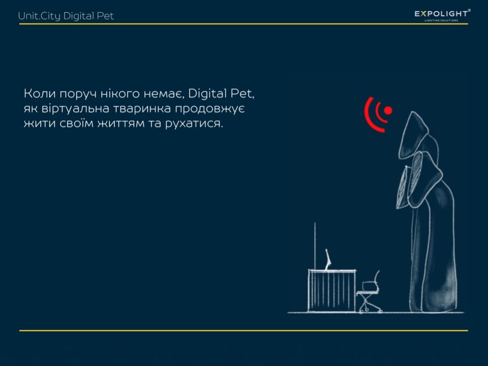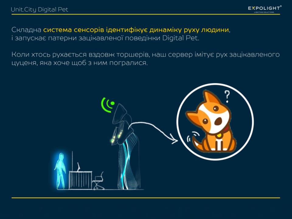 For the holographic custom screen near the reception, we designed and implemented digital moving avatars that reflect Unit City's values. And for the floor lamps, we didn't just make a 3D mapping projection, but used special sensors of the latest generation of Lidar and custom software from Expolight to turn them into the behaviour of a digital animal, symbolising the futuristic and innovative nature of the park.