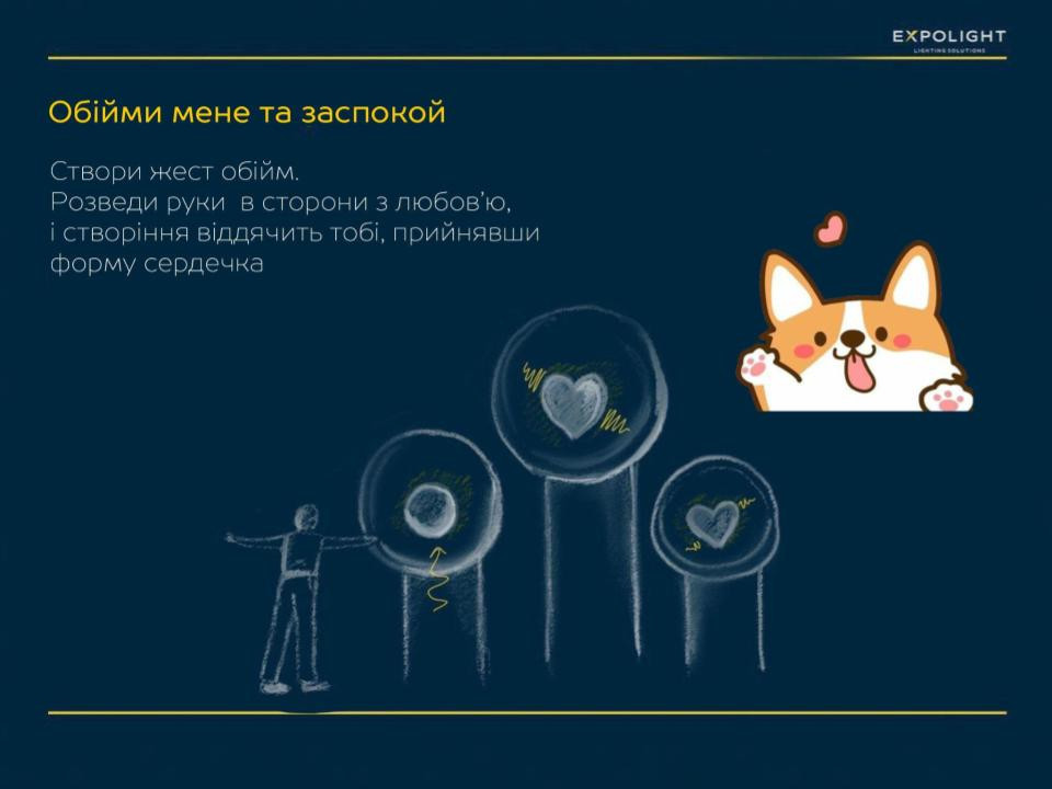 A special sensor system detects the movements of nearby residents, and the floor lamps start behaving like a virtual animal that is watching the guest with interest. In addition, you can get to know the animal and communicate with it through its movements: for example, if you wave at it, it will greet you in a certain way, or it will get scared and hide from your raised hands. And when no one is around, the animal continues to live and move.