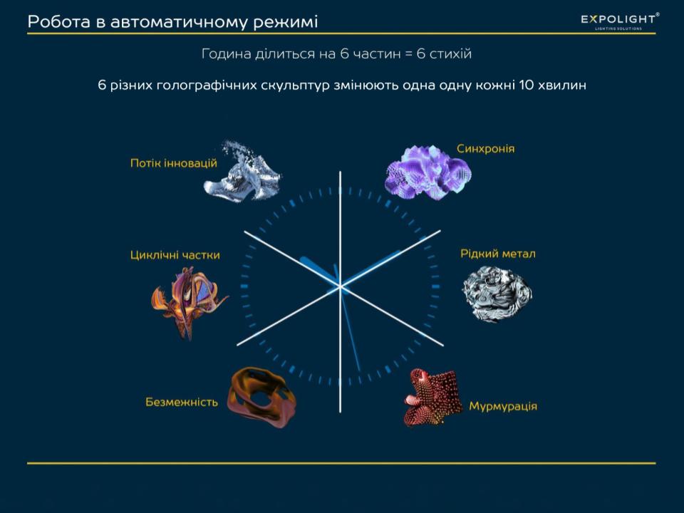 For this purpose, we created a transparent glass screen with a digital holographic sculpture above the entrance area, which displays various visual images based on Big Data in real time every 10 minutes, to which we carefully selected a symbolic meaning and name. The screen is also complemented by convenient widgets for guests (time, date, weather, etc.).