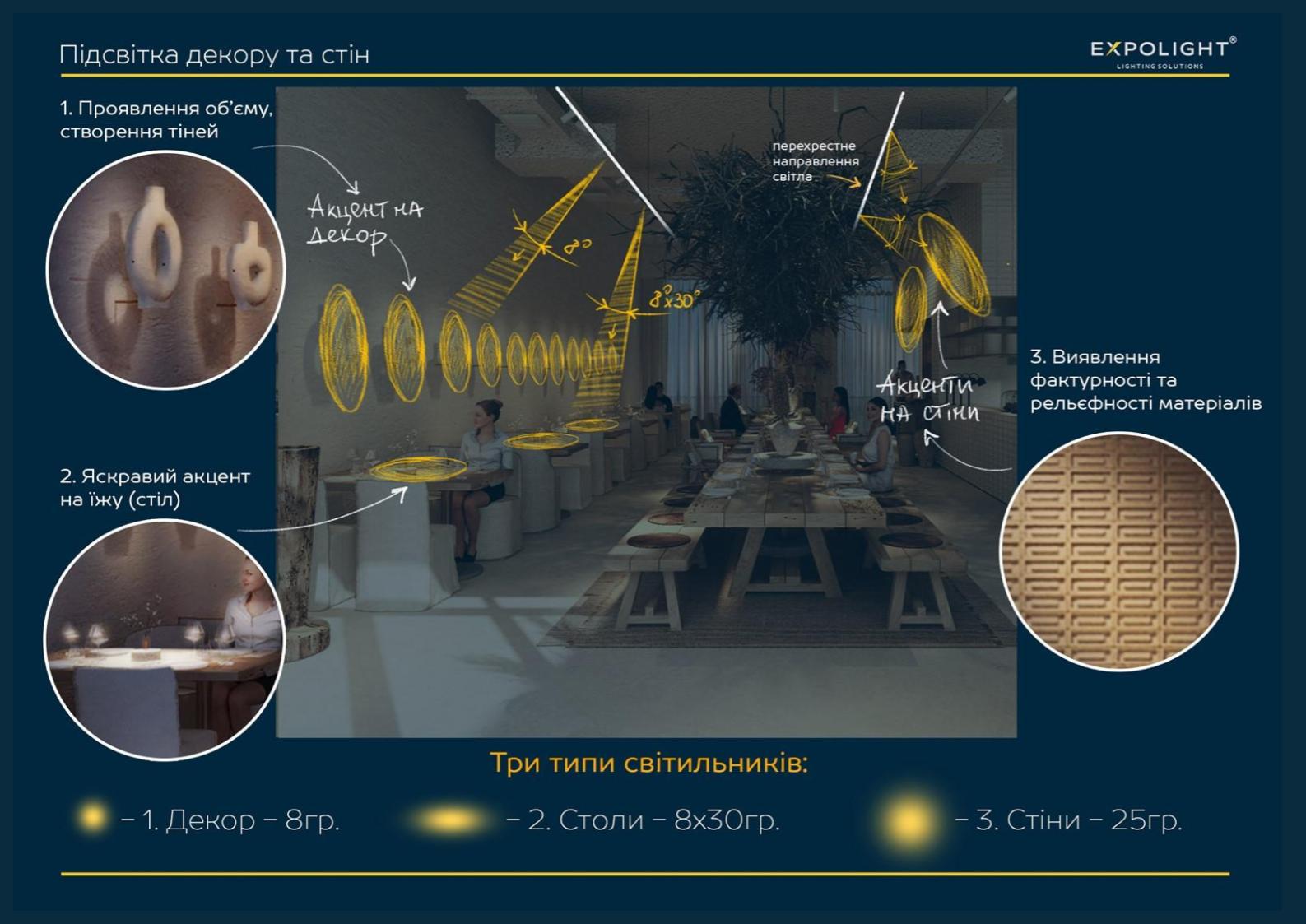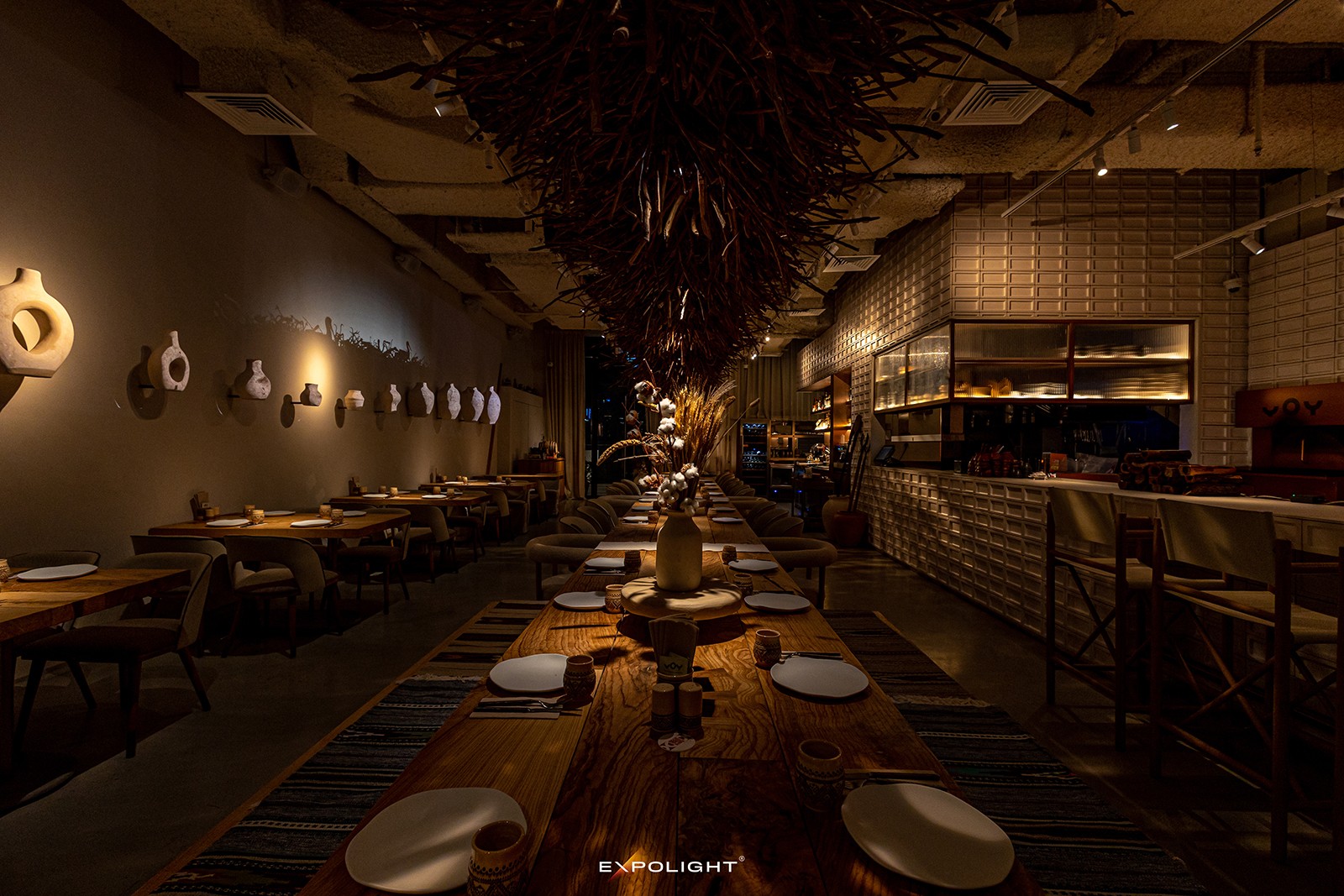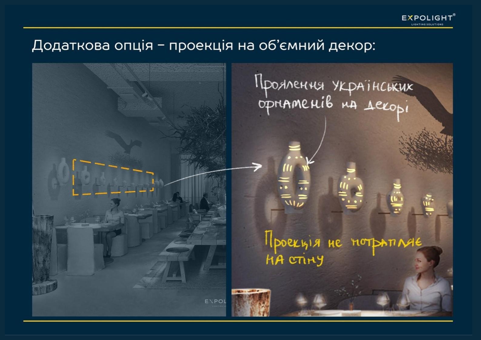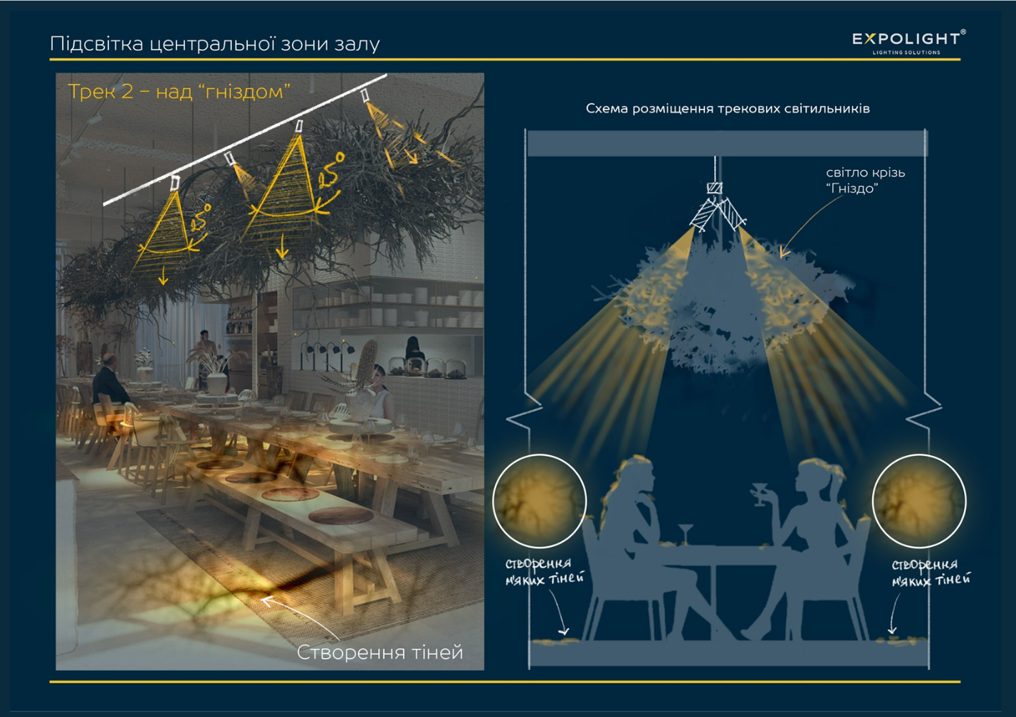 One of the central elements is like a giant stork's nest - the brightest and most potent Ukrainian symbol. With the help of different principles of lighting from the inside, we showed silhouettes of shadows from the branches to the floor. We supplemented this concept with a projection on the wall, where the chicks grow up, fly away for the winter, and then return home. This symbolizes the cycle of life, when a person leaves his homeland but does not forget his native land, reaches for it, and eventually returns to it.