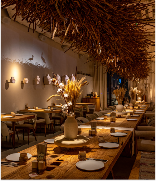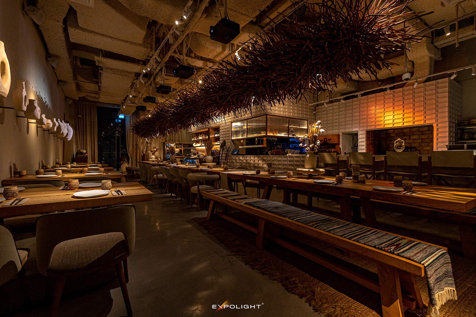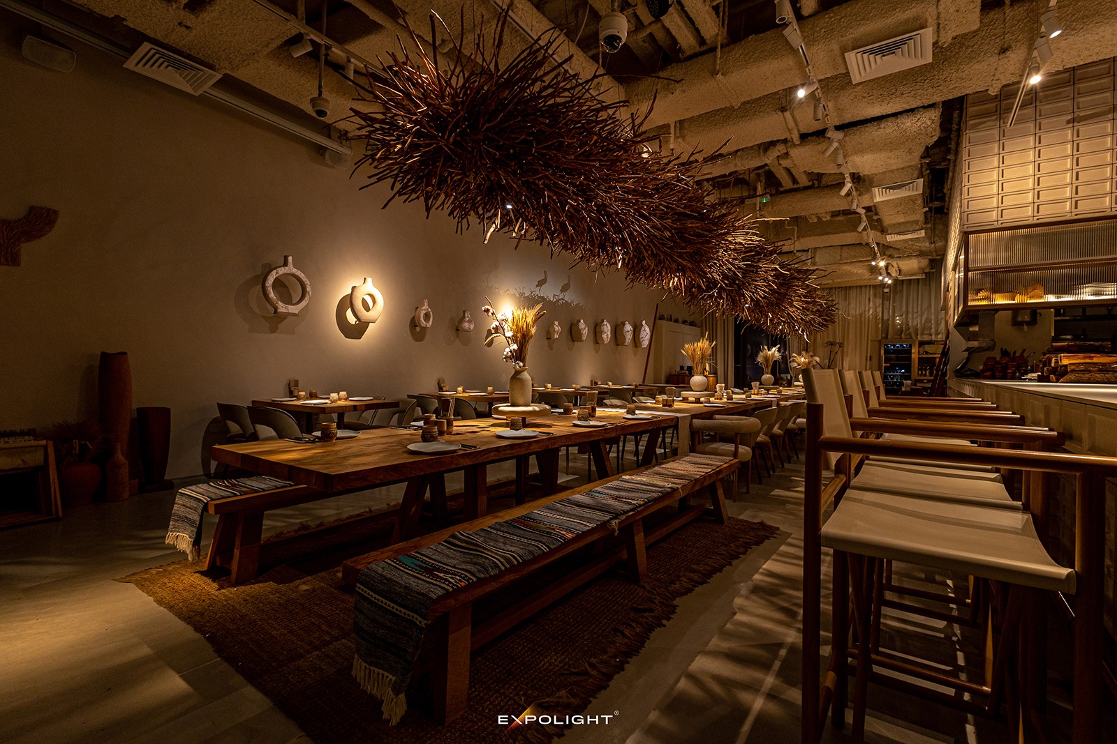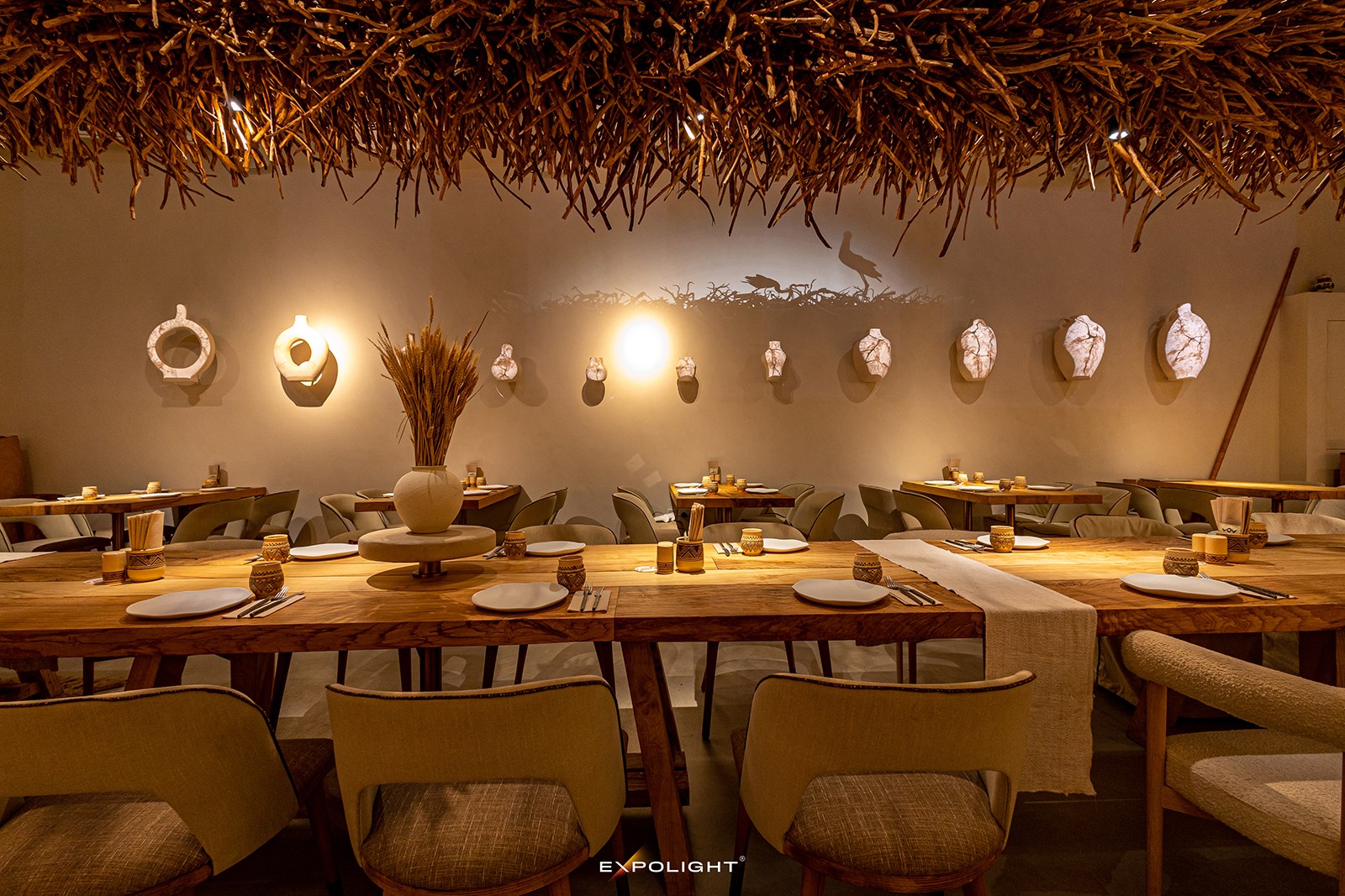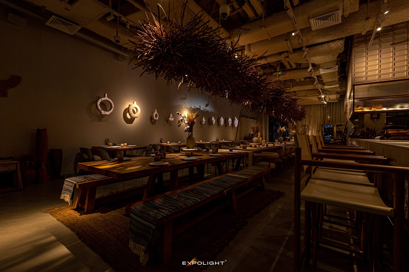 One of the central elements is like a giant stork's nest - the brightest and most potent Ukrainian symbol. With the help of different principles of lighting from the inside, we showed silhouettes of shadows from the branches to the floor. We supplemented this concept with a projection on the wall, where the chicks grow up, fly away for the winter, and then return home. This symbolizes the cycle of life, when a person leaves his homeland but does not forget his native land, reaches for it, and eventually returns to it.