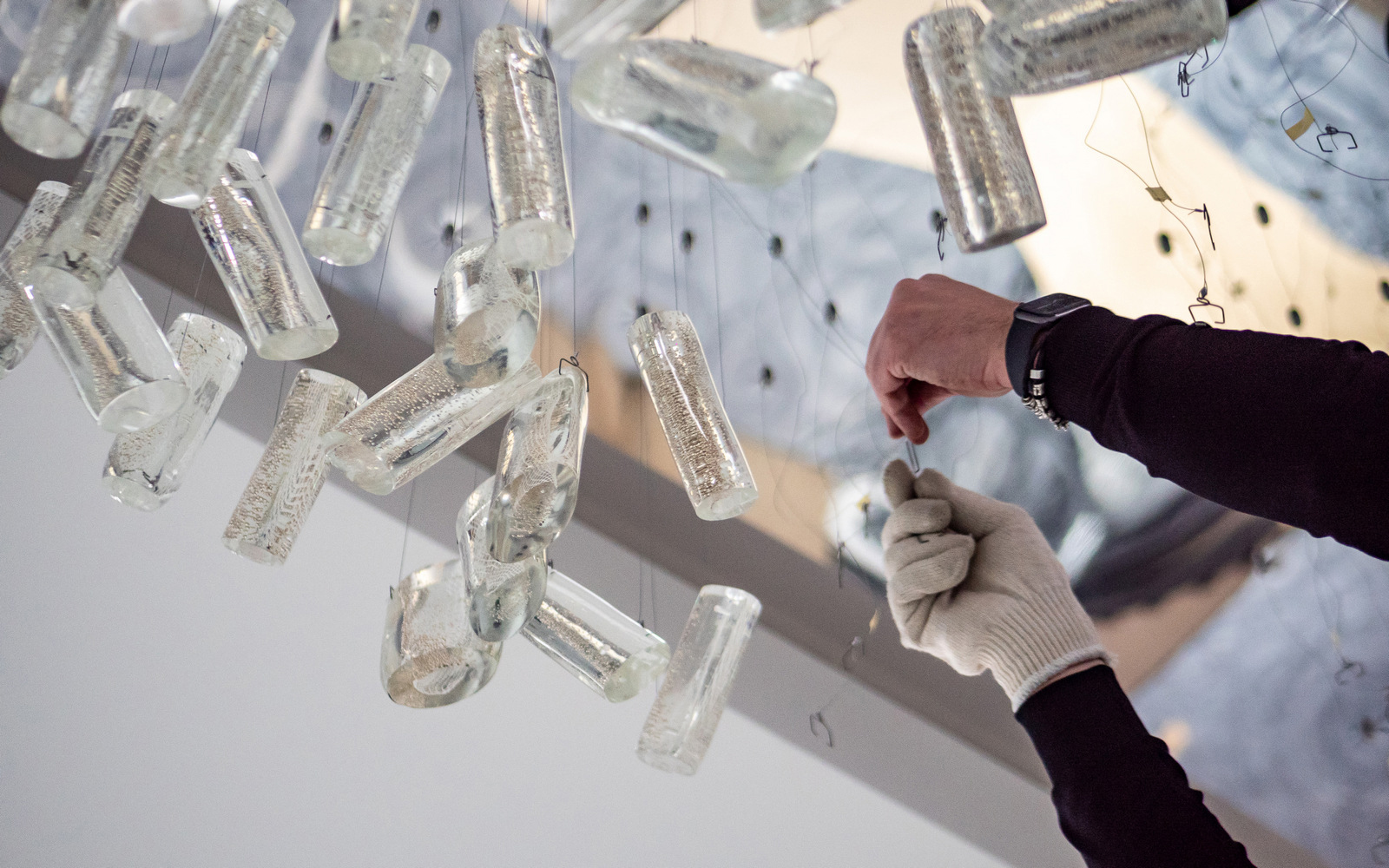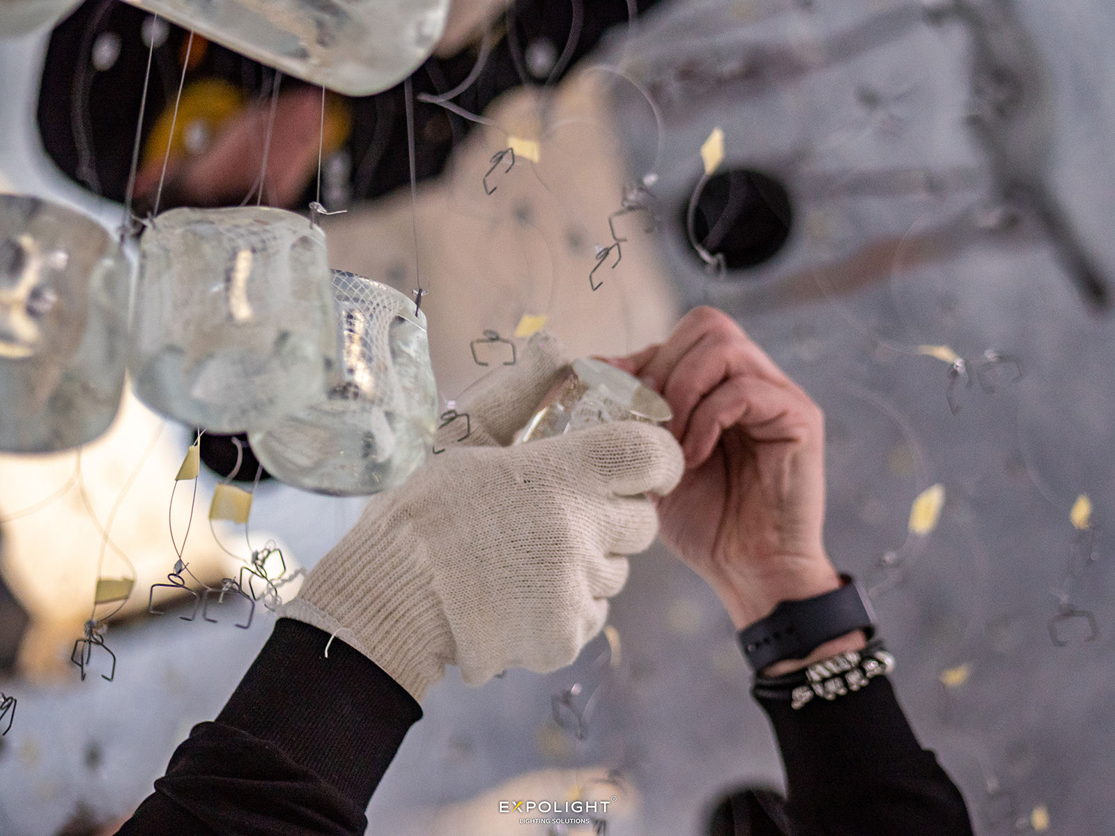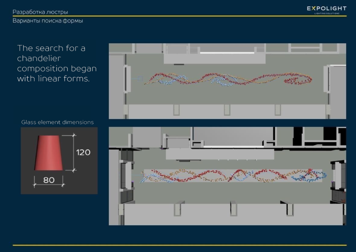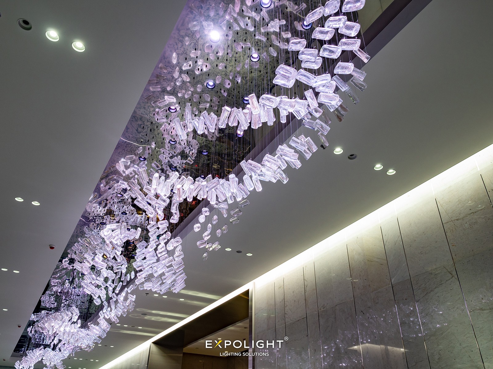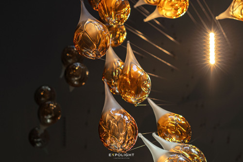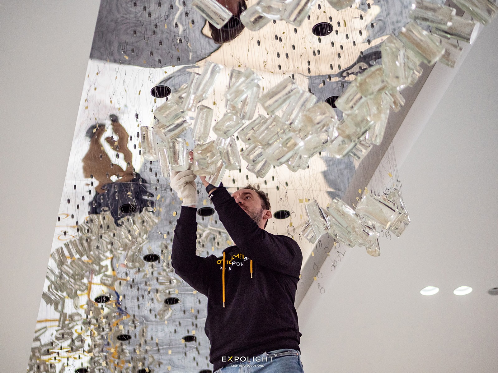 Сприйняття форми люстри змінюється в залежності від кута зору. Також вона дуже добре сприймається з вулиці через великі скляні вікна на першому поверсі.