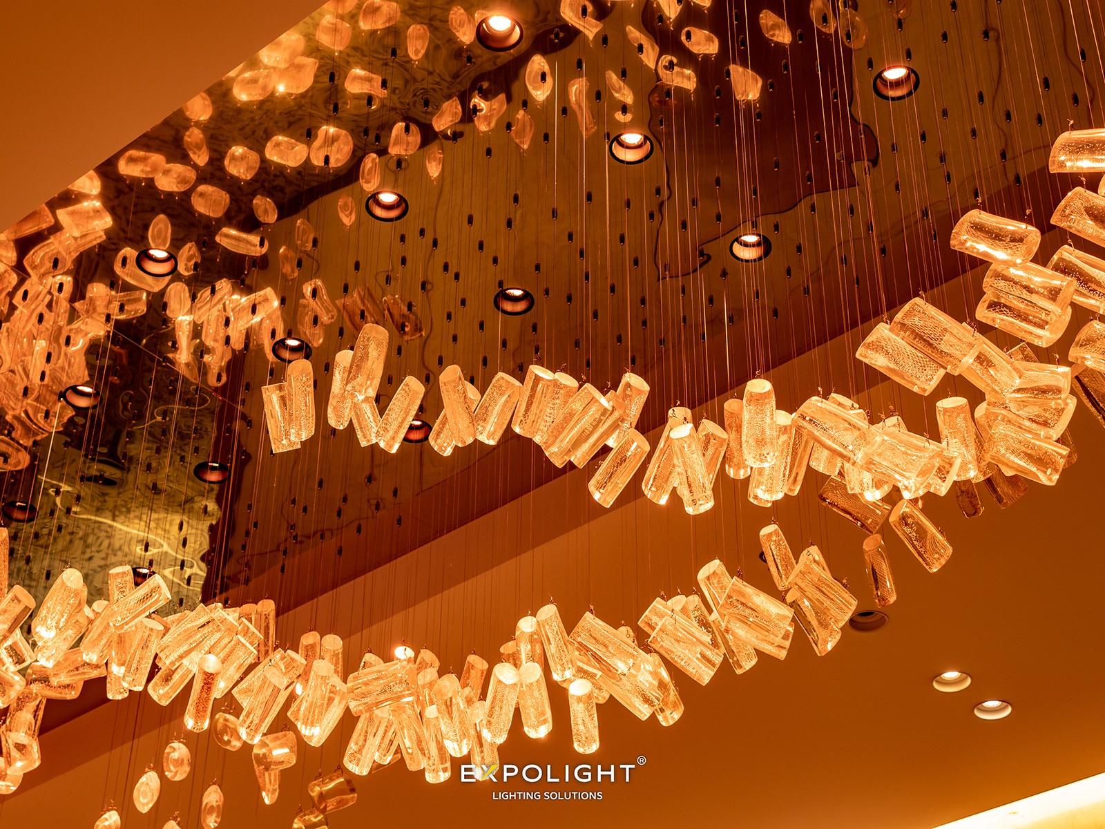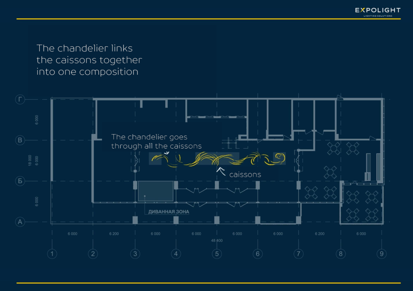 Ми розробили не тільки дизайн освітлення, а й саму люстру унікальної форми. Вона була обрана таким чином, щоб сприйматися як скульптура посередині. А щоб покращити сприйняття та візуально розширити простір, ми зробили дзеркальну стелю над люстрою.