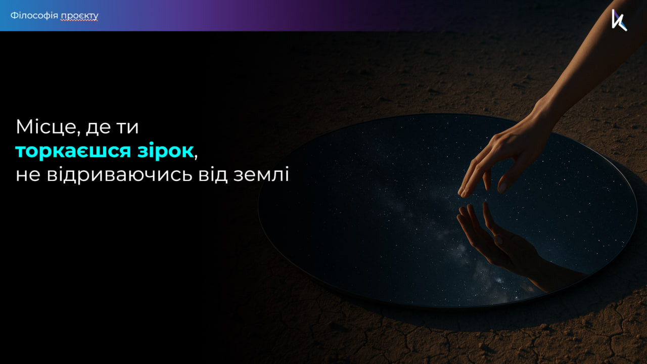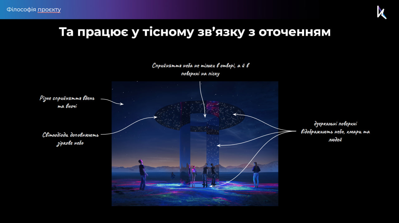 Інсталяція побудована на оптичних ефектах і грі світла, які перетворюють простір на живу взаємодію. Вона "вкорінює" небо в землю, створюючи ілюзію, що небо оточує людину з усіх боків — і згори, і знизу. Цей стан злиття з нескінченним пробуджує відчуття цілісності, надихає, заспокоює й відкриває нові горизонти для творчості.