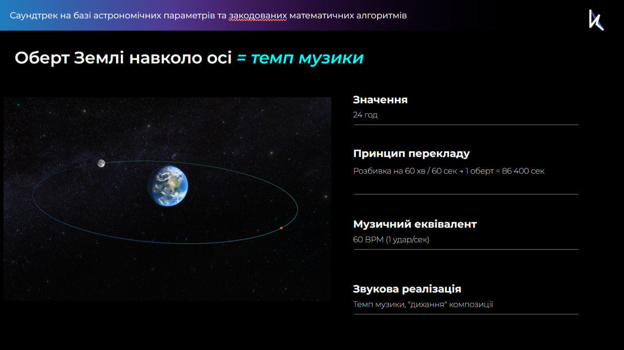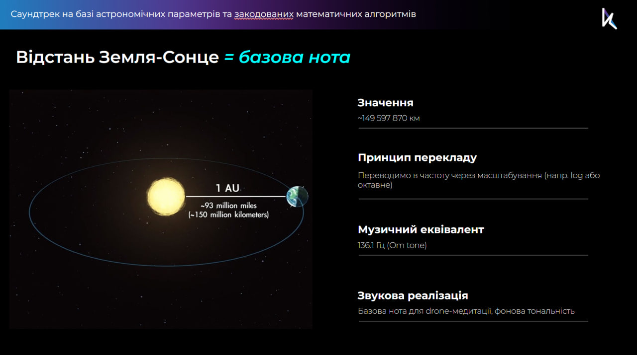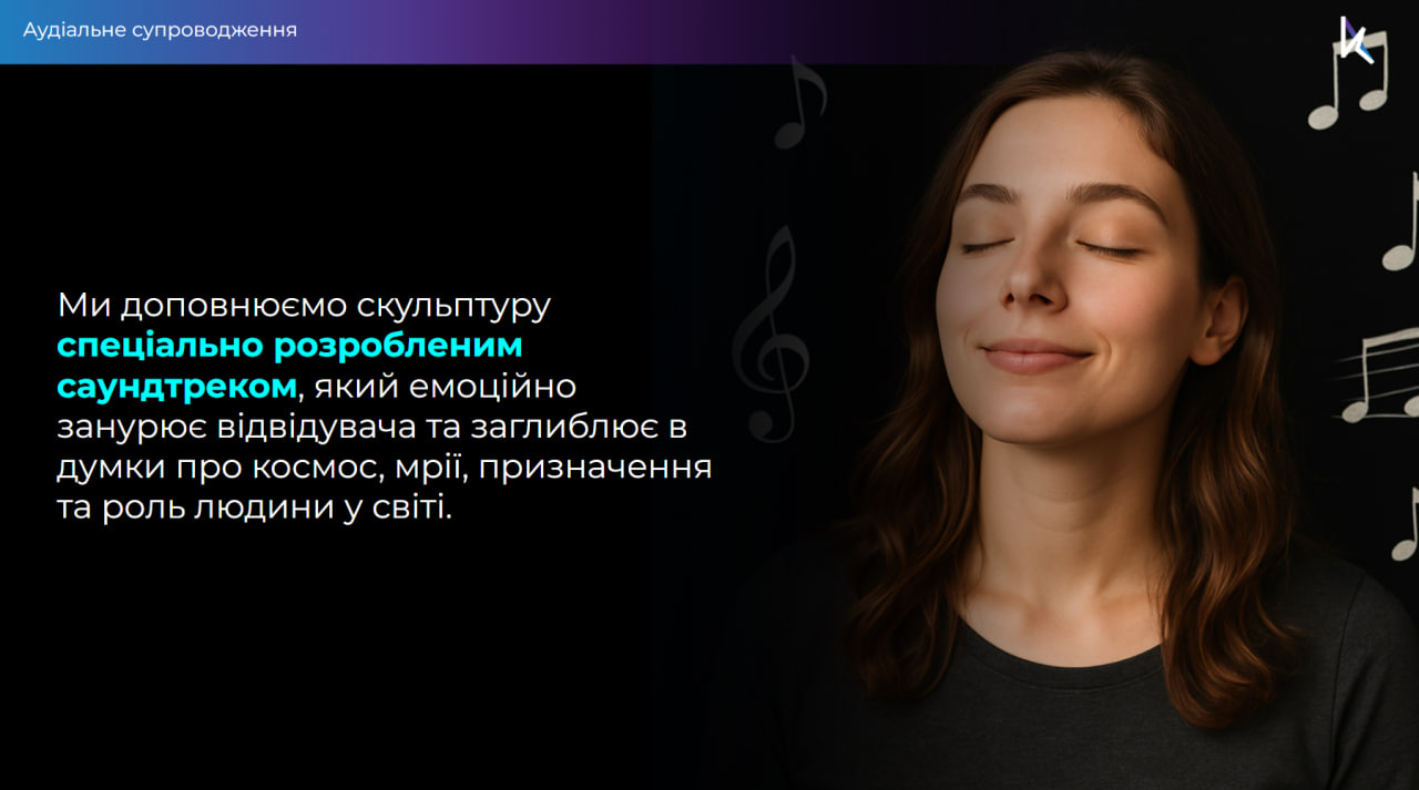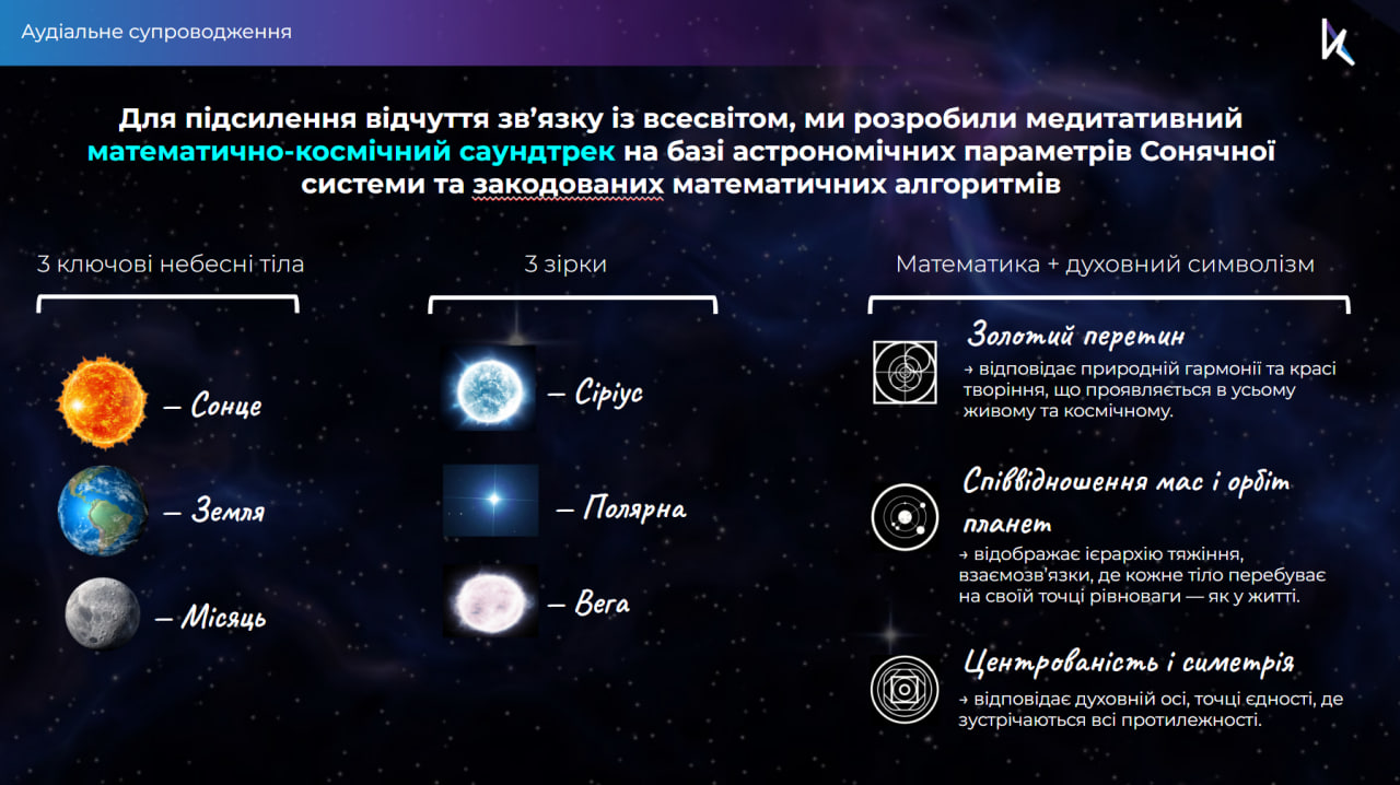 Всередині розміщена акустична система, яка формує звукове середовище. Воно побудоване на математичних закономірностях і гармонійних співвідношеннях, що відсилають до ідей архітектоніки й космічних ритмів. Інсталяція задіює зір, слух і дотик, відкриваючи нові виміри сприйняття. Такий мультисенсорний підхід підсилює її медитативність і дозволяє кожному пережити особистий момент єдності.