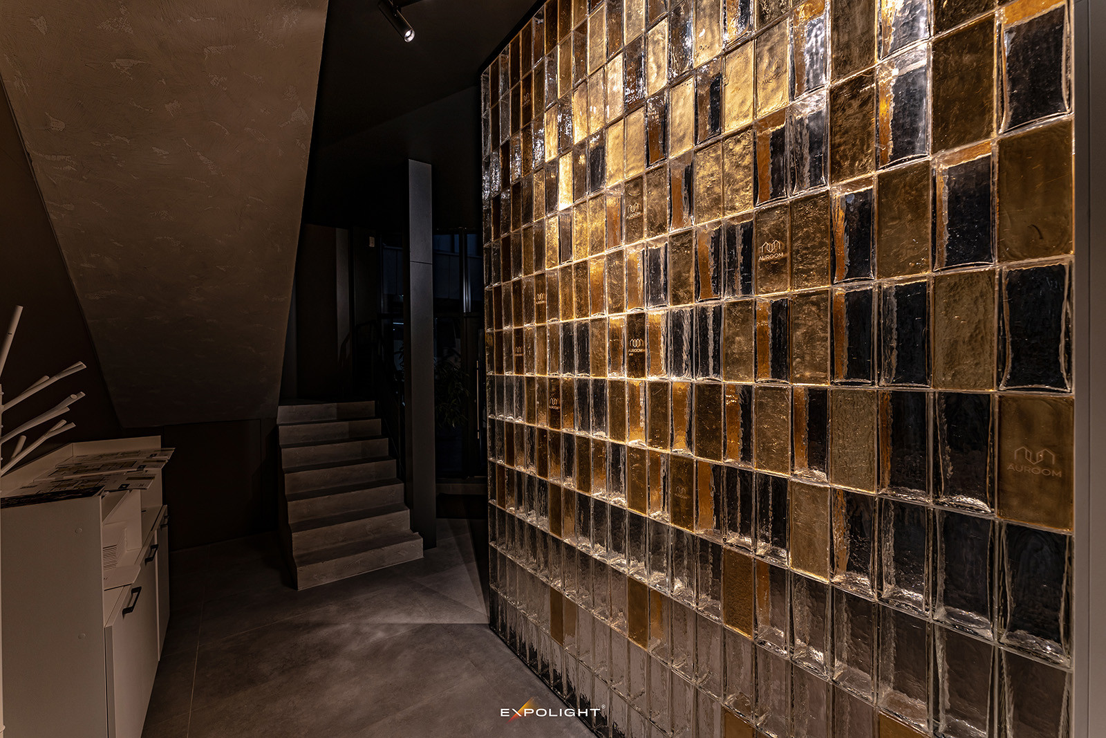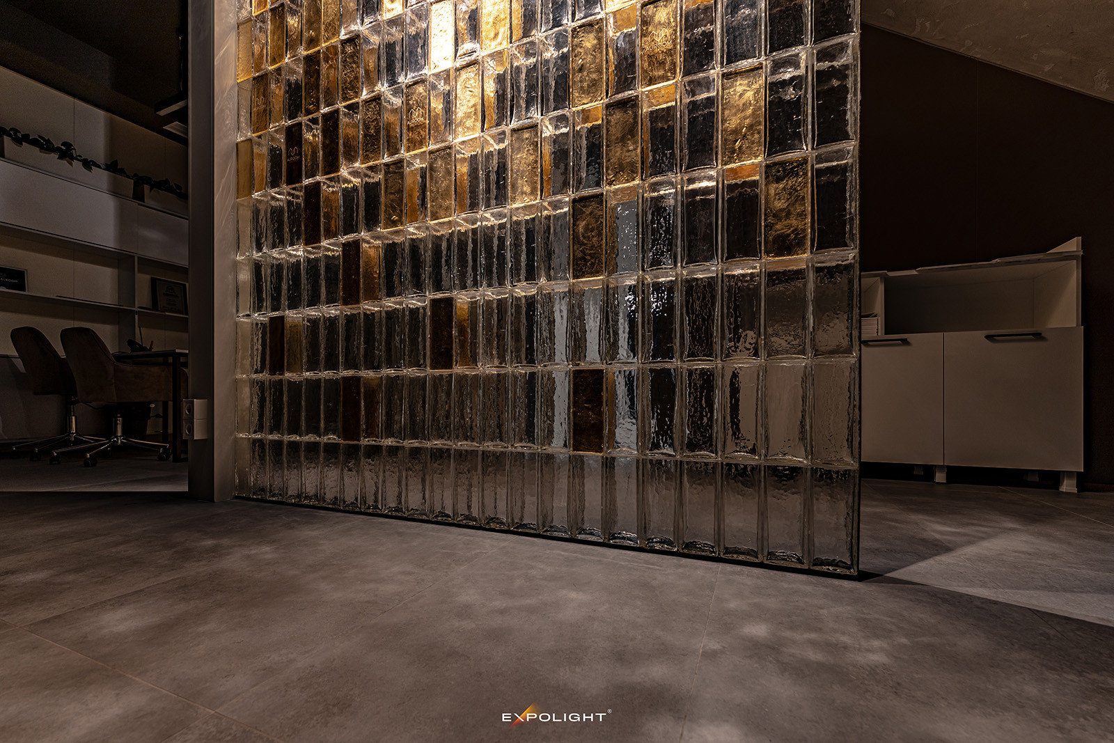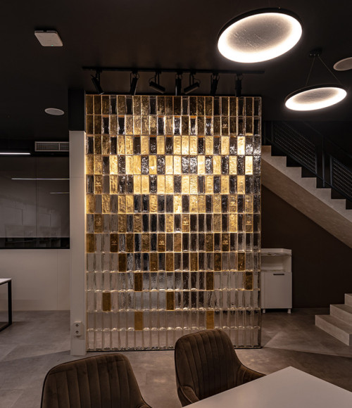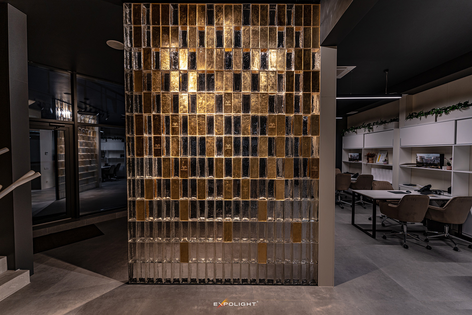 Ми придумали розробити спеціальні модулі з крафтових скляних блоків зі складним ефектом золотих злитків, з додатковим нанесенням логотипа компанії в нашій склодувній лабораторії Optical Metaphor.