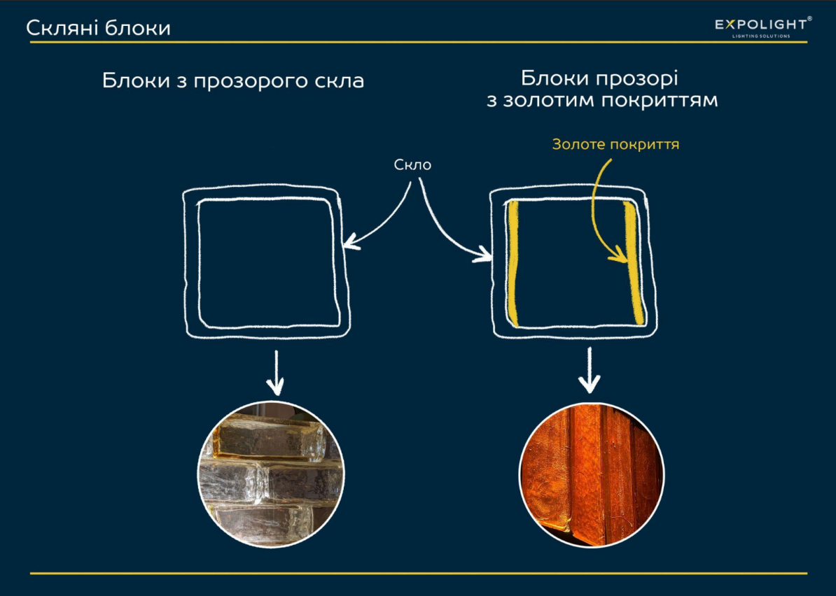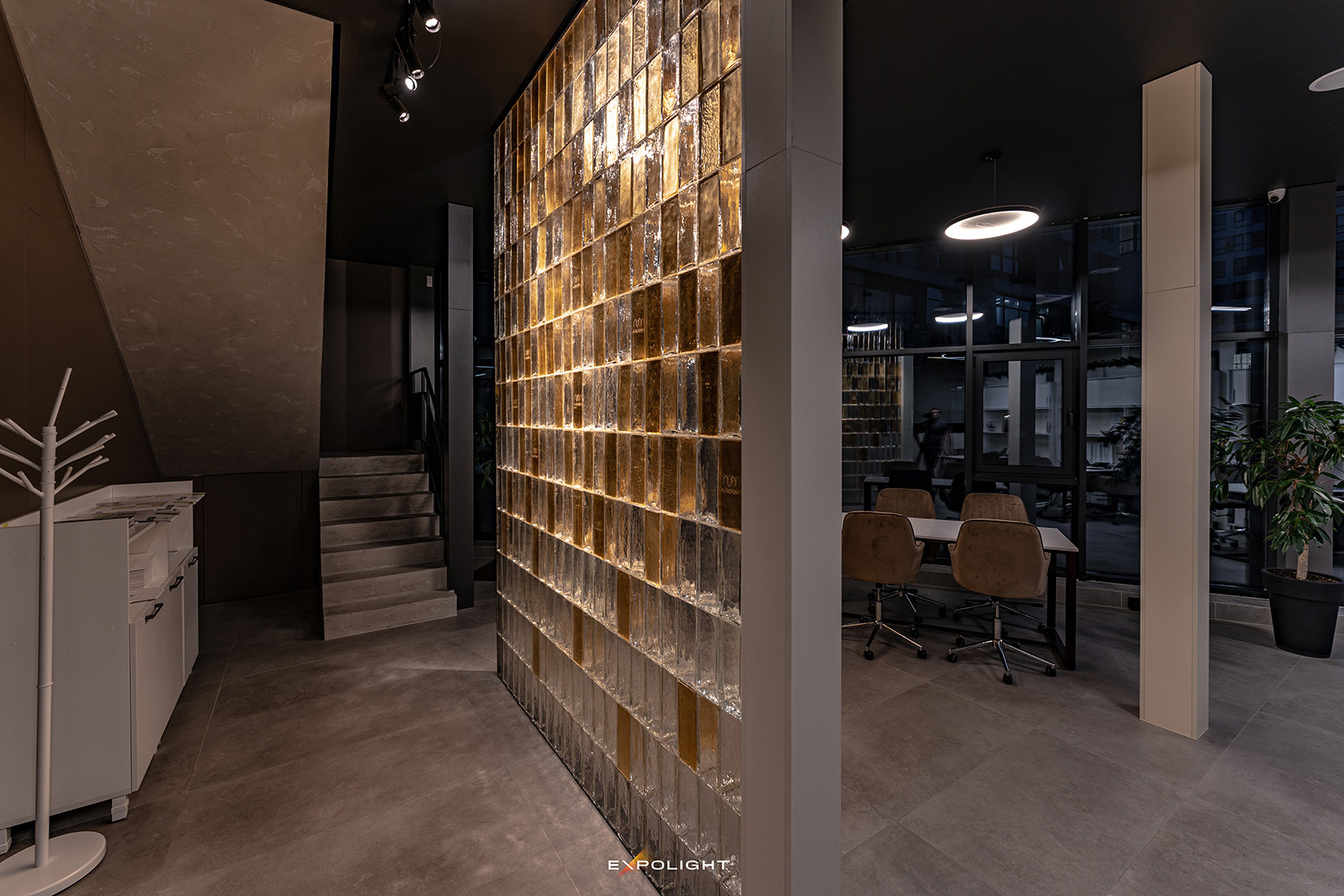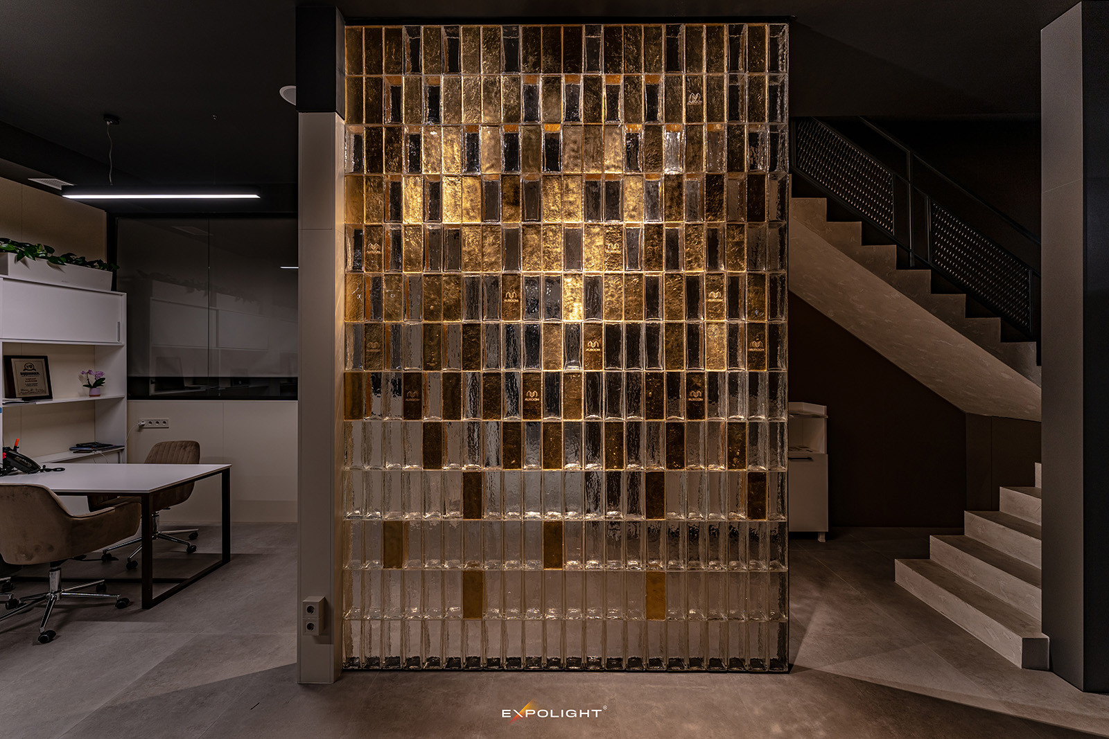 Ми придумали розробити спеціальні модулі з крафтових скляних блоків зі складним ефектом золотих злитків, з додатковим нанесенням логотипа компанії в нашій склодувній лабораторії Optical Metaphor.