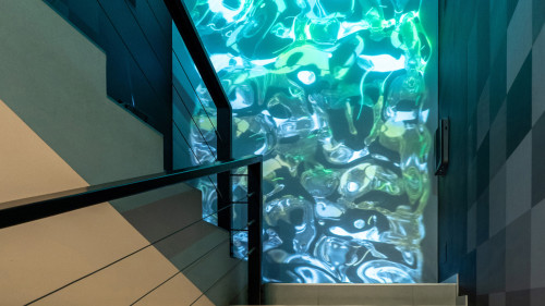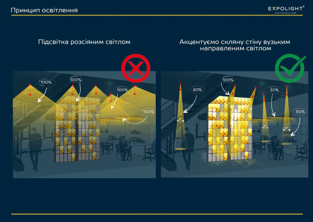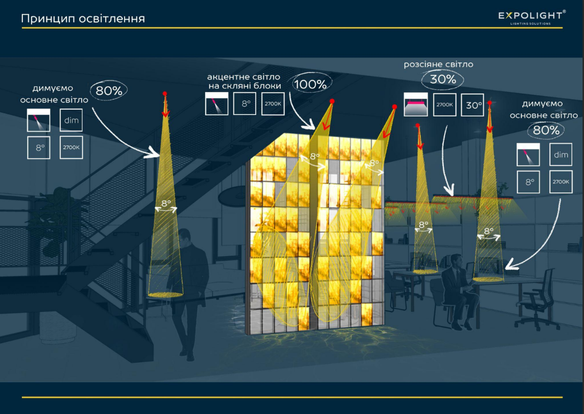 Ми поєднали прозорі скляні модулі й непрозорі золоті, з нерівномірним чергуванням других зверху вниз, що б було відчуття наче вони висять у повітрі. Верхні ряди суцільні, а до низу розріджуються та майже зникають.