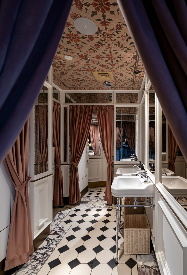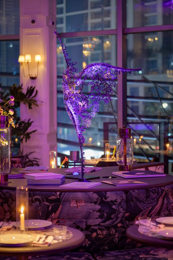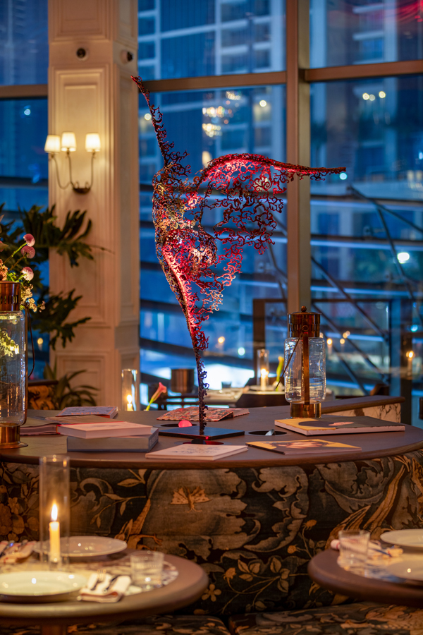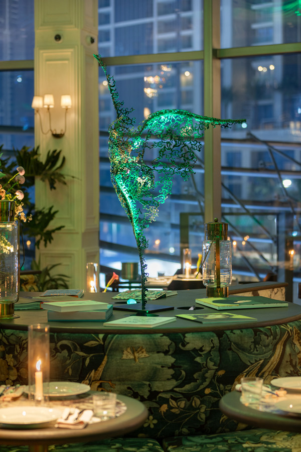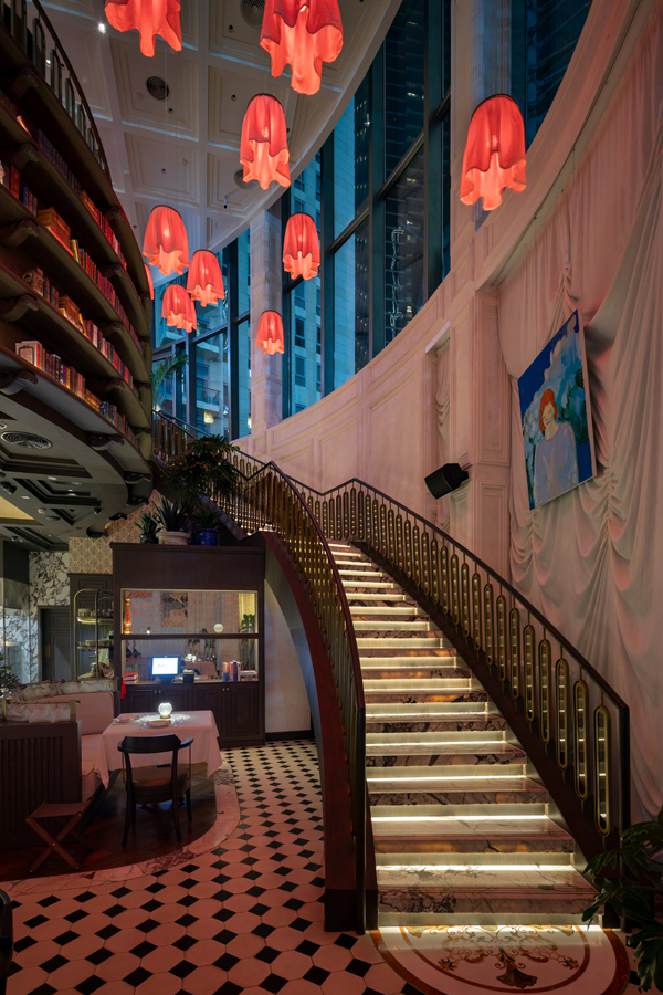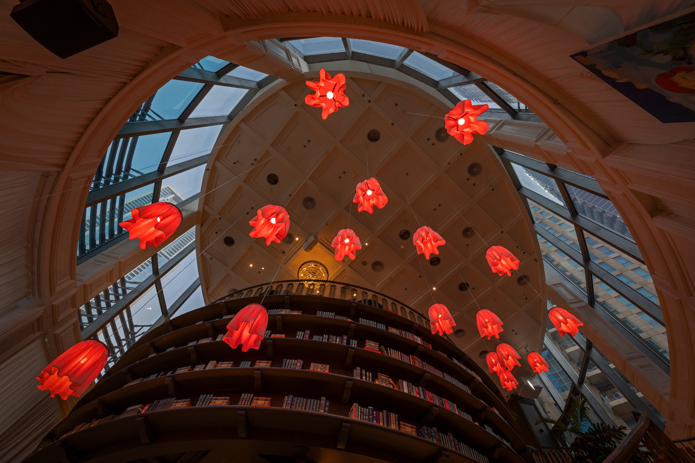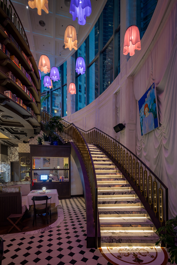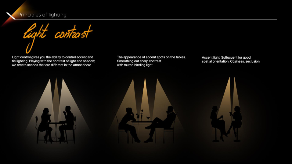 Кольори м’яко змінюються впродовж дня по температурі та відтінкам, перетворюючи їх на живі квіти, які розквітають у повітрі. Також ми акцентно з теплою прихованою підсвіткою виділяємо зону бару, щоб привернути увагу гостей до захоплюючого процесу створення ексклюзивних страв.