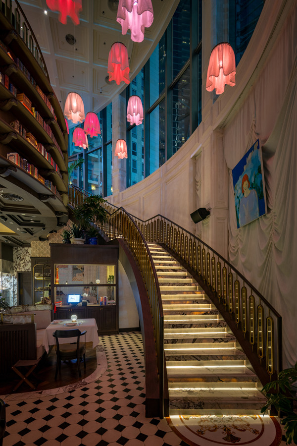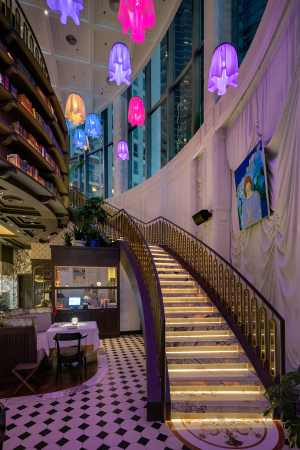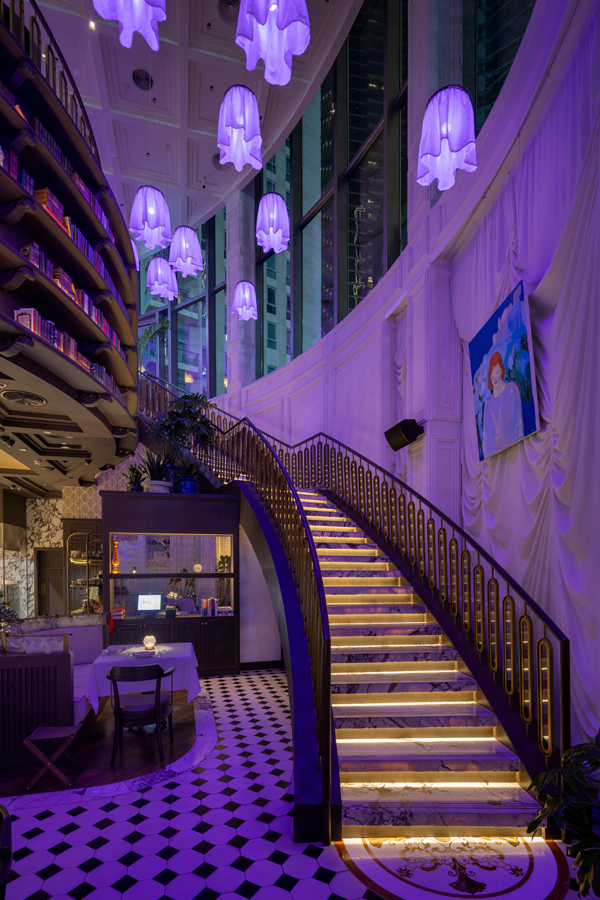 Великі сходи, що ведуть на другий поверх, також виділяємо світлом з різними сценаріями, які змінюються синхронно з усім простором.