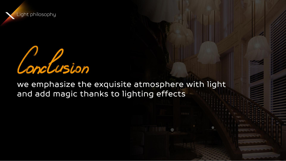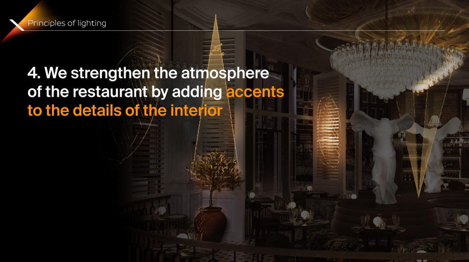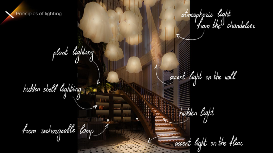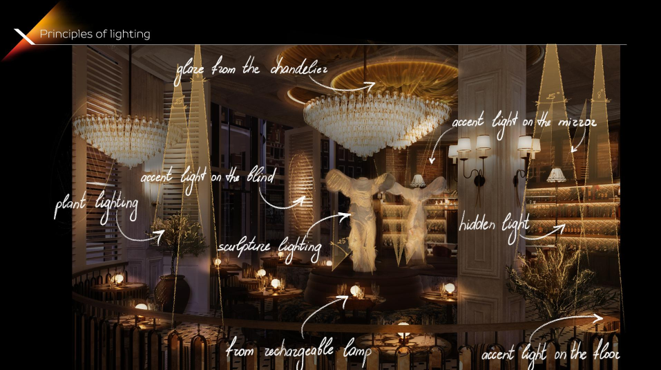 Ми використовуємо архітектурне світло, щоб підкреслити дизайн інтер'єру та проявити тактильність і його елементи. На першому поверсі ми працювали над ієрархічністю елементів, де головною зіркою є декоративні підвішені світильники.