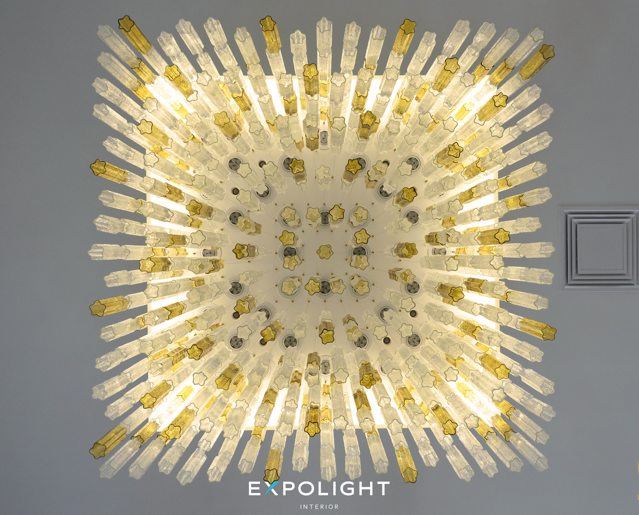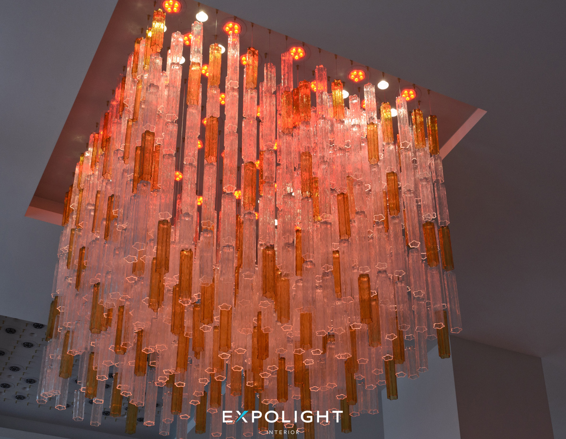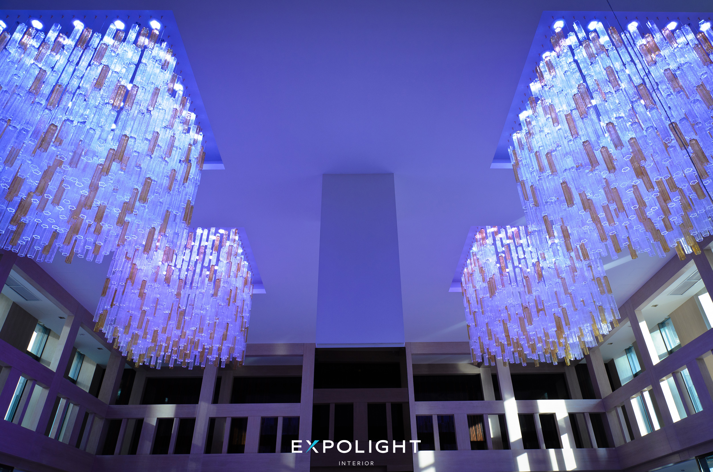 У нашій склодувній майстерні Optical Metaphor ми дослідили кут падіння сонячних променів і розмістили на люстрі скляні призми, щоб максимально вдало підібрати її форму. Об'єми були спроектовані таким чином, щоб вони органічно виглядали як в холі, так і на відкритій площі.