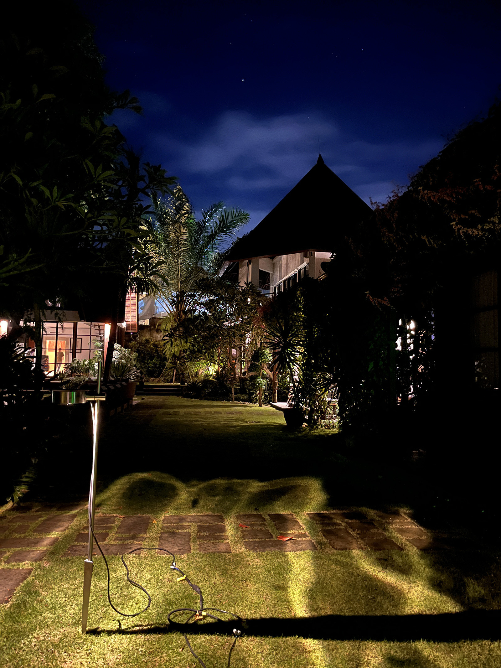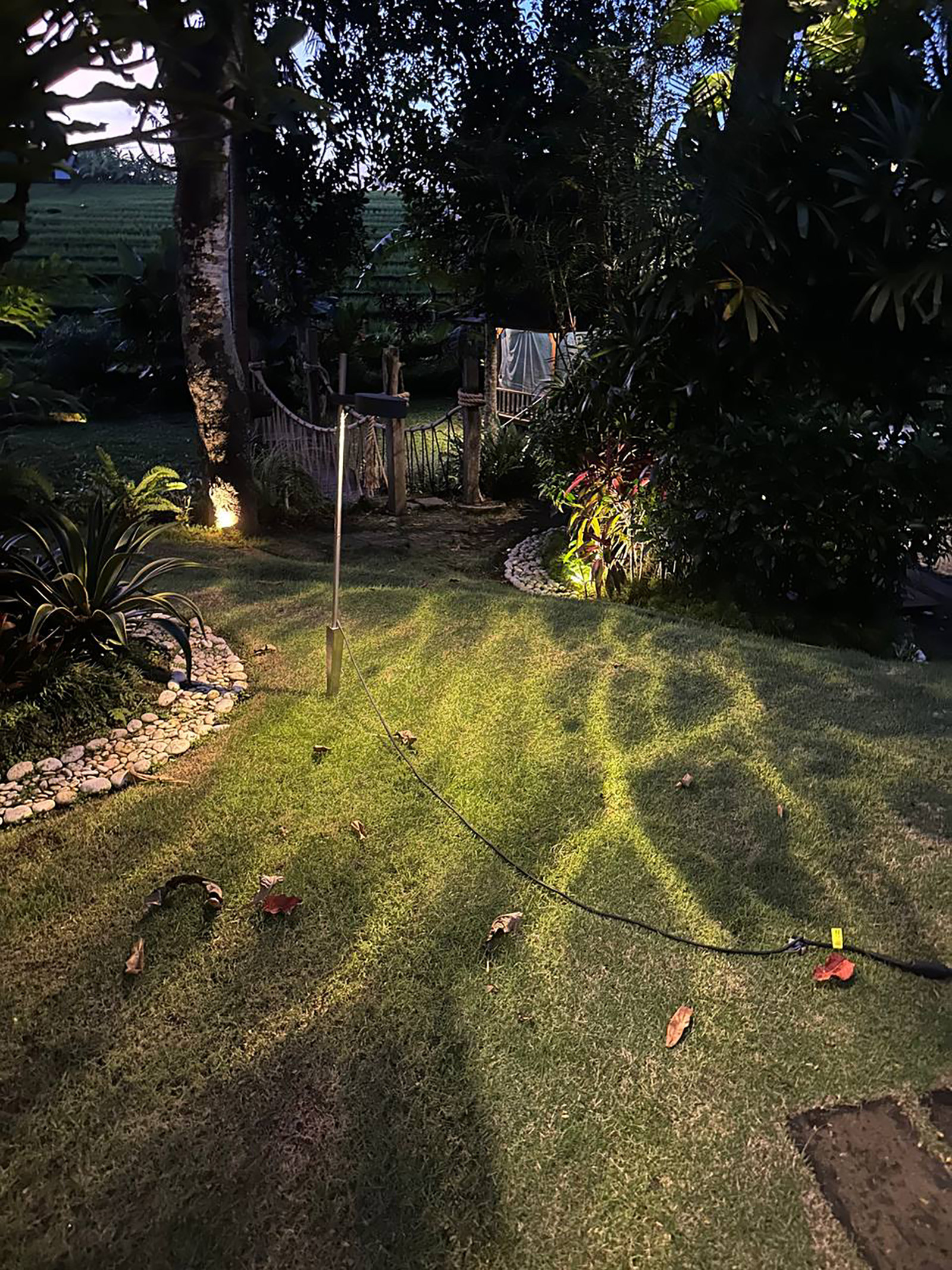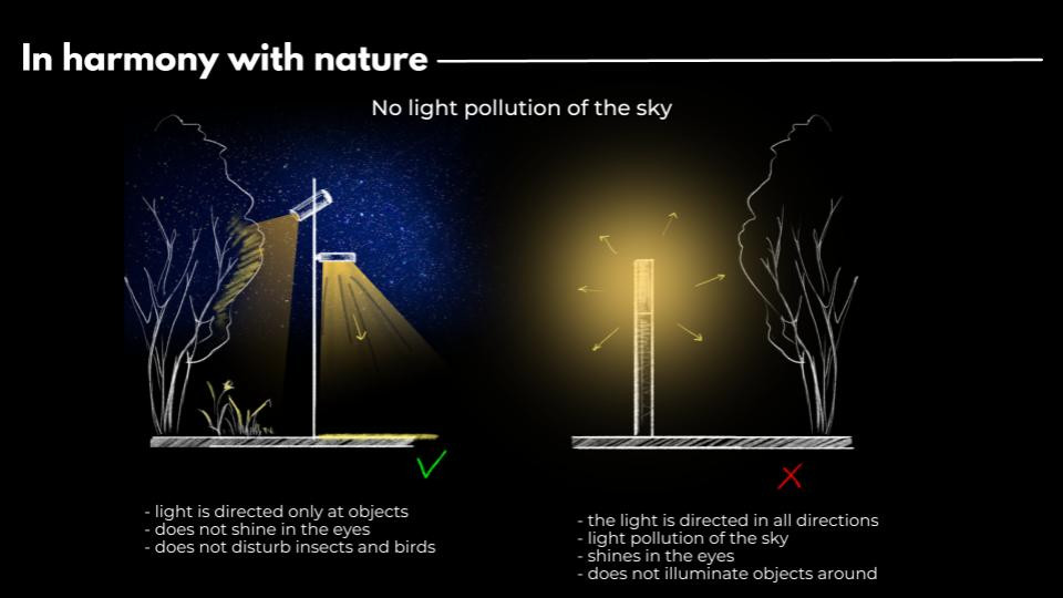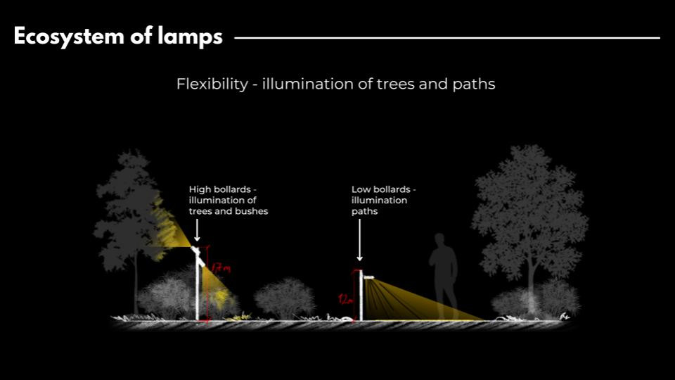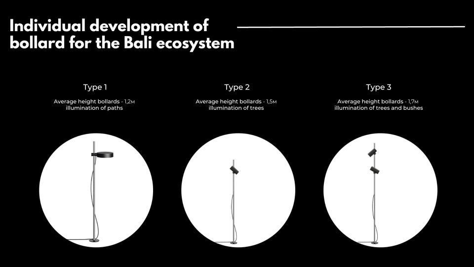 Щоб не зашкодити природнім біоритмам джунглів та людей в екопоселенні, ми налаштовуємо складну логіку димування світильника. На базі складної системи автоматизації, стовпчики професійно димуються по лінії доріжок, де проходить людина, і світло не заважає комахам.