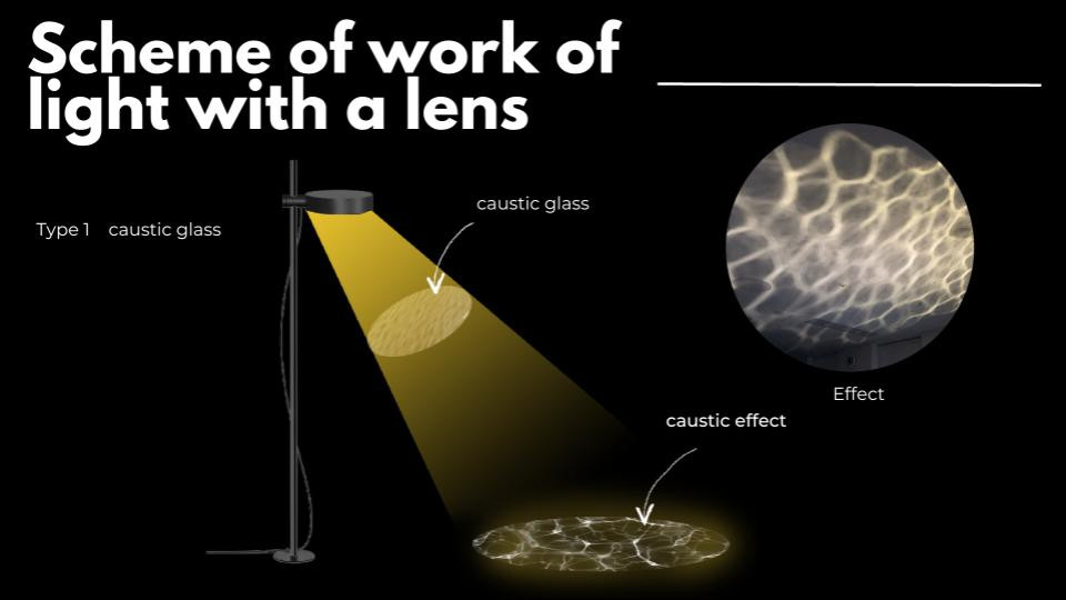 Додаткова лінза покриває діод та розмиває його край, щоб не було різких країв світлової плями і каустичний ефект плавно зникав.