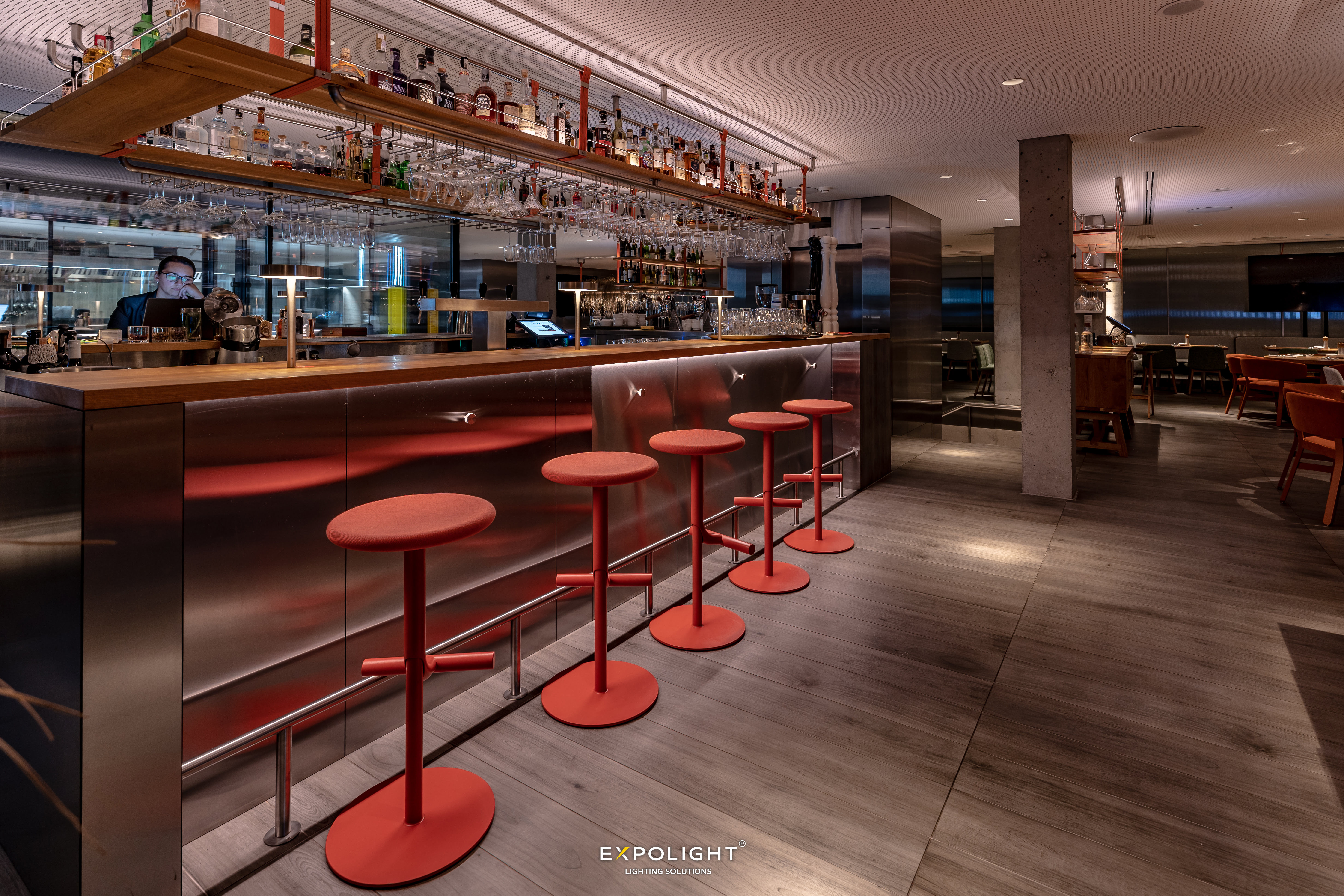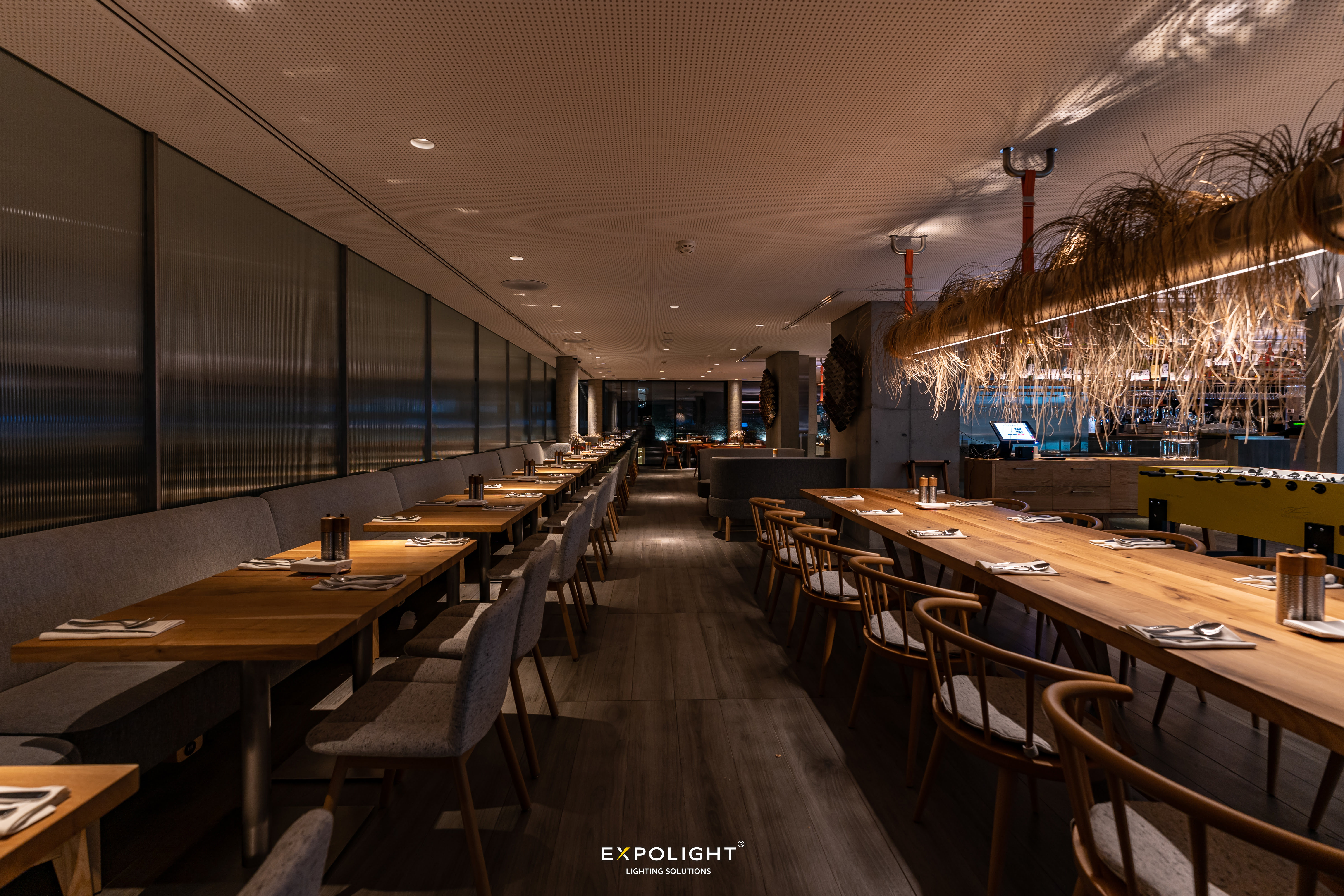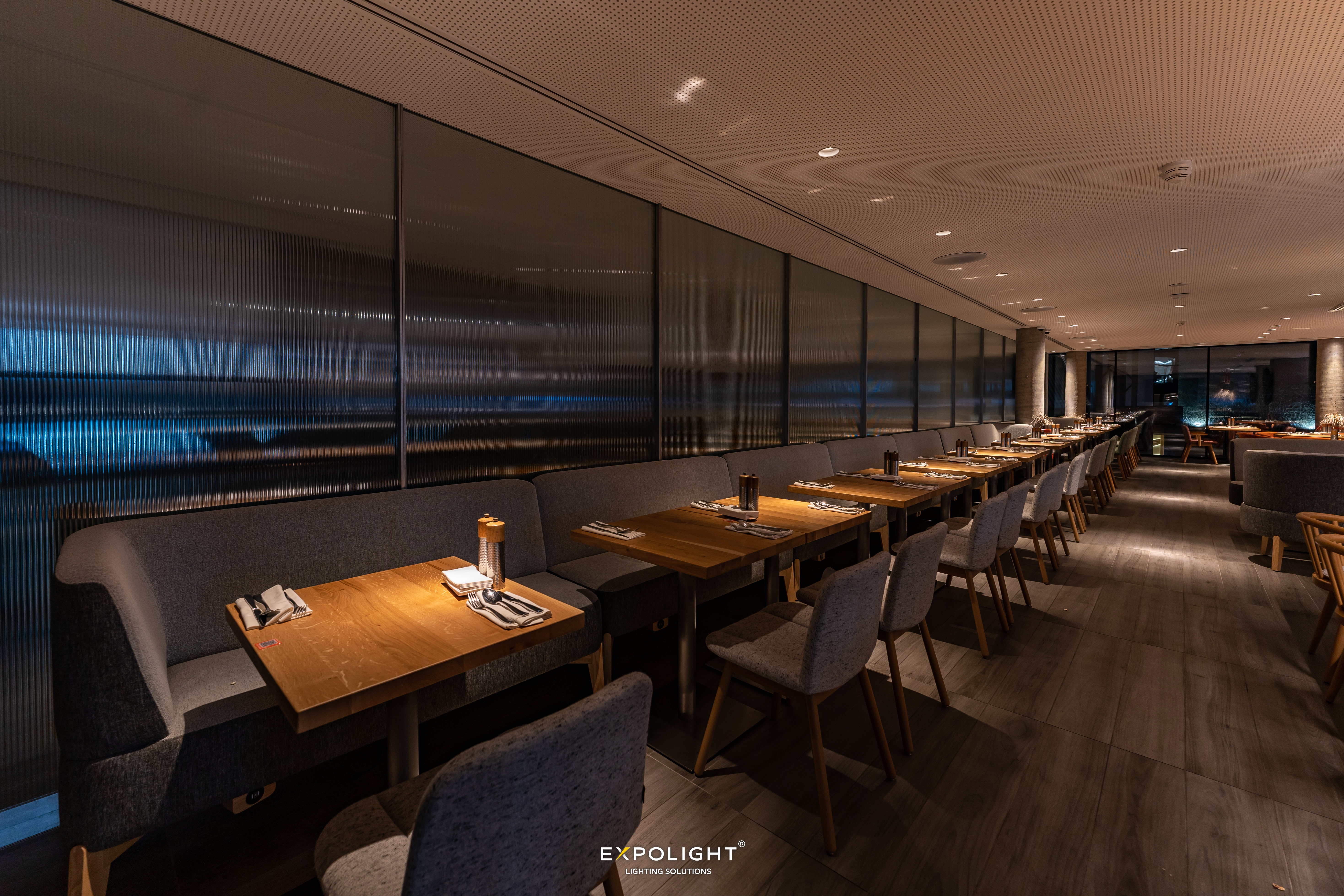 Цей заклад розташований у багатофункціональному готельному комплексі у мальовничій Львівській області, тому має панорамні вікна з видом та ліс та озеро. Стриманий дизайн інтер’єру був спрямований на те, щоб гості не відволікалися на зайве та насолоджувалися природою. Світлом ми доповнили цю концепцію, зробивши його керованим та м’яким, щоб у будь-який час доби воно підлаштовувалося під біоритми людини та створювало затишну для перебування атмосферу.