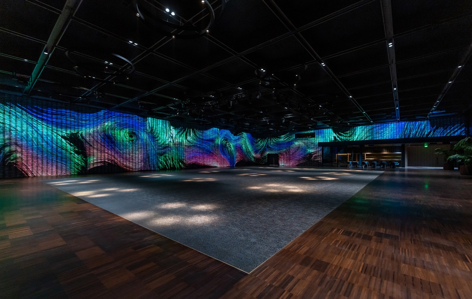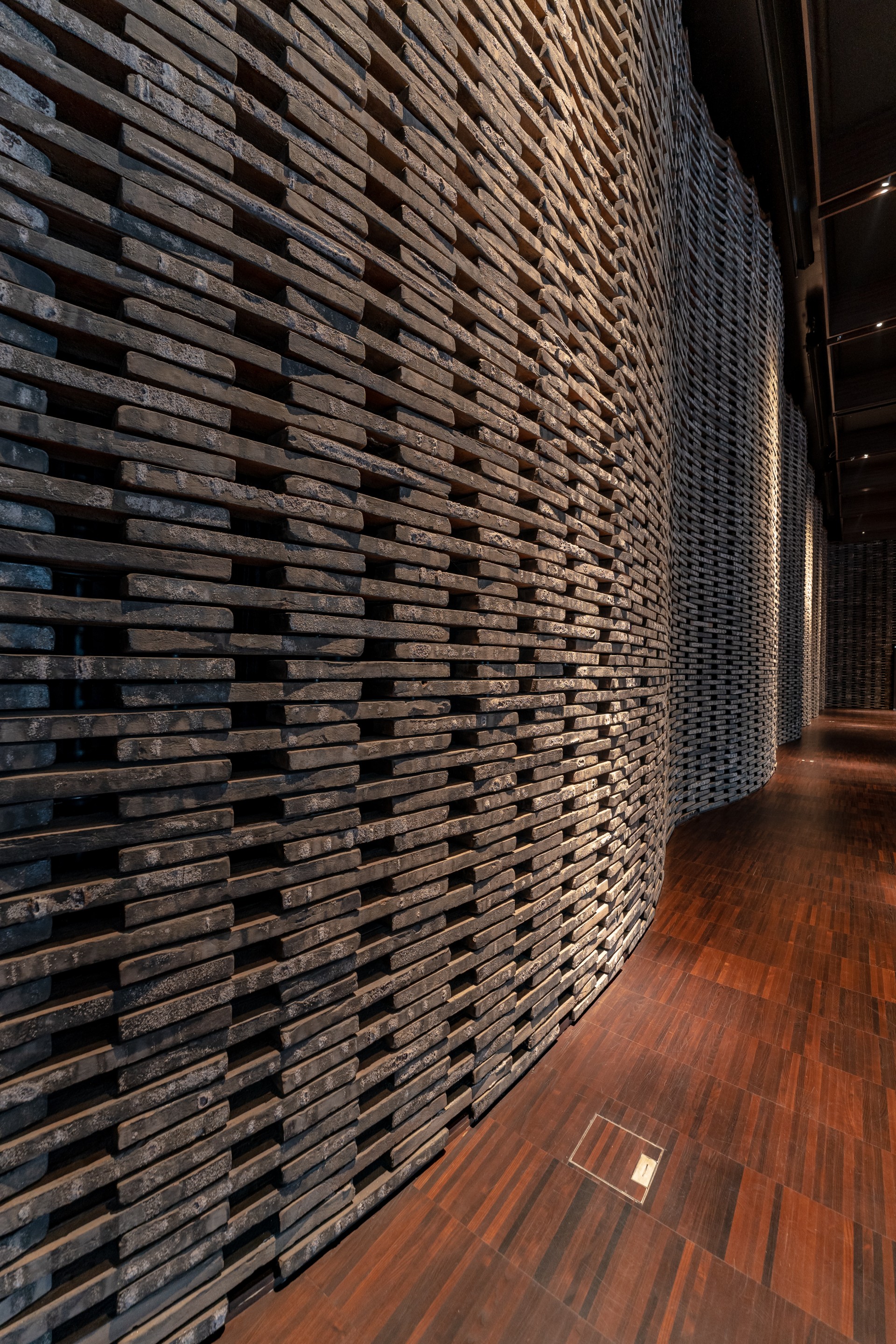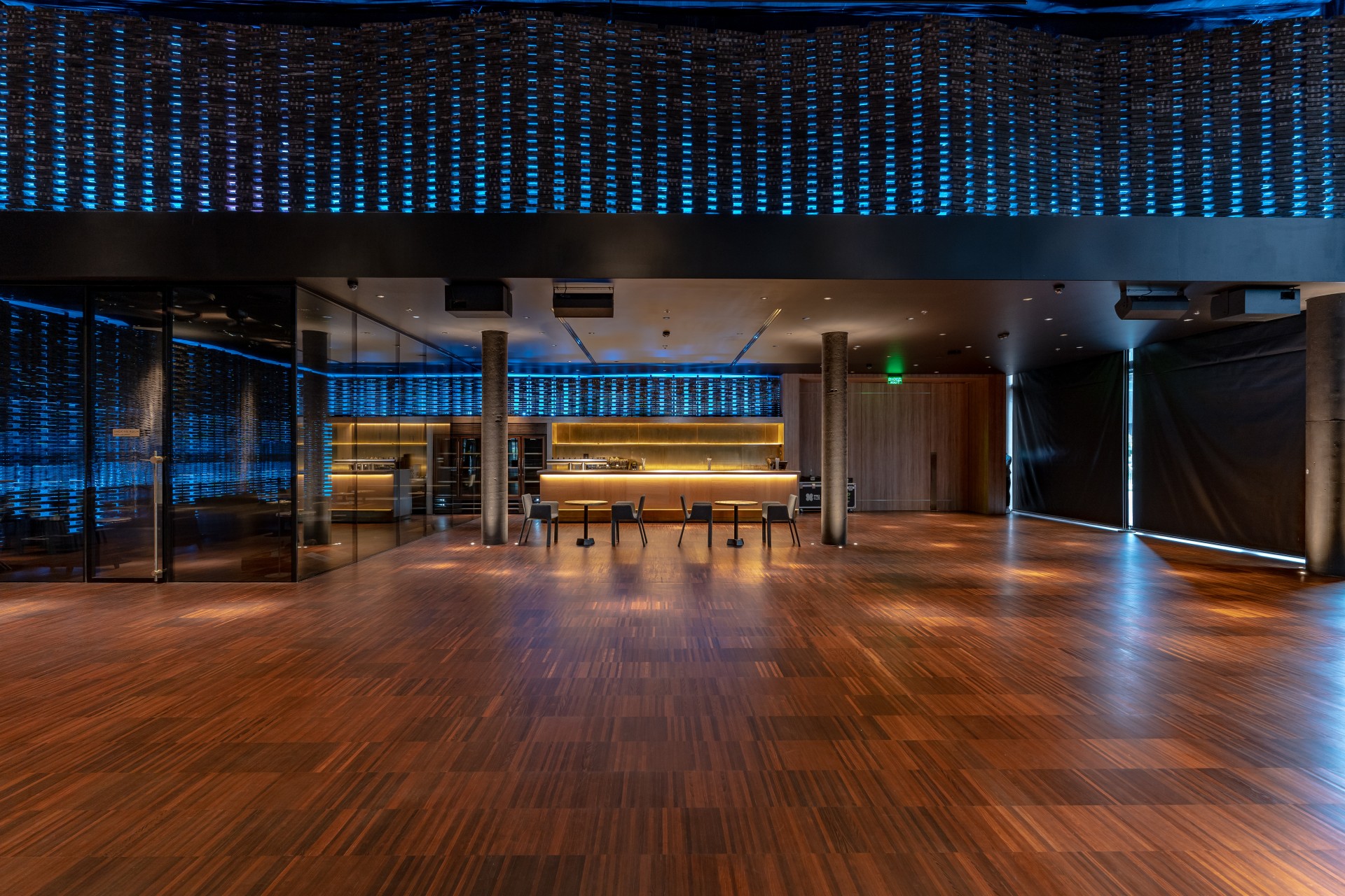 Цей івент-хол знаходиться в готельному комплексі преміум-класу біля озера посеред лісу. Покриваючи площу 2 000 квадратних метрів, 28 тонн цегли, нанизані на металеві струни без підтримки, створюють унікальну хвилясту стіну, яку ми використали в якості екрану.