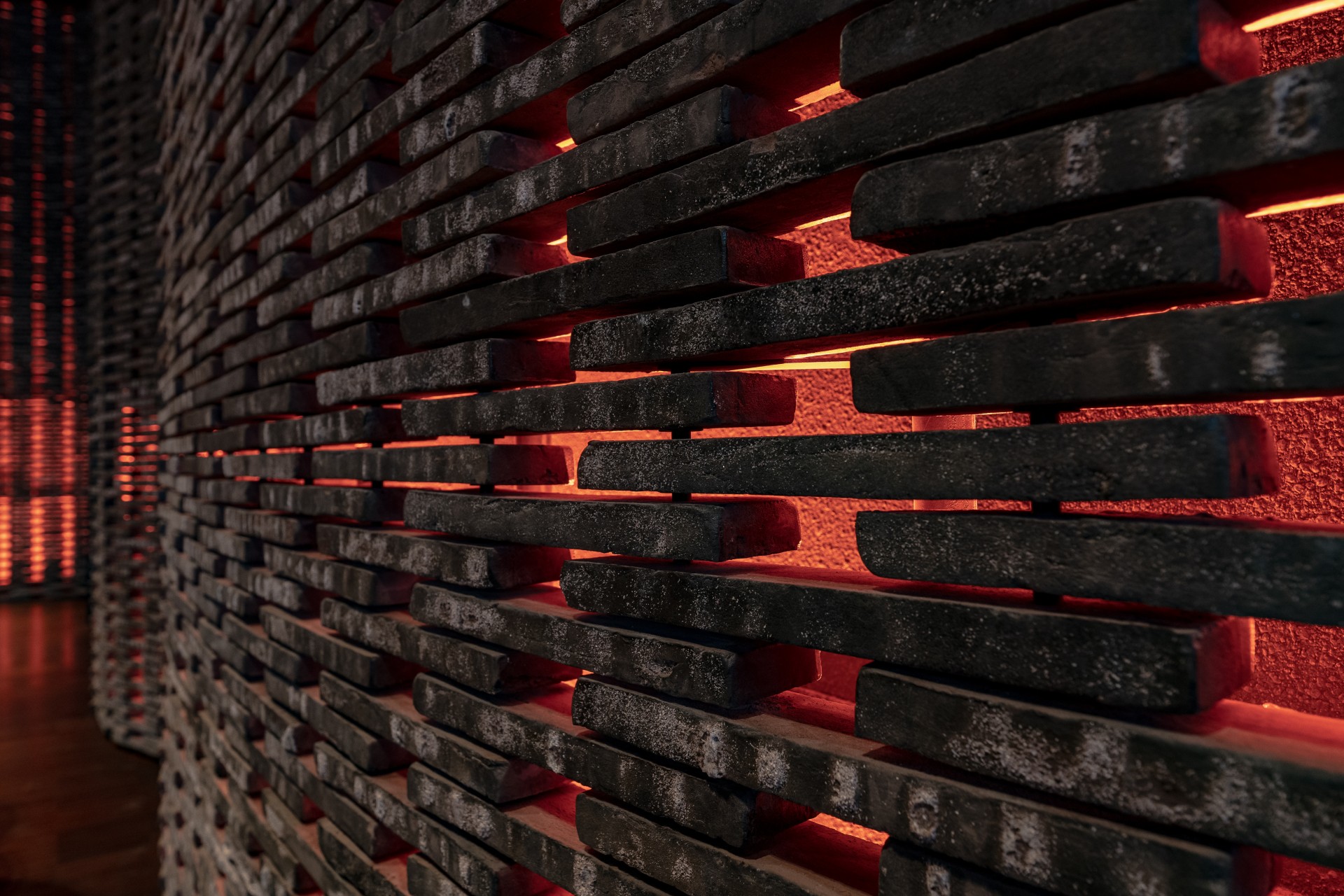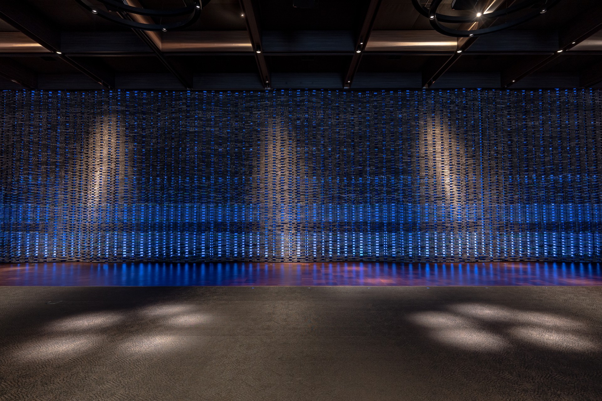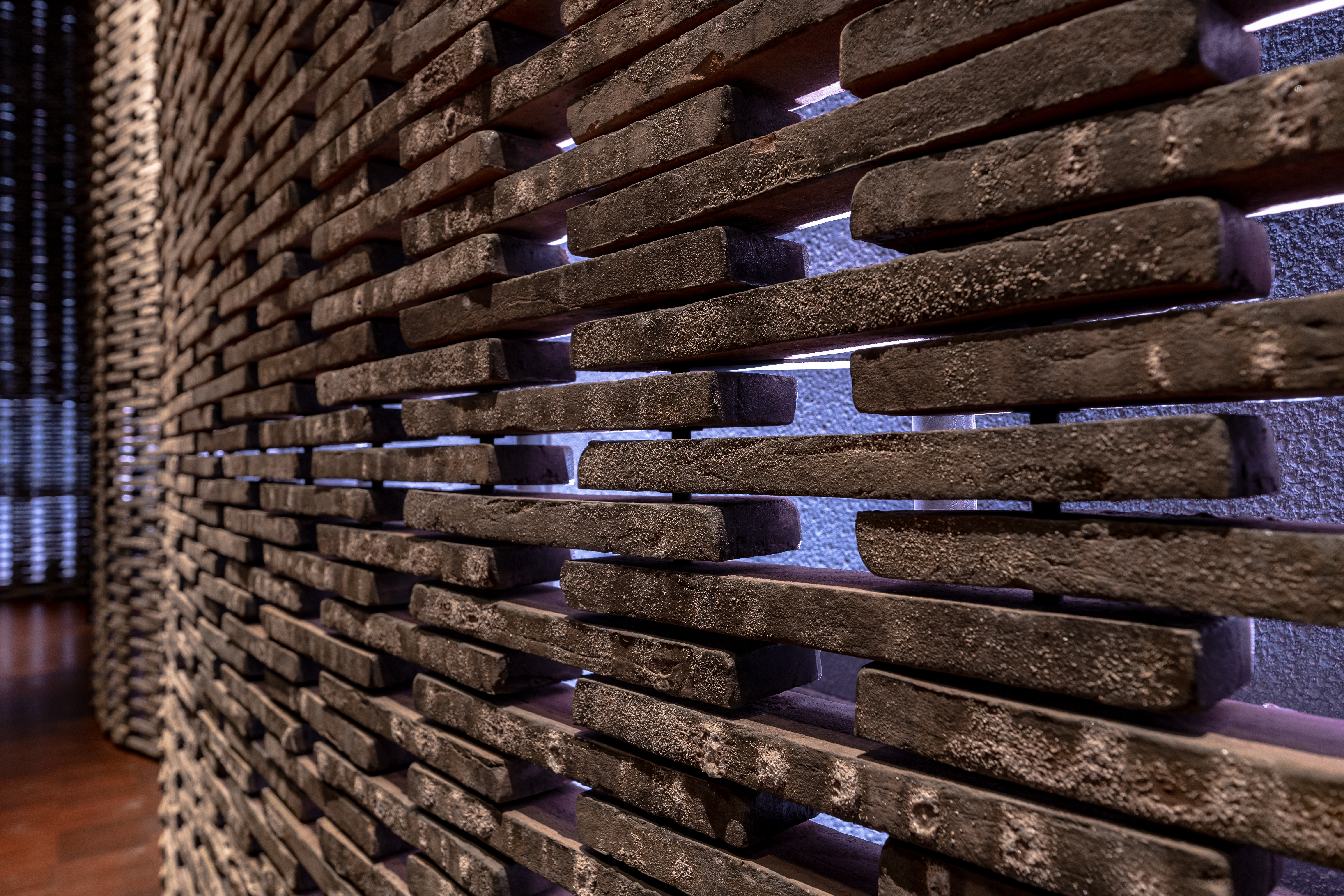 Цей івент-хол знаходиться в готельному комплексі преміум-класу біля озера посеред лісу. Покриваючи площу 2 000 квадратних метрів, 28 тонн цегли, нанизані на металеві струни без підтримки, створюють унікальну хвилясту стіну, яку ми використали в якості екрану.