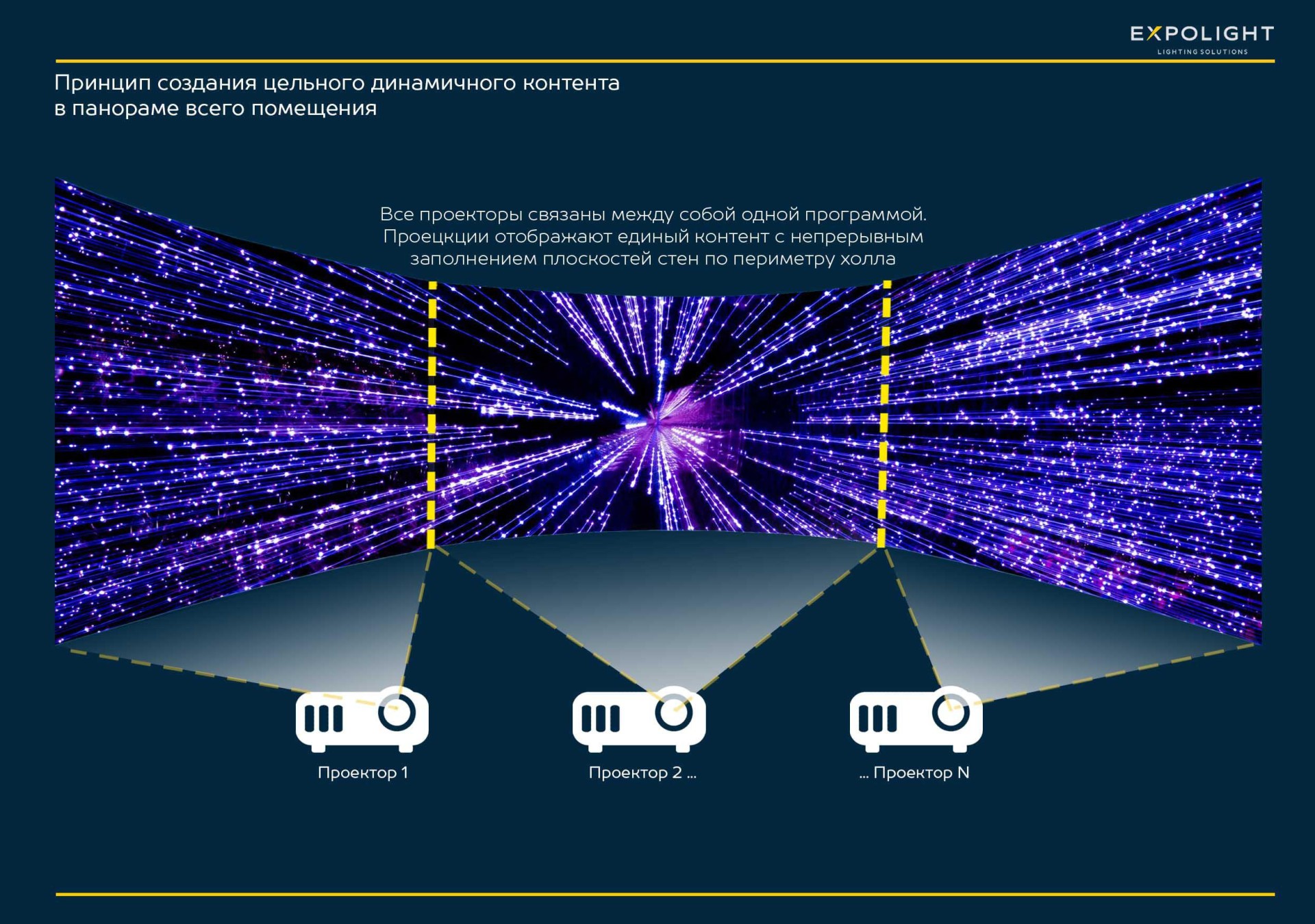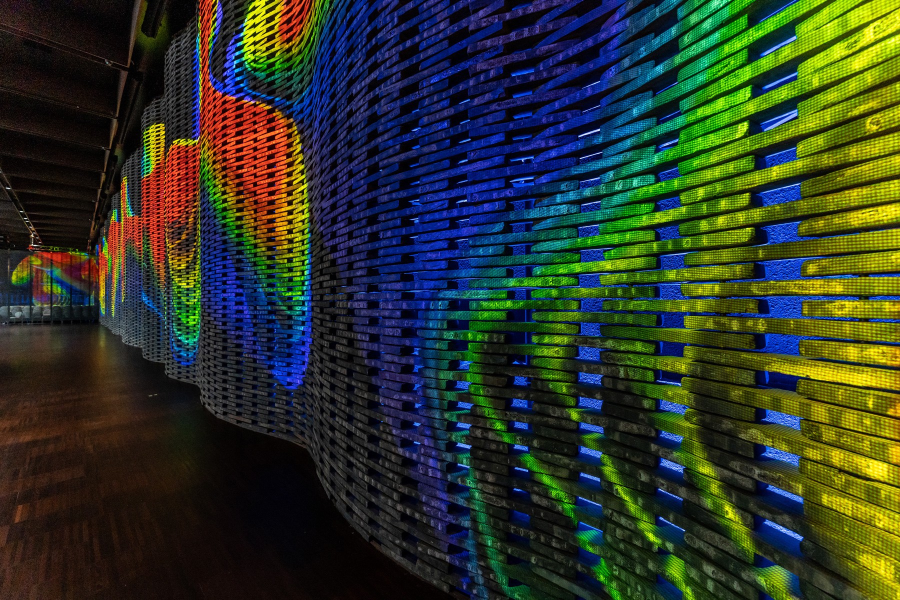 Тридцять вісім лазерних відеопроекторів синхронно транслюють контент, зшитий в одне зображення довжиною 60 метрів і висотою 7 метрів. Ускладнювало роботу те, що це не проекція на плоский екран. Тут ми працювали з цегляним "екраном" - сітчастою стіною, де цегла укладена амплітудними хвилями.