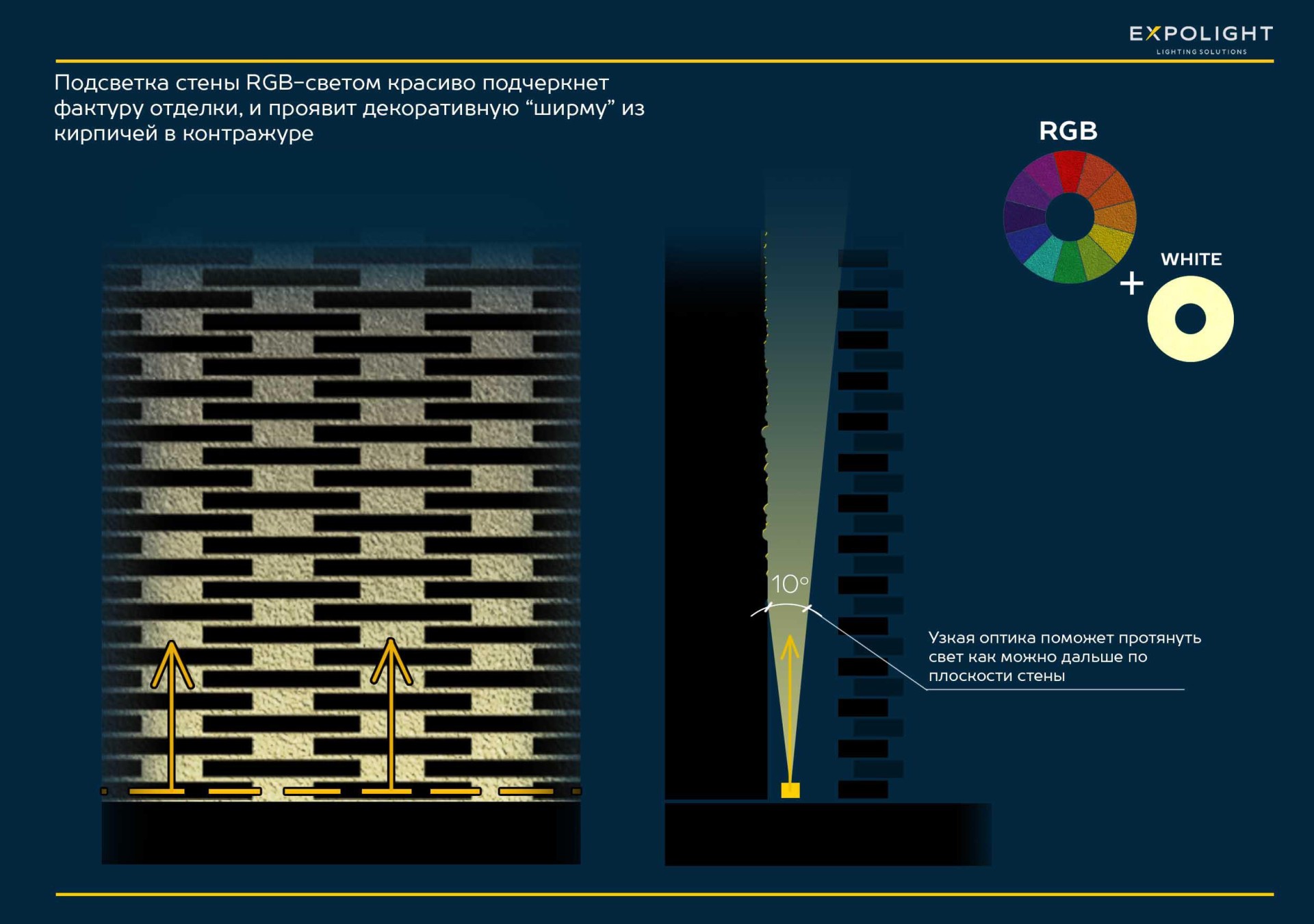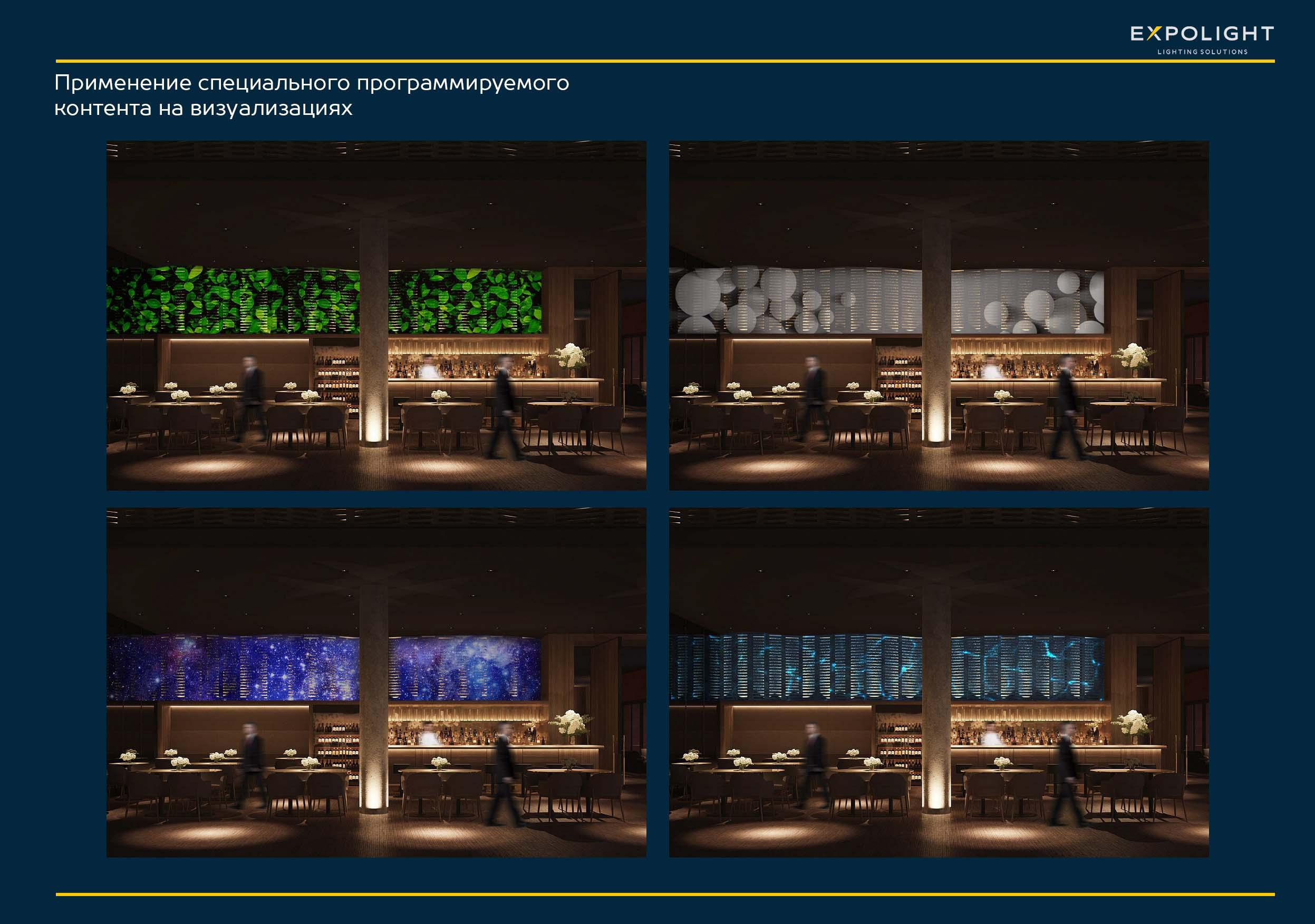 Спеціально для цього проекту ми розробили десятки тематичних і різноманітних контентів: сезонні, святкові, мистецькі та індивідуальні події. Фронтальна і тильна підсвітка цегляного екрану ідеально адаптована до будь-якої події. За бажанням можна підсвічувати стіну різними кольорами замість статичного та динамічного контенту.
