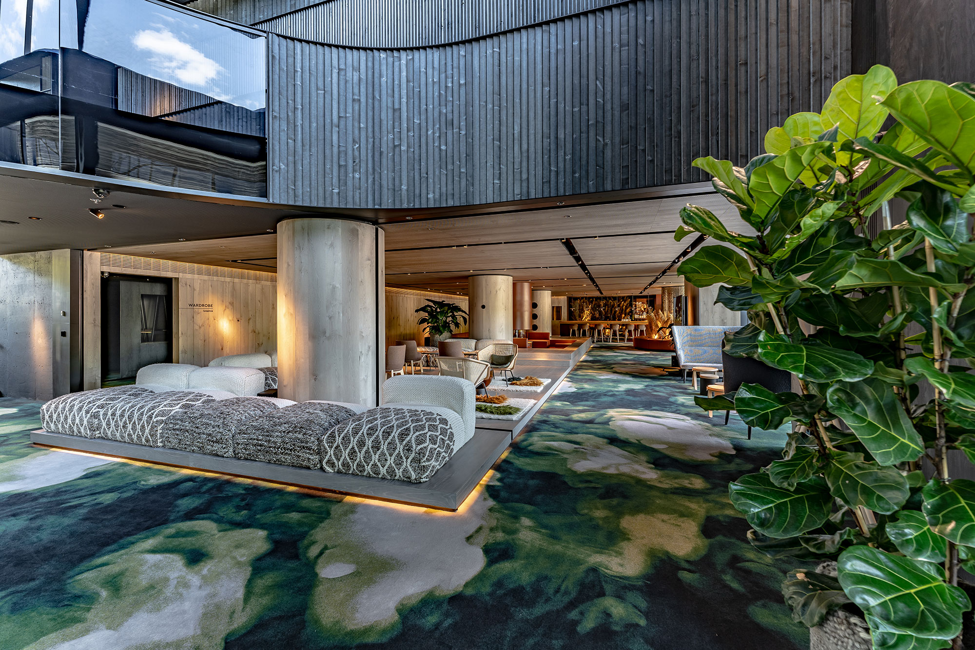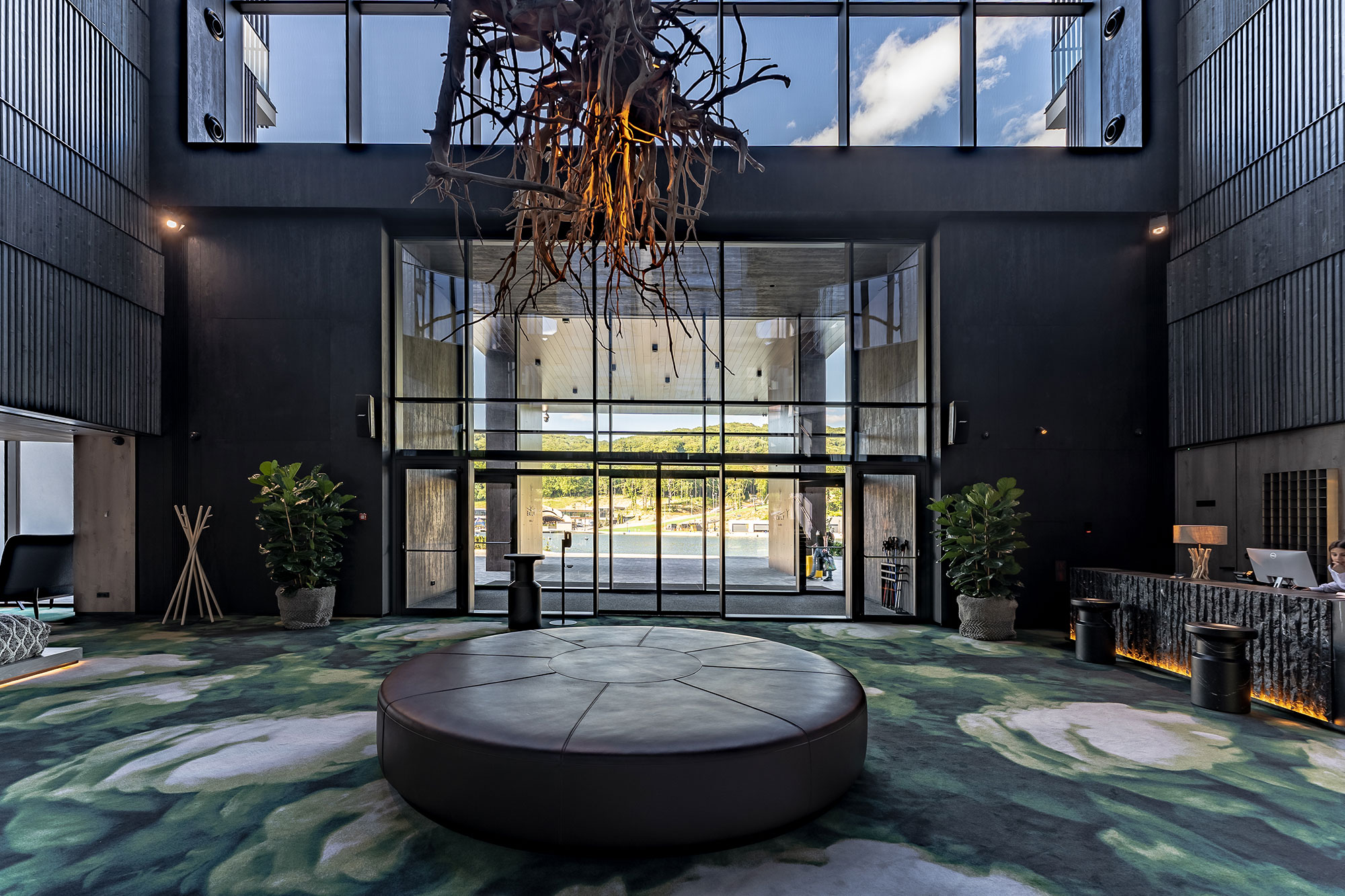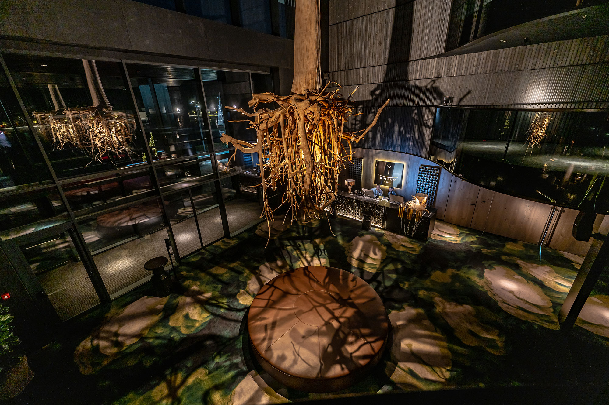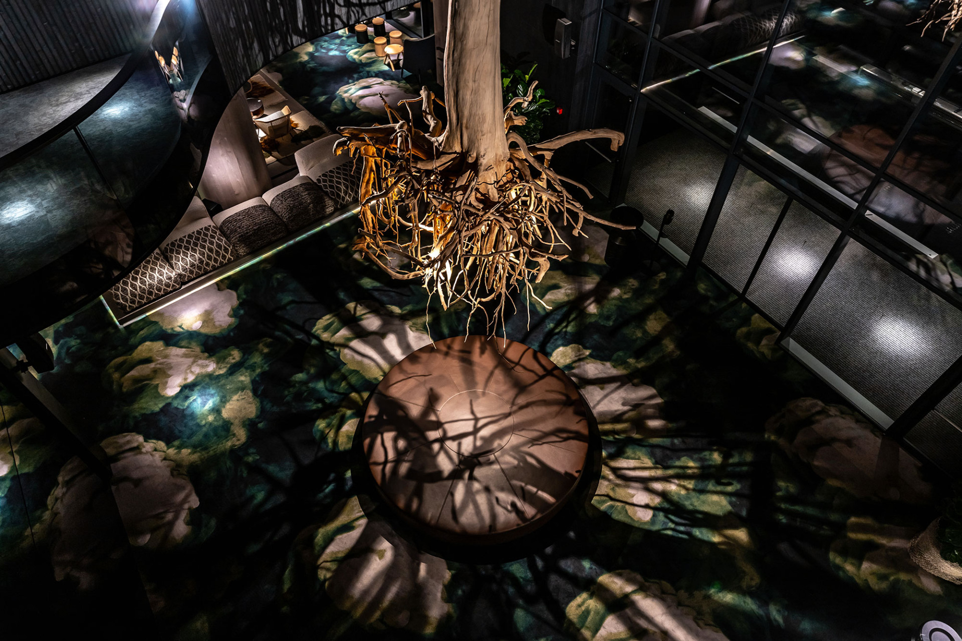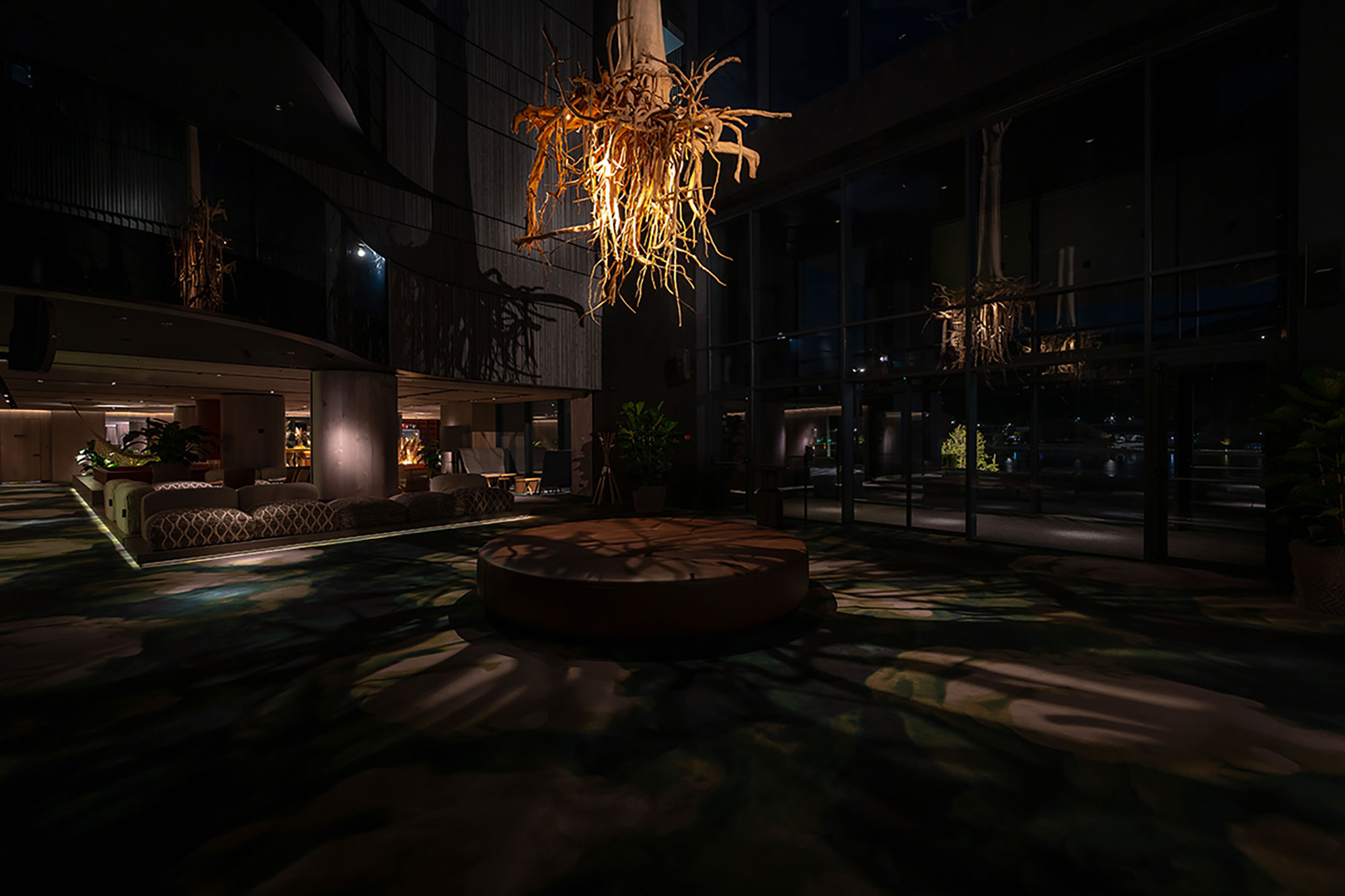 Для цього нам прийшлось спеціально розробити та виготовити індивідуальні світильники декількох типів, які приховані в непомітних не випадкових місцях стін, стелі і навіть заховані у довгих коренях дерева, лінзи та вторинні світлоформуючі аксесуари, щоб світлом намалювати контрастні тіні на стінах та на підлозі, доповнюючі природну атмосферу лоббі. Окрім цього ми зробили, щоб дерево відображалося у темному склі, таким чином ця приголомшлива скульптура наче помножувалася на декілька своїх копій завдяки грі світла, тіней та відображення.