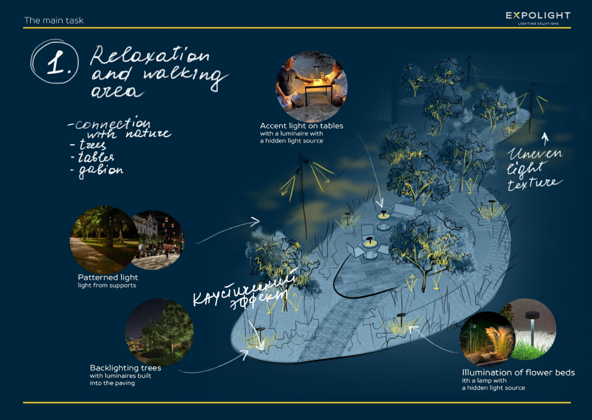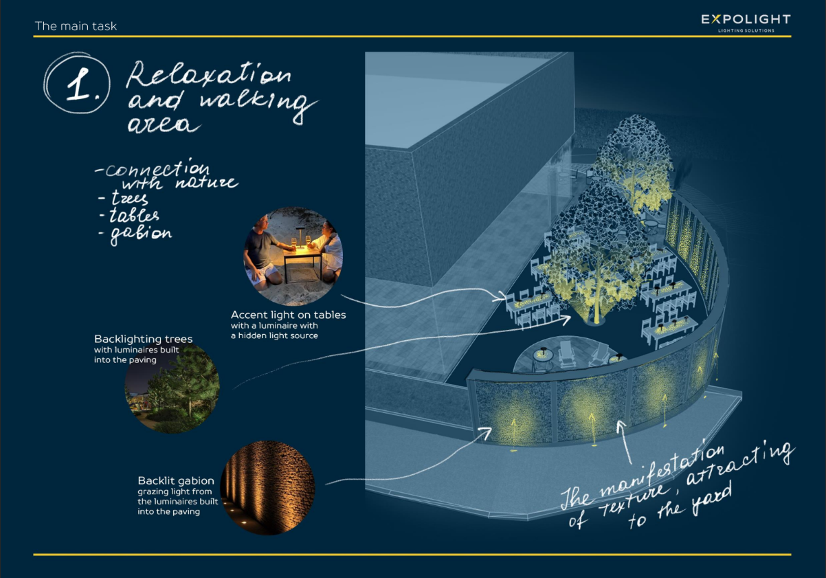 Після численних експериментів в офісі, для цього об’єкту ми розробили і створили наші крафтові тіньові світильники, які посилюють наближення до природи, екологічність та затишність, завдяки світло-тіньовим ефектам. Для нас завжди цікаво та приємно експериментувати з трафаретами та патернами, оскільки в результаті ми отримуємо ті самі природні нерівномірні світлові плями.